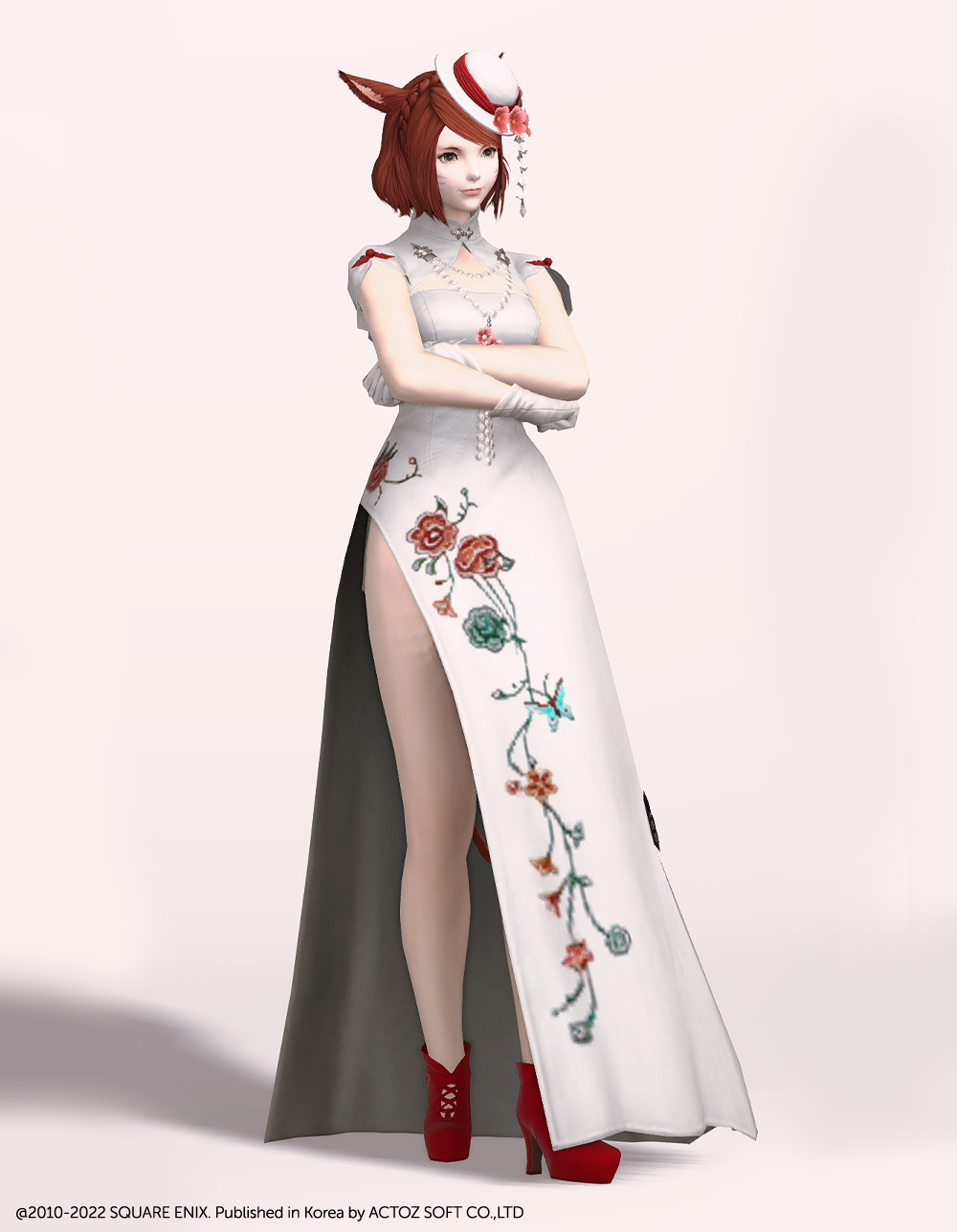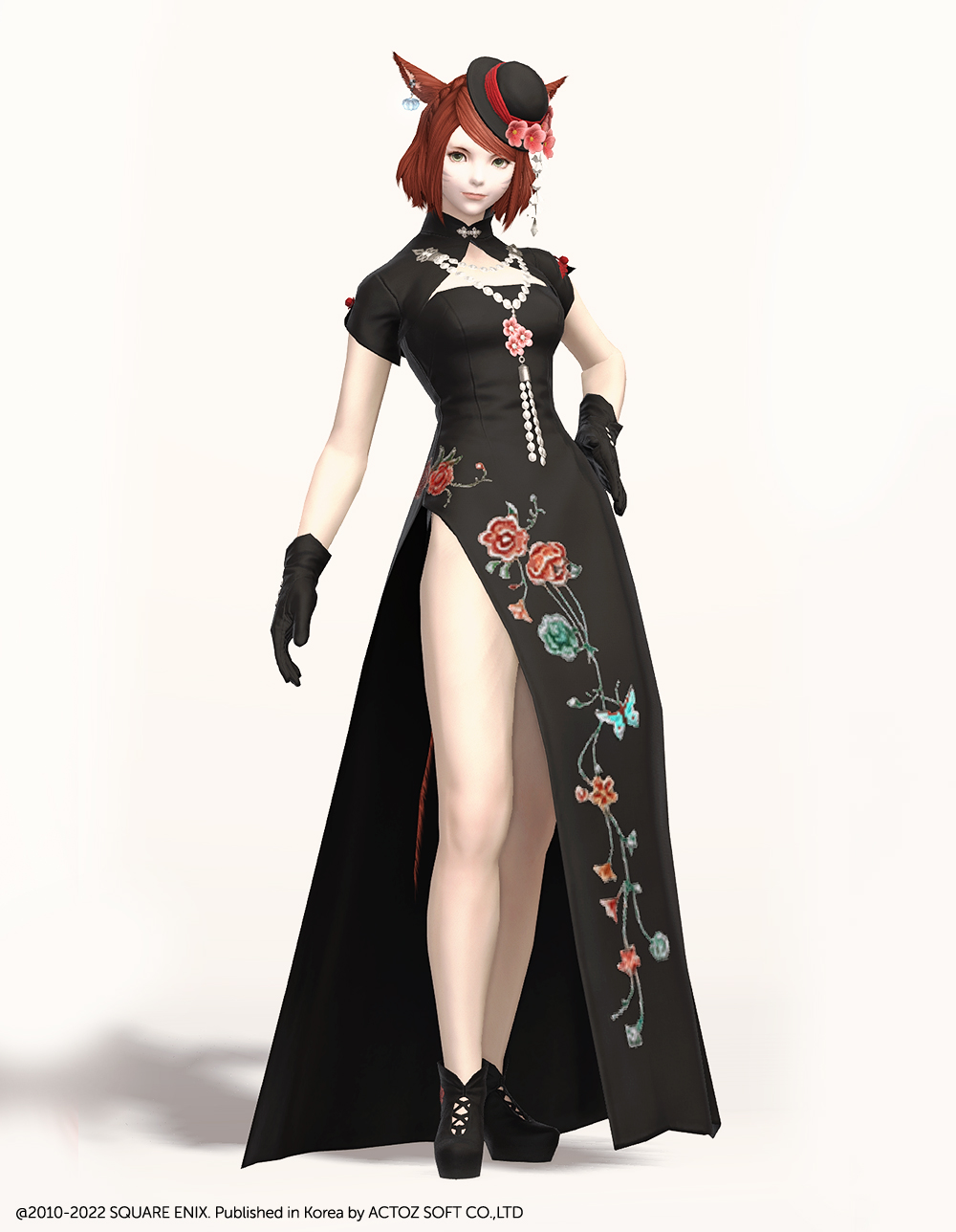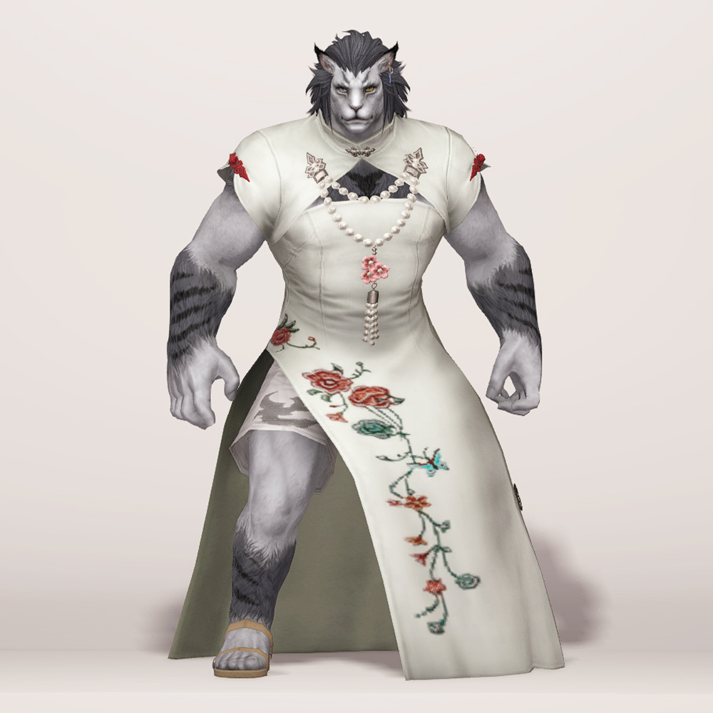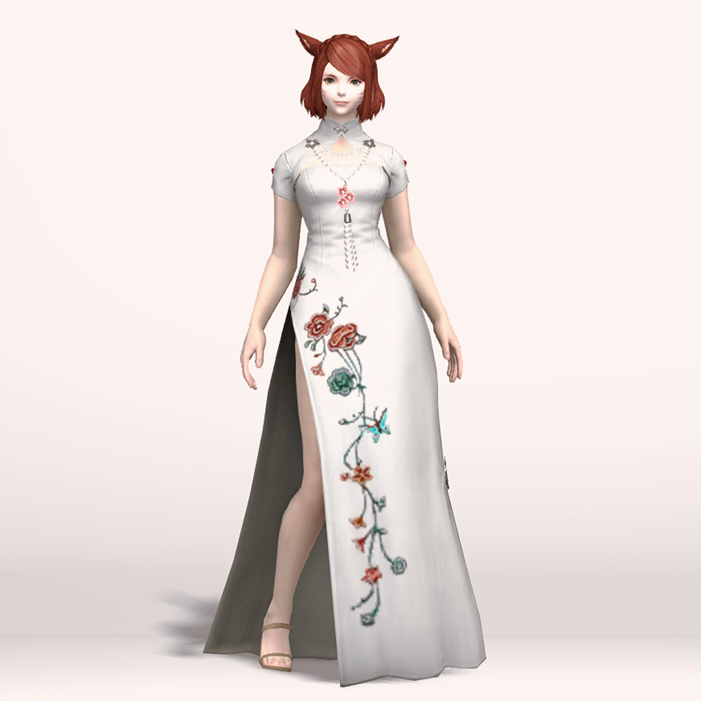 호화롭고 디테일한 자수로 멋을 낸 모던한 느낌의 롱치파오 원피스입니다. 가슴과 등이 과감하게 노출되어 있는 백리스로 크롭 볼레로 재킷을 걸쳤습니다. 진주처럼 예쁘게 빛나는 장식들이 포인트로 들어가 전체적으로 고급스러우면서도 기품 있습니다.
