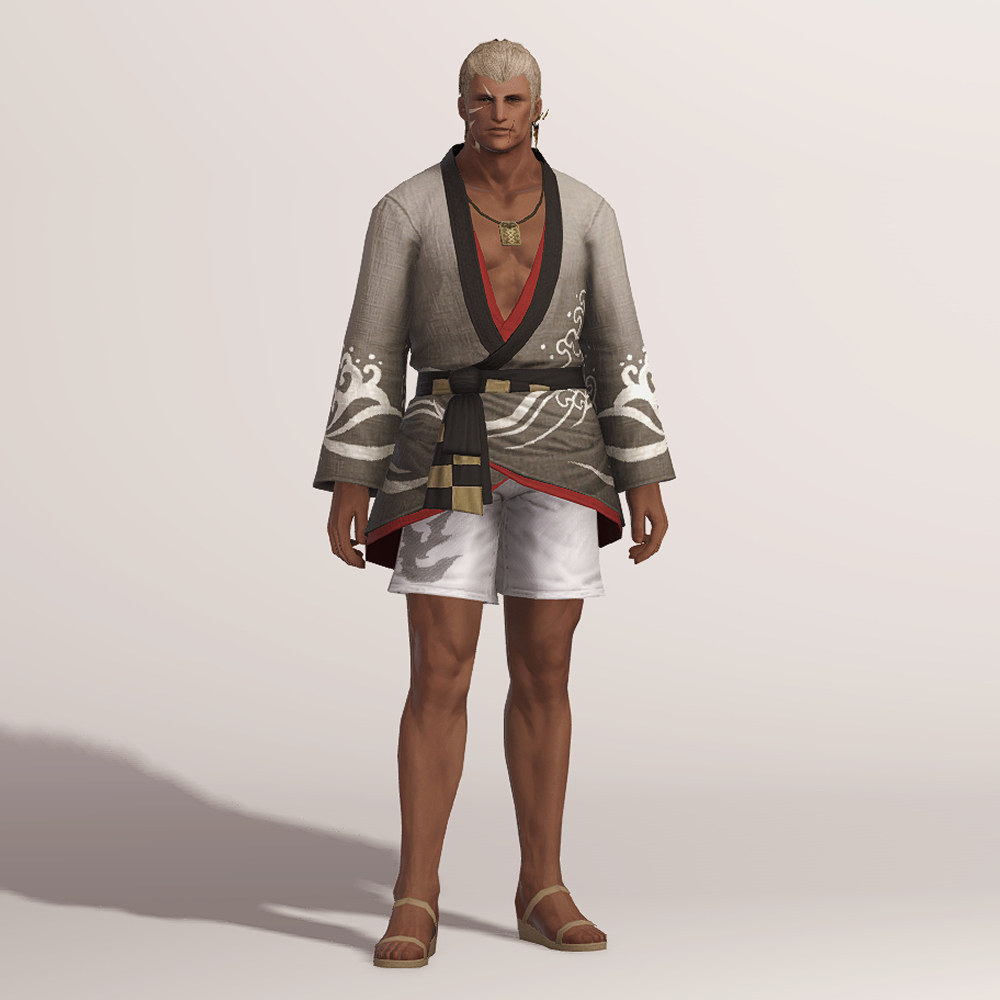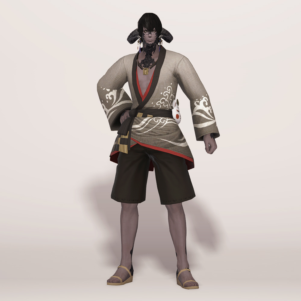 검은색보다는 밝은 회색이라는 이름이 어울리는 유카타입니다. 일본풍 특유의 느낌을 살린 흰색 파도 문양과 함께 시원하게 드러낸 가슴이 눈에 띕니다. 나무로 된 오마모리 목걸이와 허리 뒤쪽의 하얀 모그리 가면 장식이 포인트로 남성용 잠방이와 모그리/나마즈오 가면과 매치하면 예쁜 여름축제 코디가 완성됩니다.