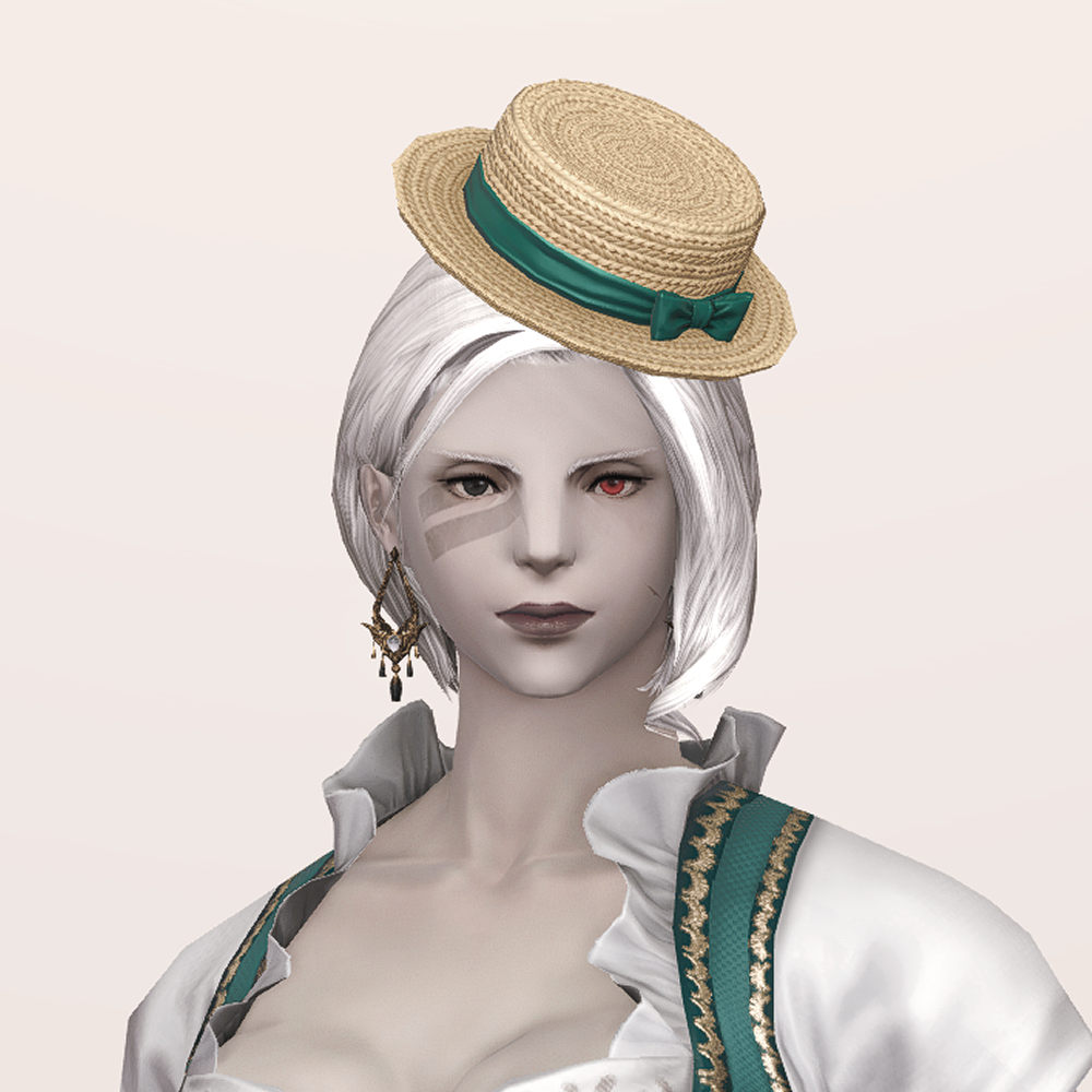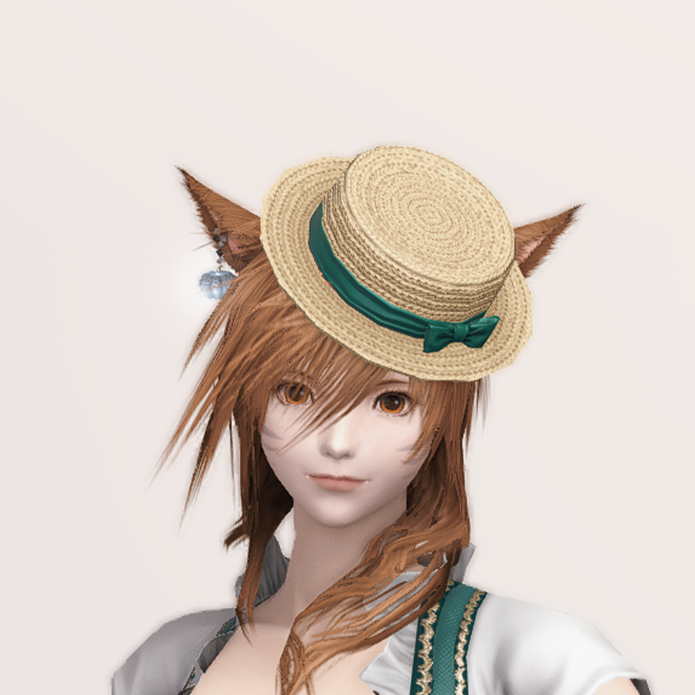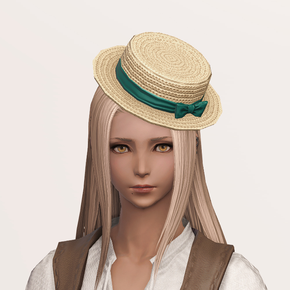 밀짚으로 만들어 리본으로 포인트를 준 귀여운 캉캉 모자입니다. 일반적인 모자와 다르게 살짝 걸쳐 비스듬히 씁니다. 개척자 드레스와 매치하면 잘 어울려 추천드립니다.