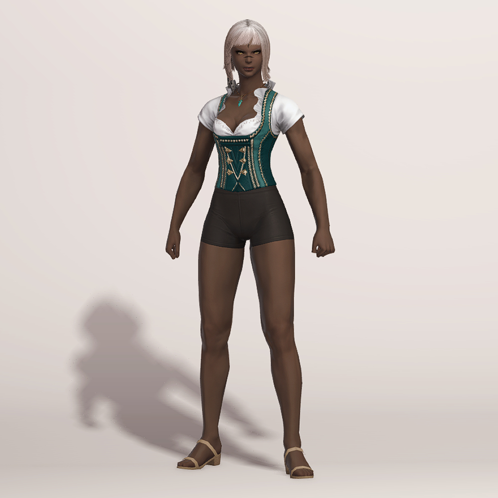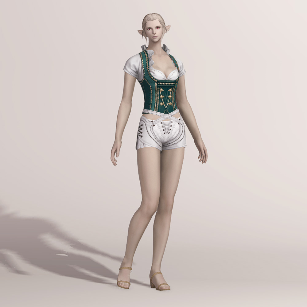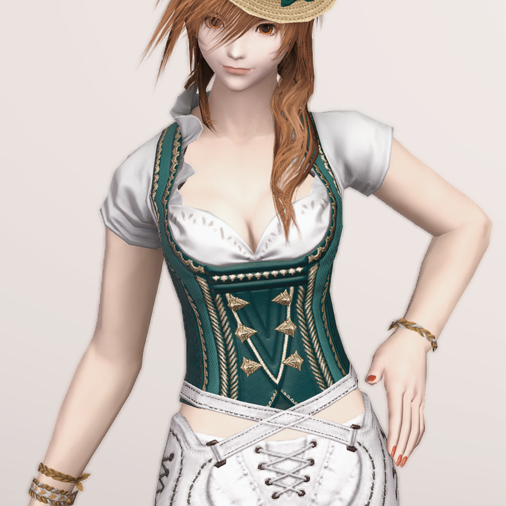 오스트리아 알프스 산간 지방의 민속 의상인 던들을 베이스로 만들어진 상의입니다. 녹색과 흰색 원단으로 조합되어 몸에 딱 맞는 하트넥 캡소매에 화려한 금색 자수를 수놓아 전체적으로 고급스럽습니다. 디자인이 워낙 예쁘게 잘 나와 다양하게 활용할 수 있습니다.