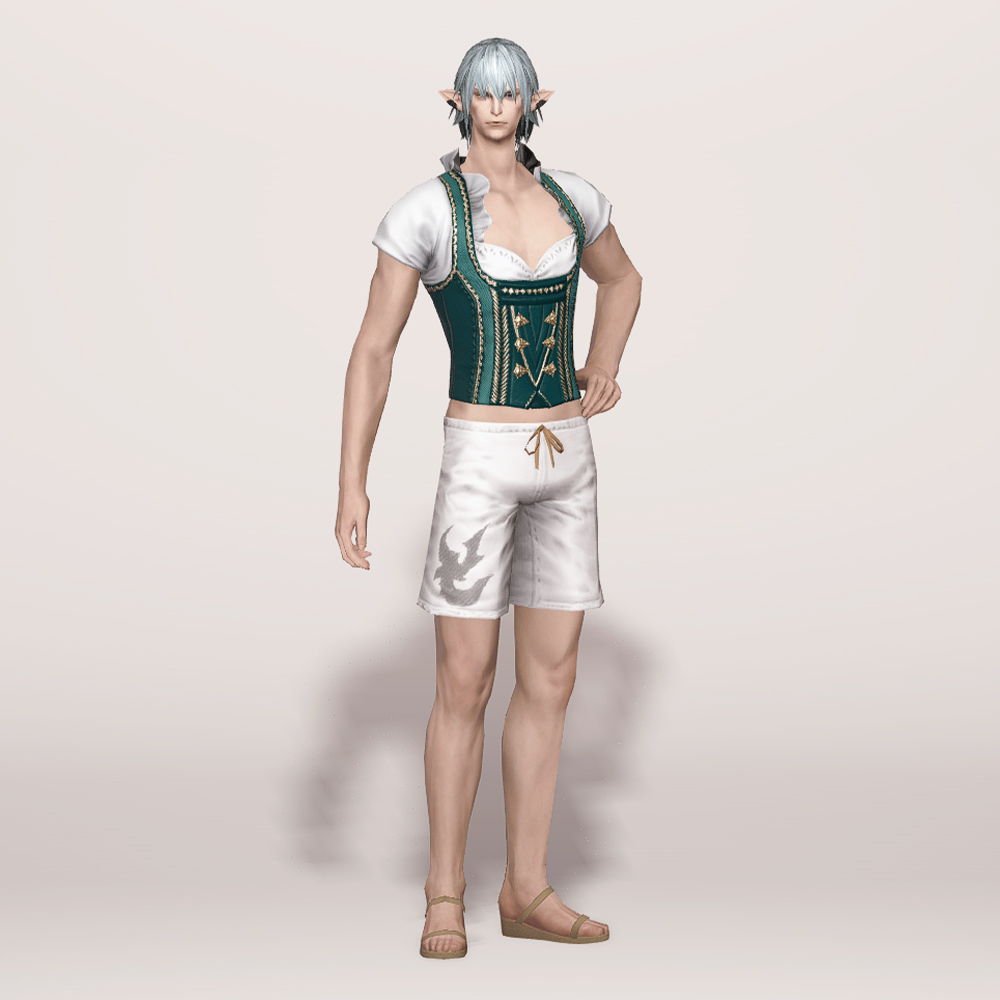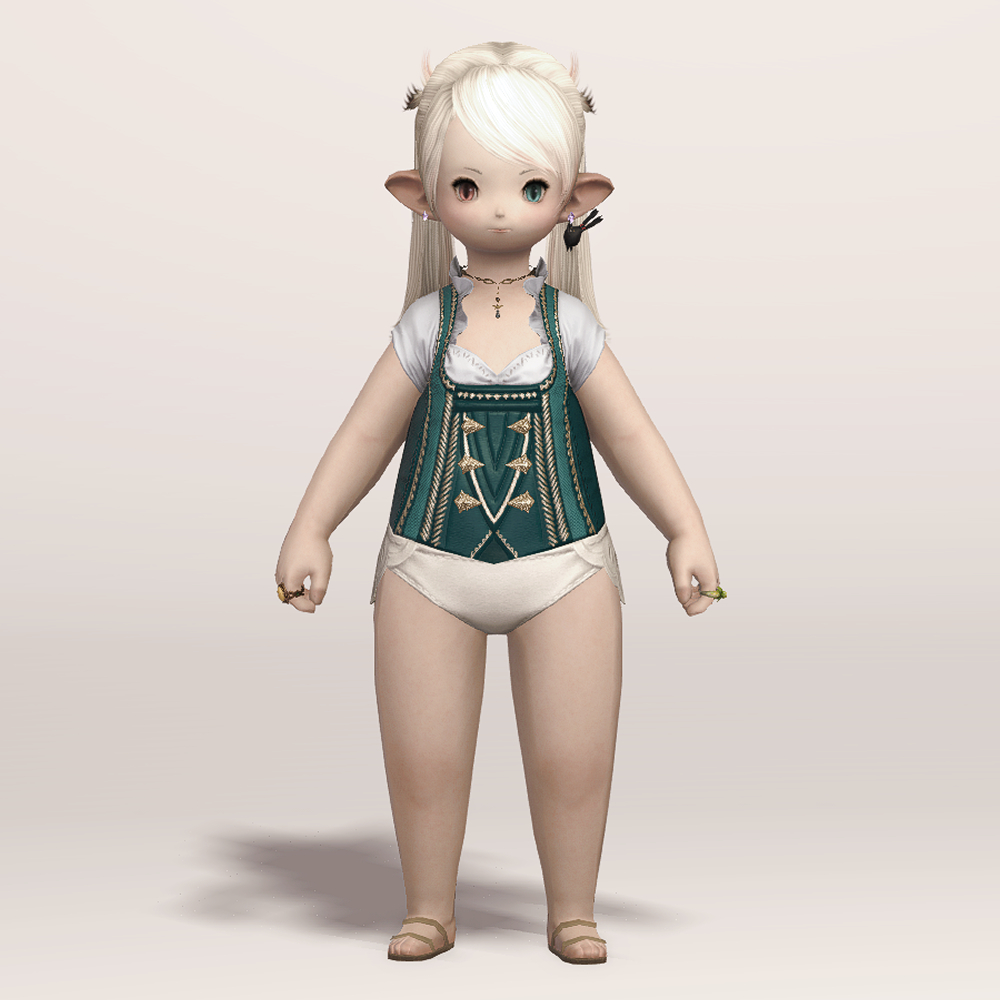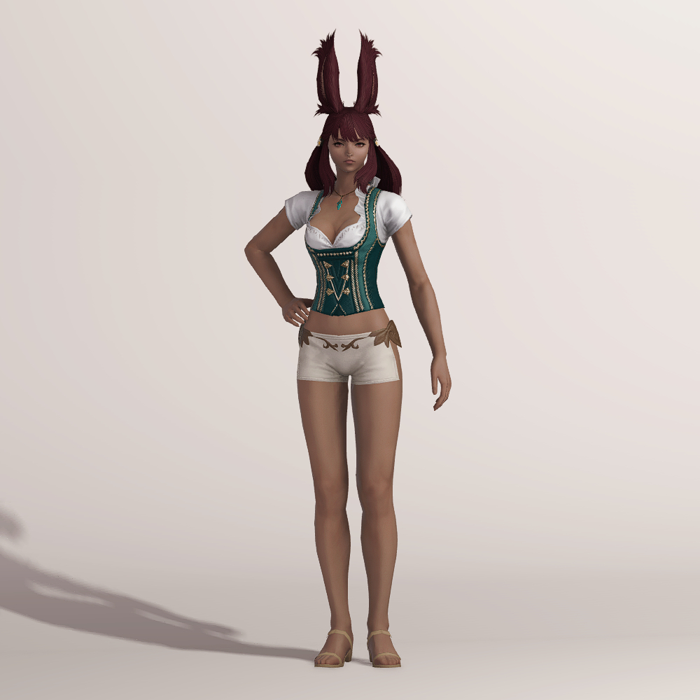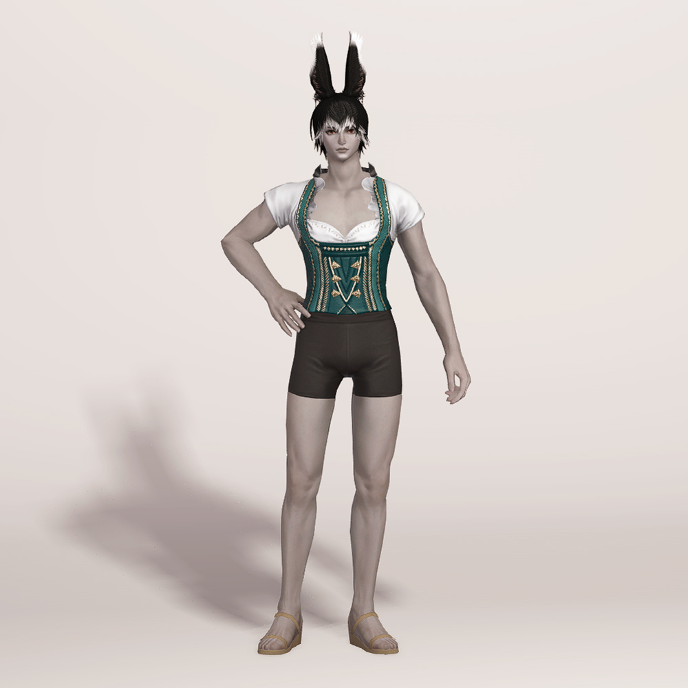 오스트리아 알프스 산간 지방의 민속 의상인 던들을 베이스로 만들어진 상의입니다. 녹색과 흰색 원단으로 조합되어 몸에 딱 맞는 하트넥 캡소매에 화려한 금색 자수를 수놓아 전체적으로 고급스럽습니다. 디자인이 워낙 예쁘게 잘 나와 다양하게 활용할 수 있습니다.