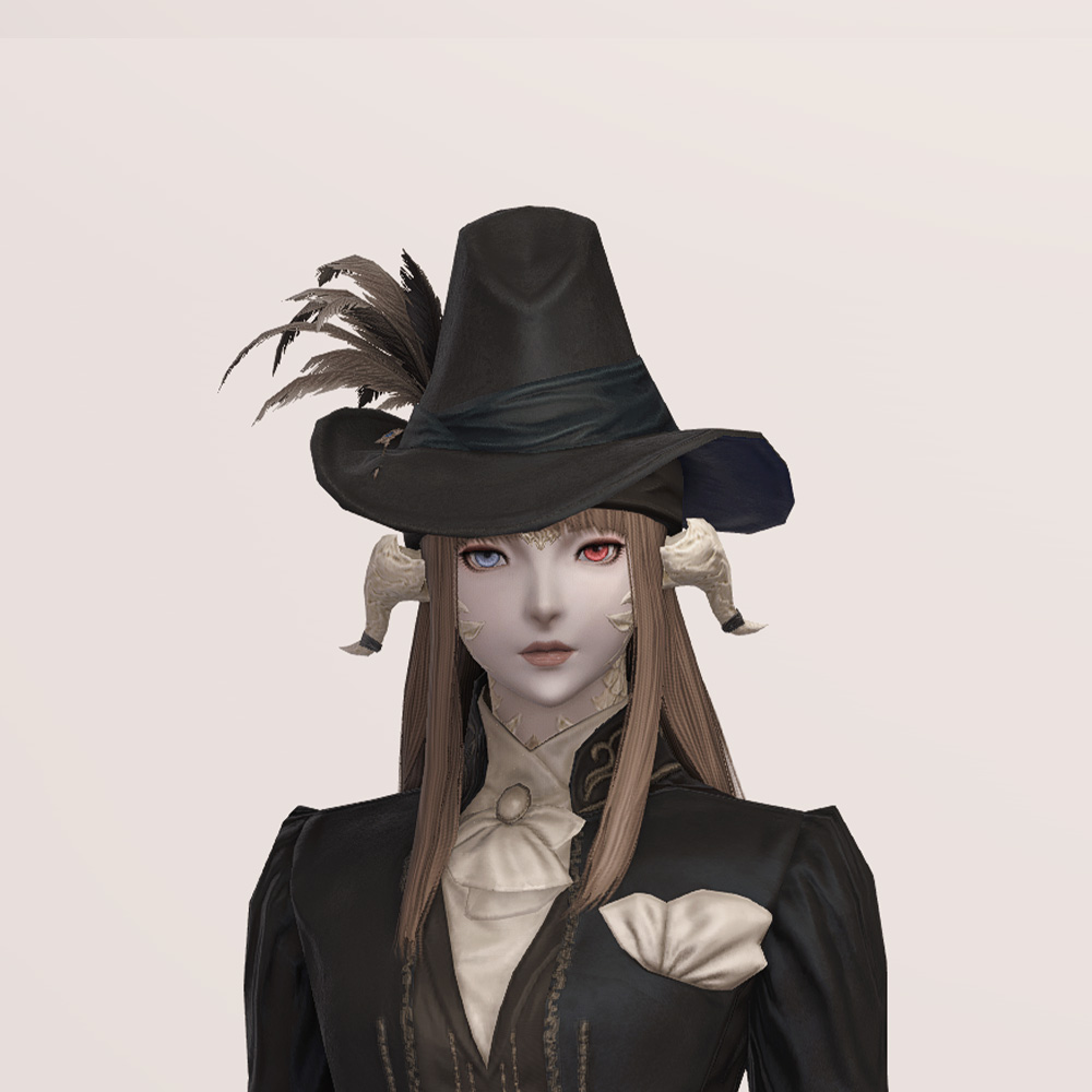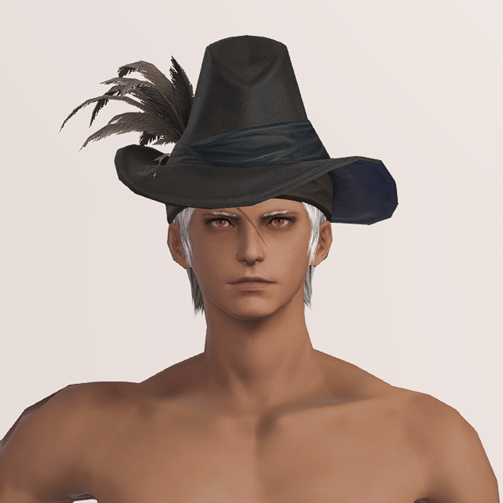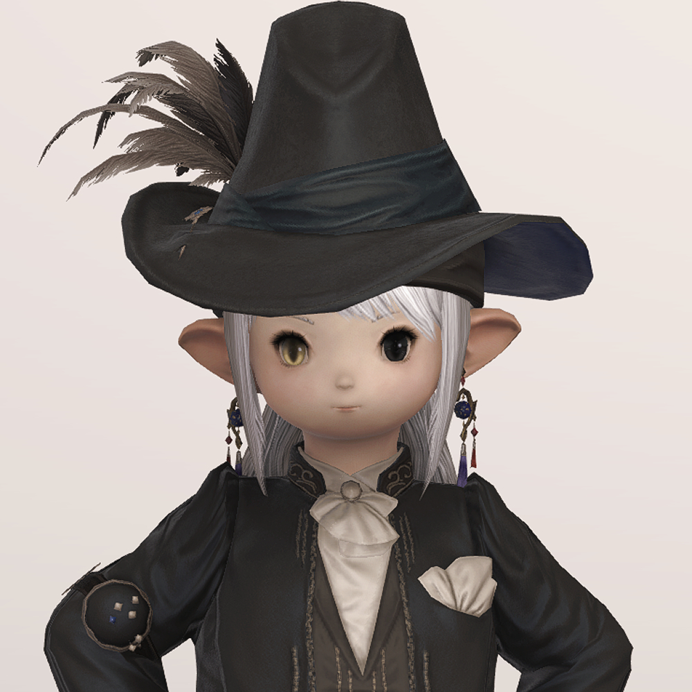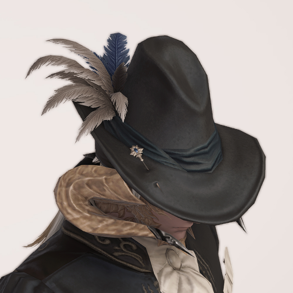 포인트로 깃털이 꽂혀져 있는 실크햇 느낌의 중절모입니다. 재봉사 아니랄까 봐 보는 사람을 기준으로 왼쪽에 장인이 쓸법한 느낌의 고급스러운 바늘이 꽂혀져 있습니다. 뒤에서 보면 버클이 달려있어 마녀 모자가 떠오릅니다.