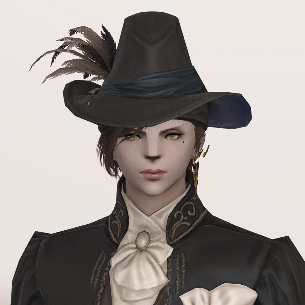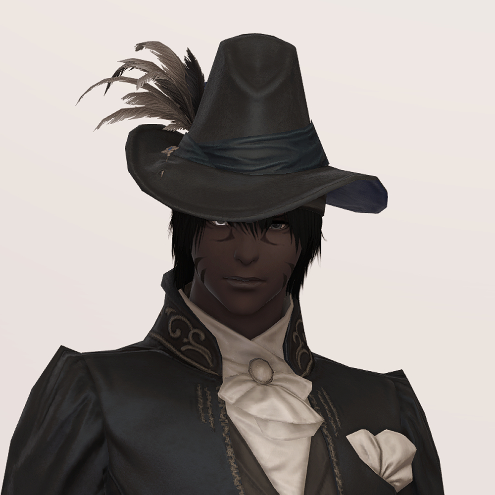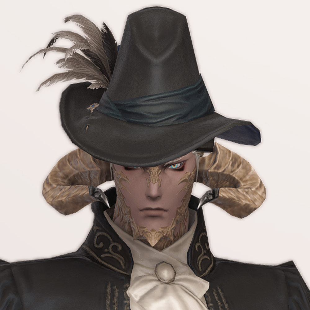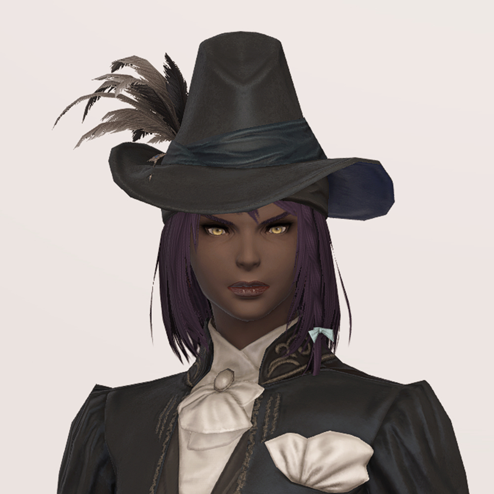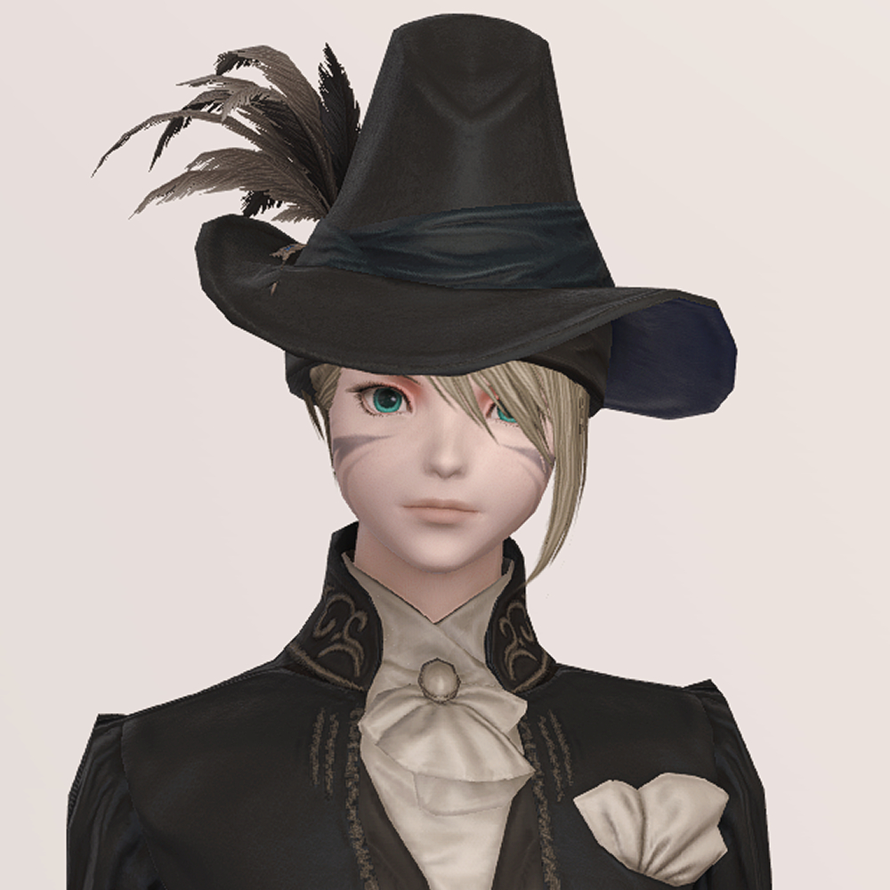 포인트로 깃털이 꽂혀져 있는 실크햇 느낌의 중절모입니다. 재봉사 아니랄까 봐 보는 사람을 기준으로 왼쪽에 장인이 쓸법한 느낌의 고급스러운 바늘이 꽂혀져 있습니다. 뒤에서 보면 버클이 달려있어 마녀 모자가 떠오릅니다.