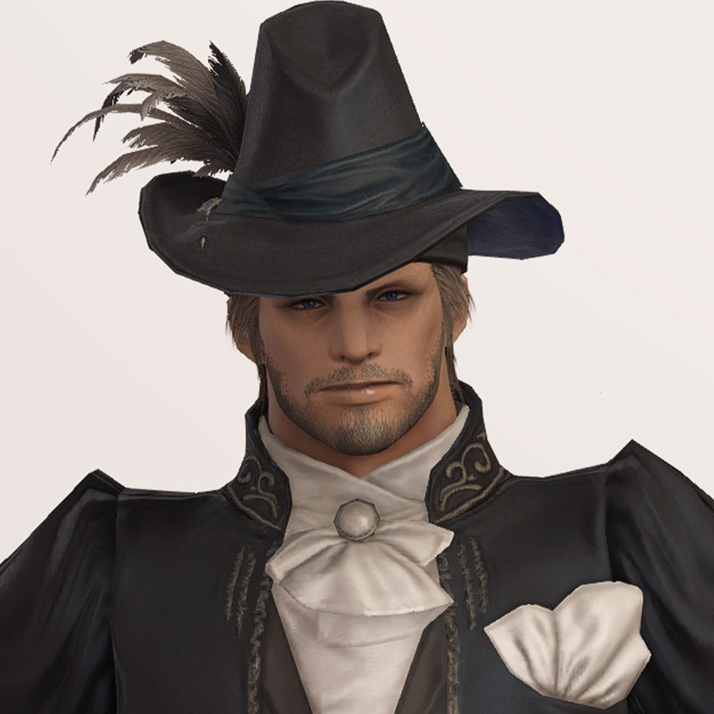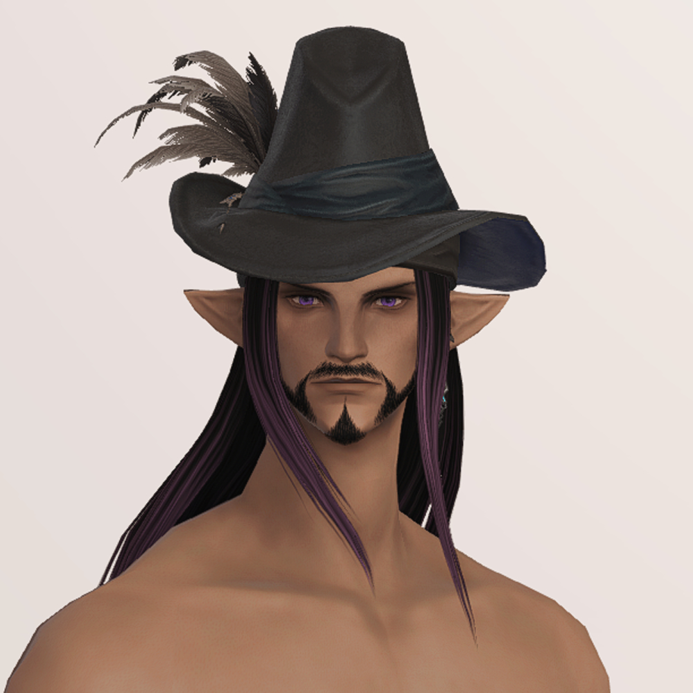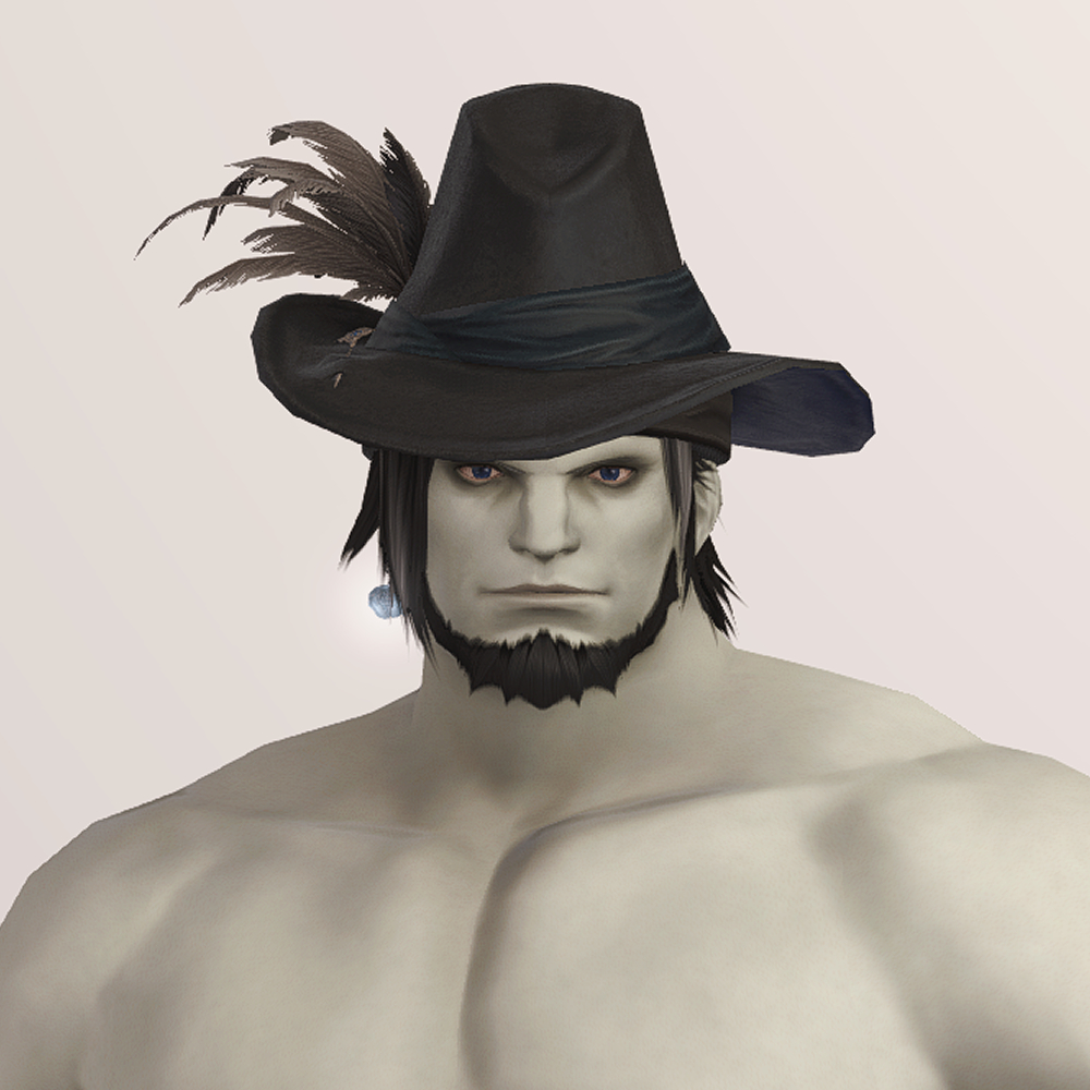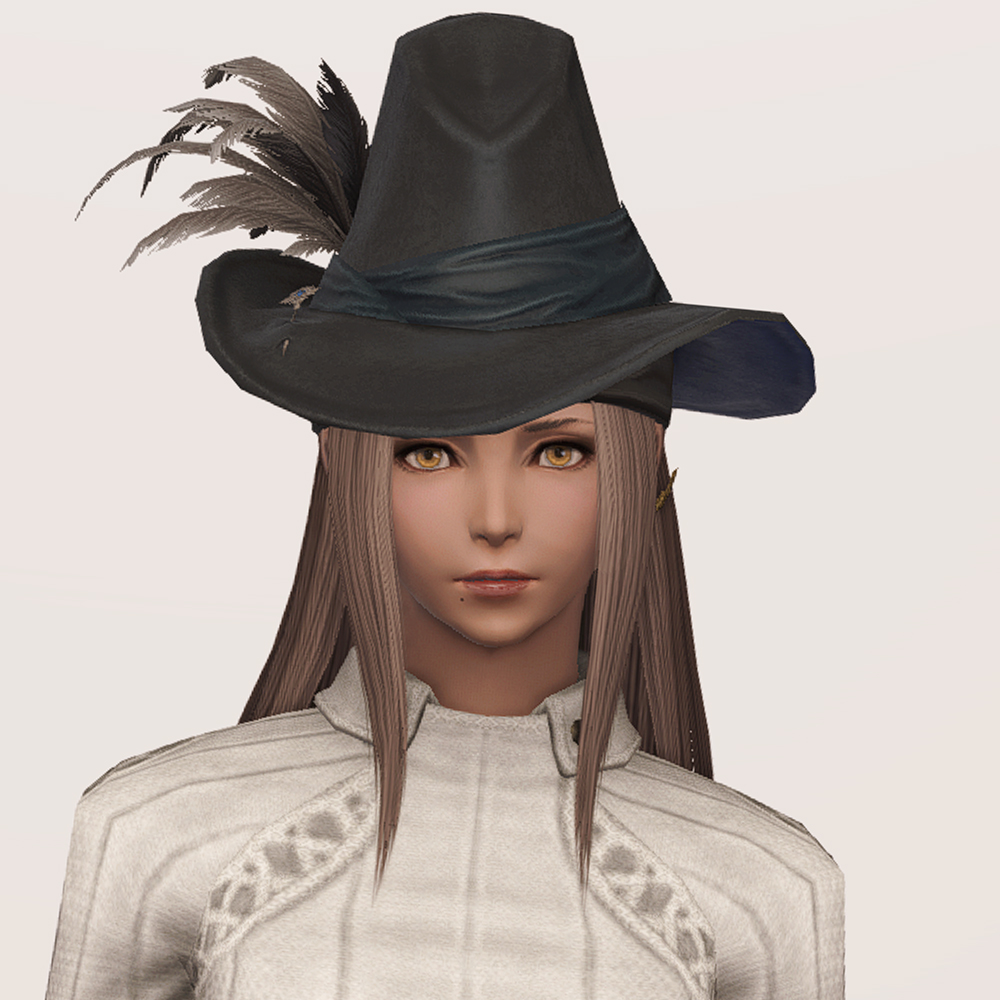 포인트로 깃털이 꽂혀져 있는 실크햇 느낌의 중절모입니다. 재봉사 아니랄까 봐 보는 사람을 기준으로 왼쪽에 장인이 쓸법한 느낌의 고급스러운 바늘이 꽂혀져 있습니다. 뒤에서 보면 버클이 달려있어 마녀 모자가 떠오릅니다.