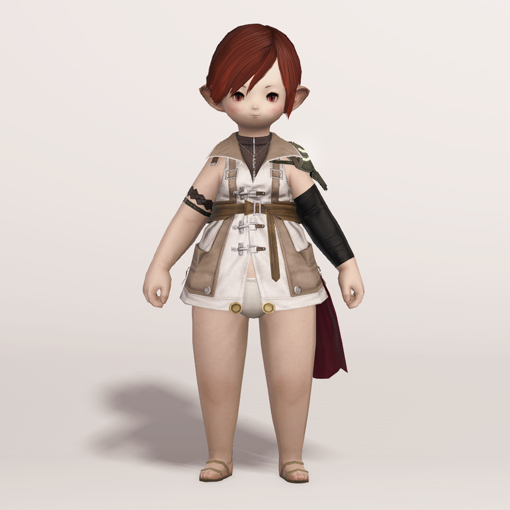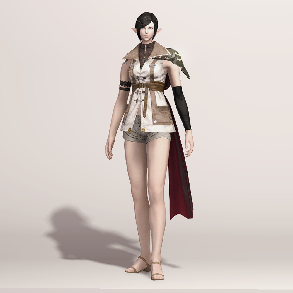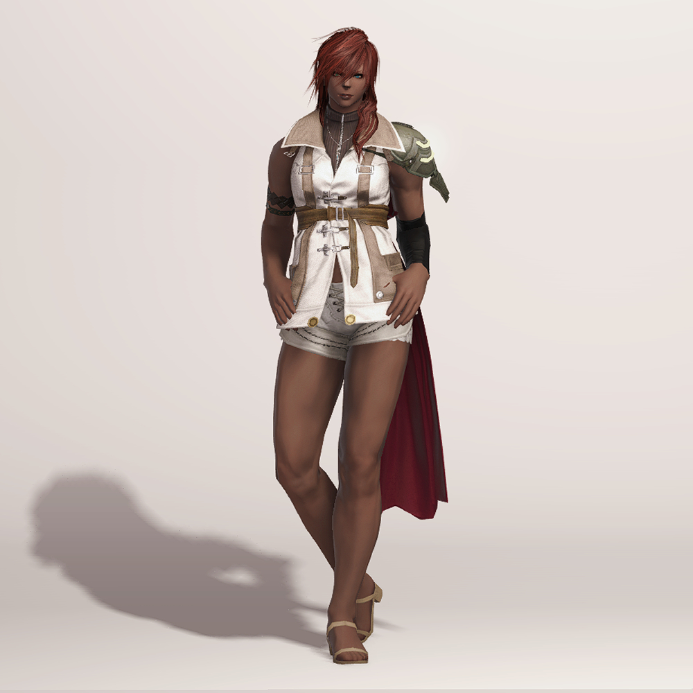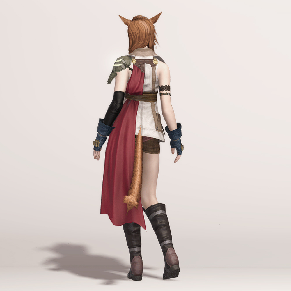 파이널판타지13의 주인공, 라이트닝의 상의입니다. 활동성과 동시에 수납공간을 고려한 매력적인 재킷으로 등에서 시작해 종아리까지 길게 내려오는 붉은 천이 포인트입니다. 보는 사람을 기준으로 왼쪽에는 암밴드, 오른쪽에는 어깨 보호구와 함께 쿨 토시가 눈에 띄며 라이트닝의 상의가 그대로 구현되어 디테일합니다. 동방 술사의 팔장식, 푀부트 치유사 모자 등과 매치하면 잘 어울립니다.