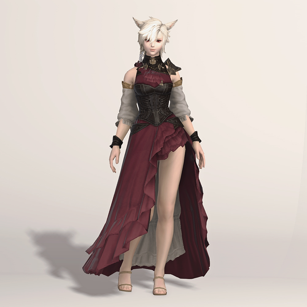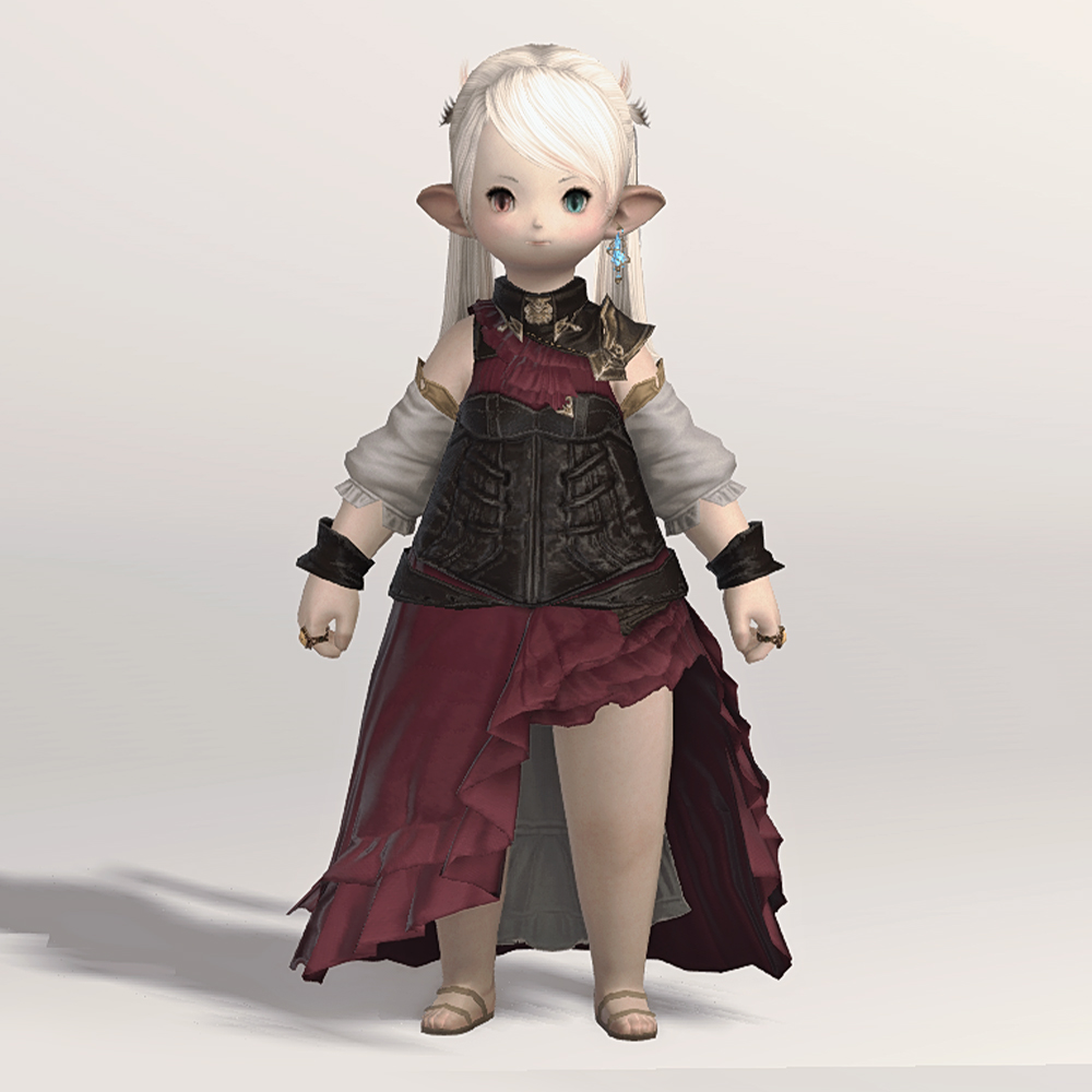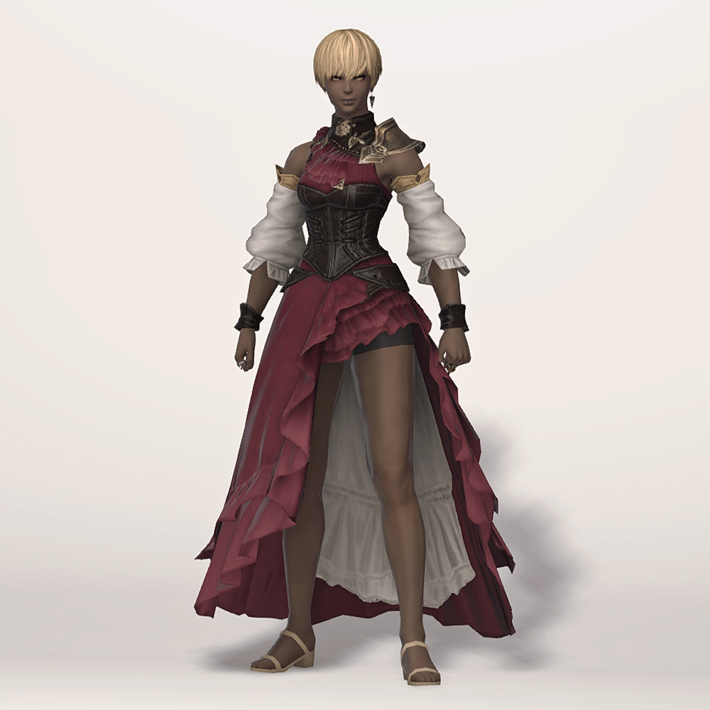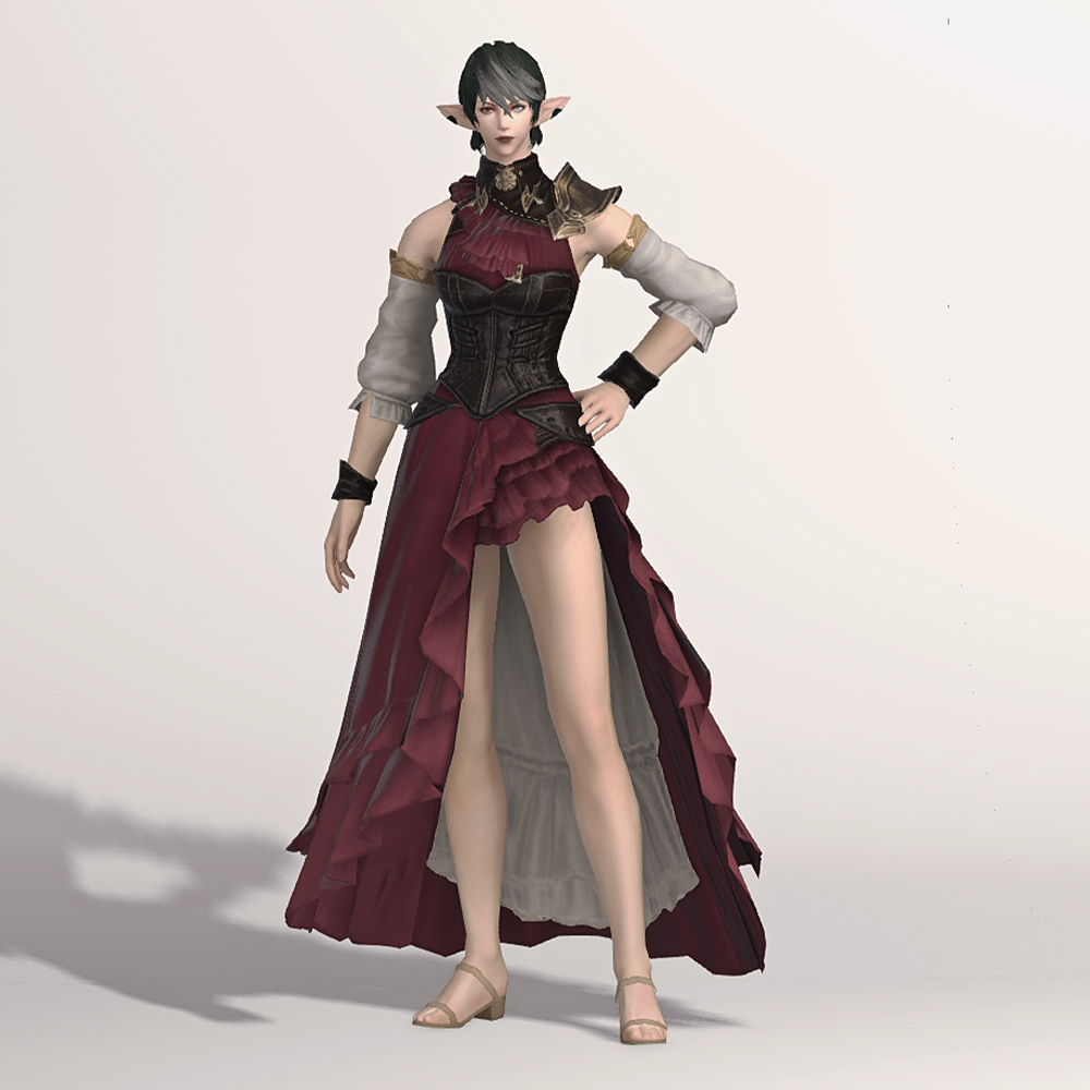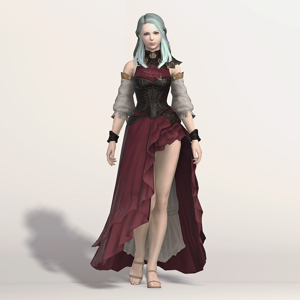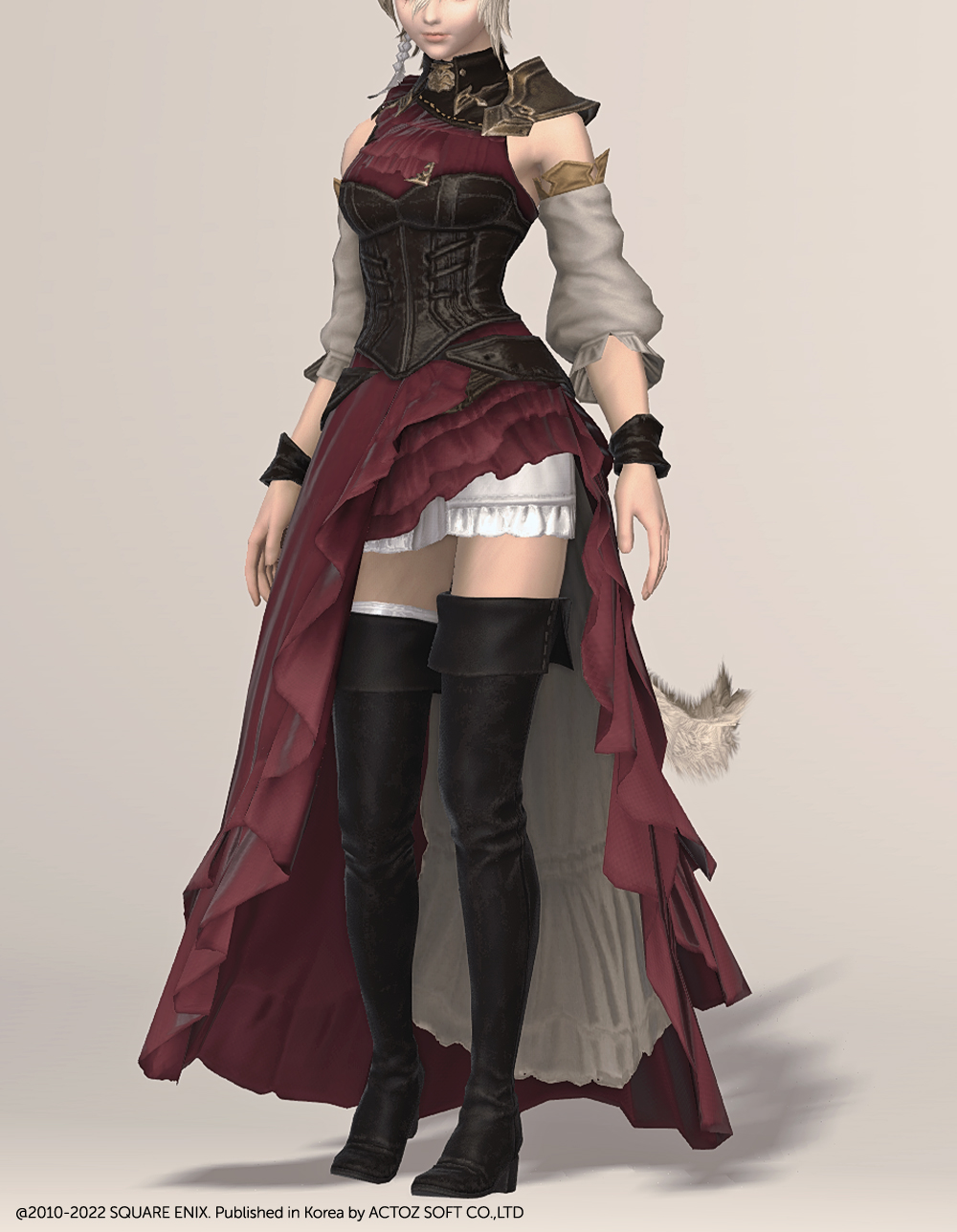 상반신은 깔끔하게 나온 경갑주, 하반신에 사선으로 길게 프릴 스커트가 달려 다리를 드러내는 룩을 조합하기 좋습니다.