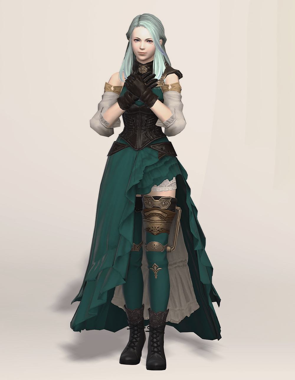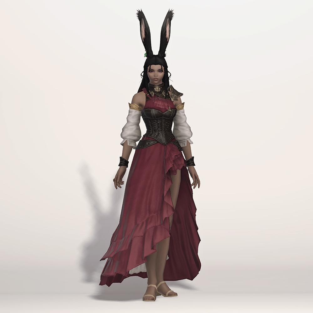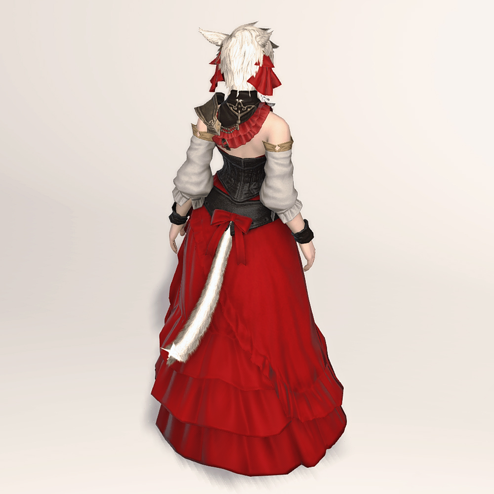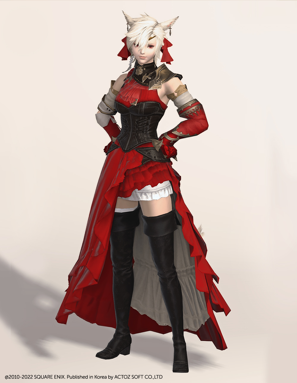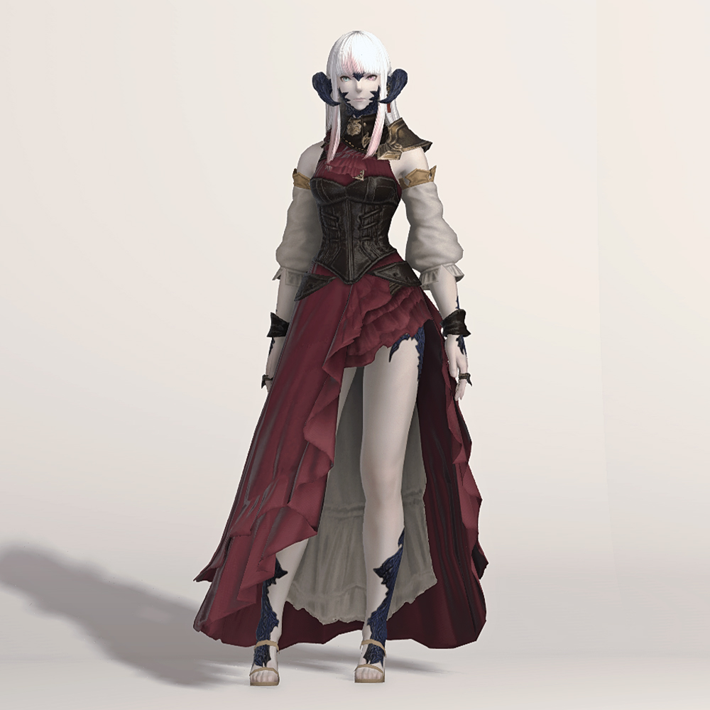 상반신은 깔끔하게 나온 경갑주, 하반신에 사선으로 길게 프릴 스커트가 달려 다리를 드러내는 룩을 조합하기 좋습니다.