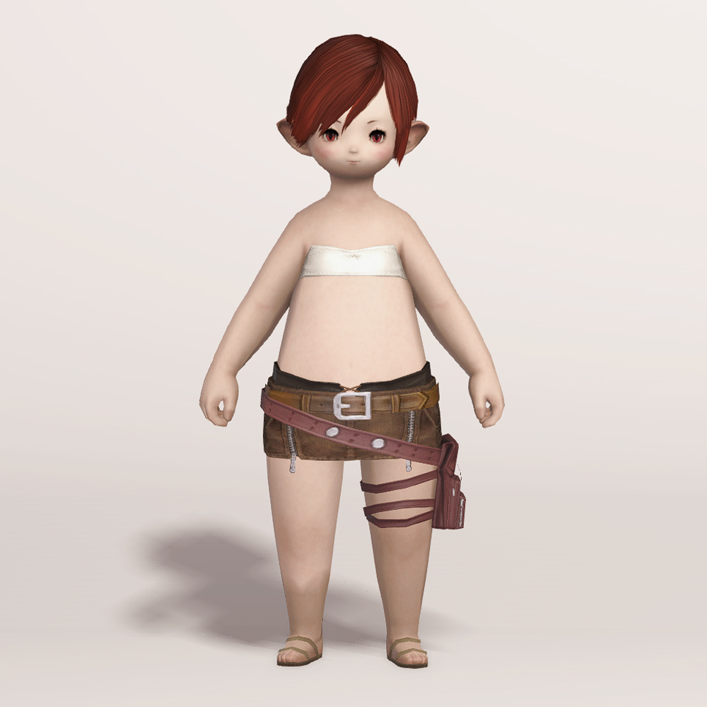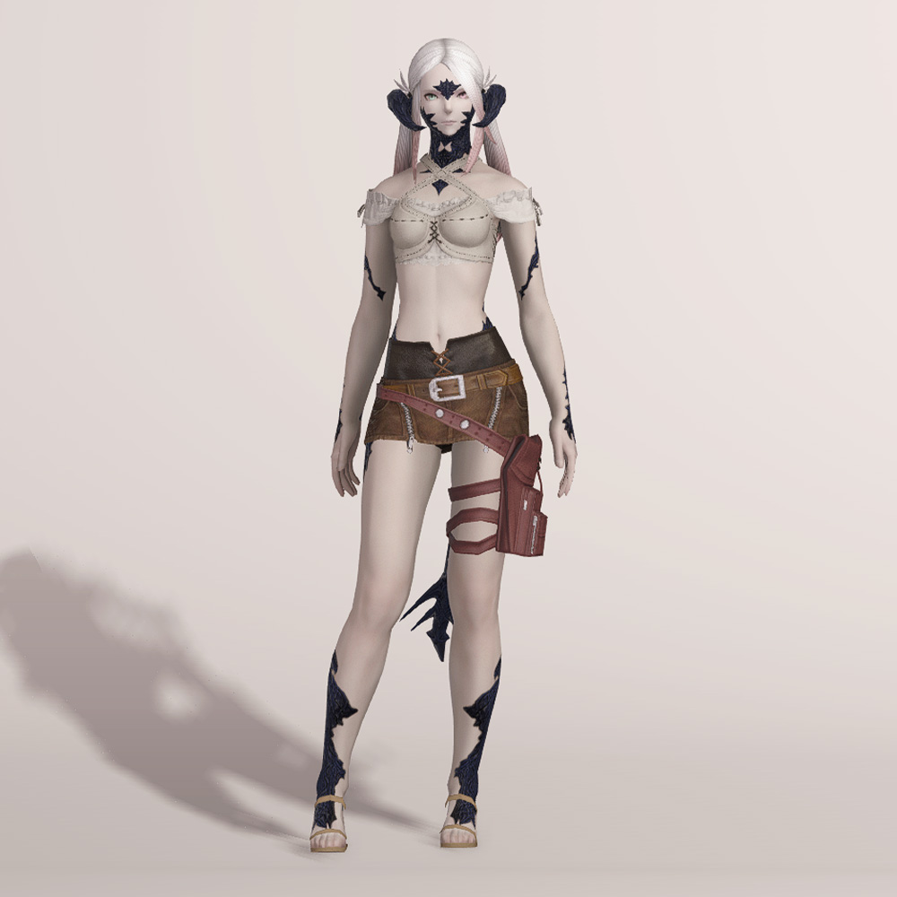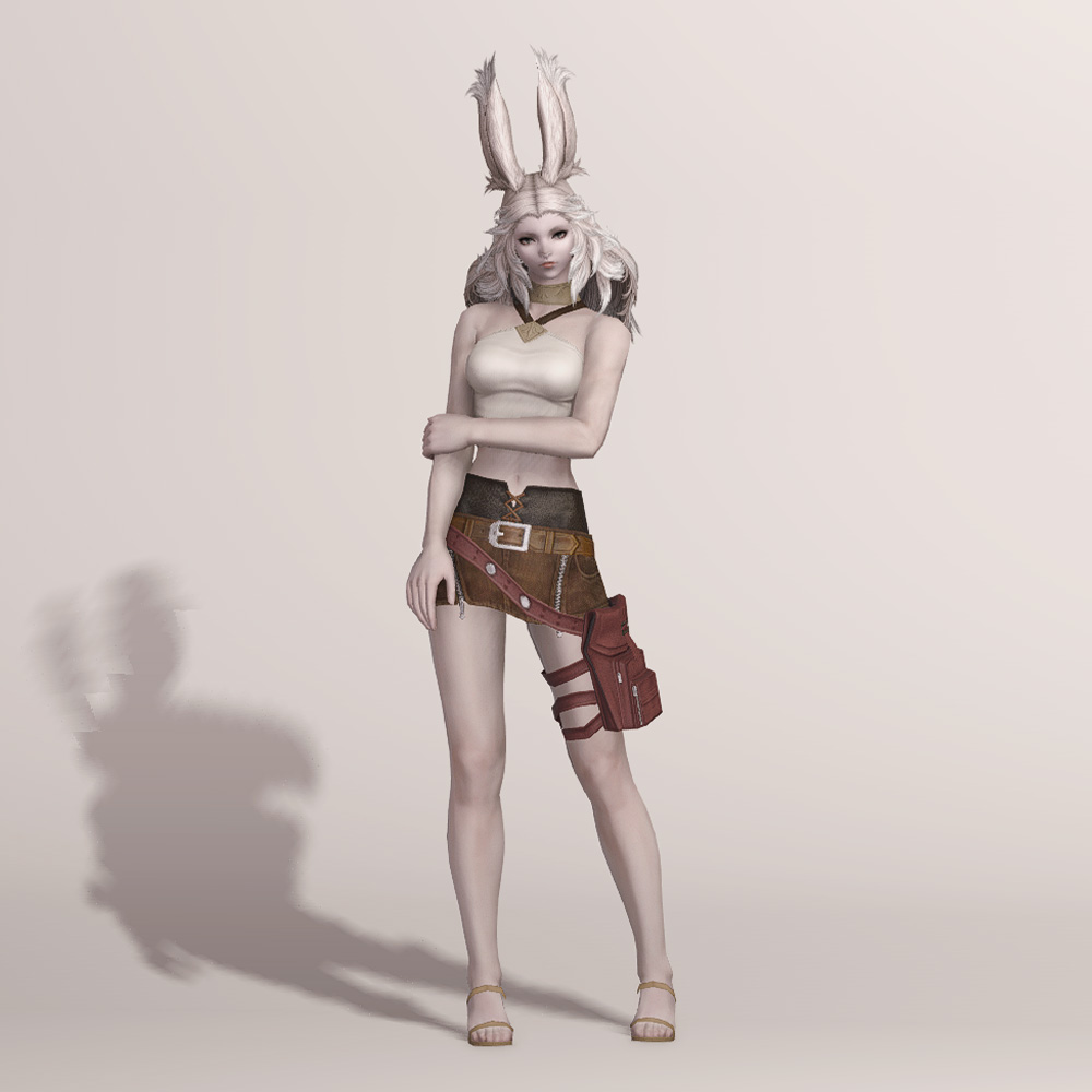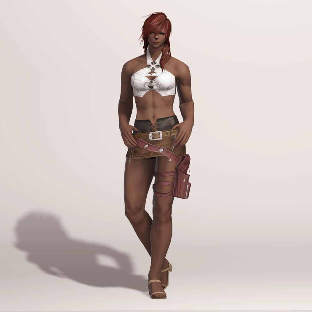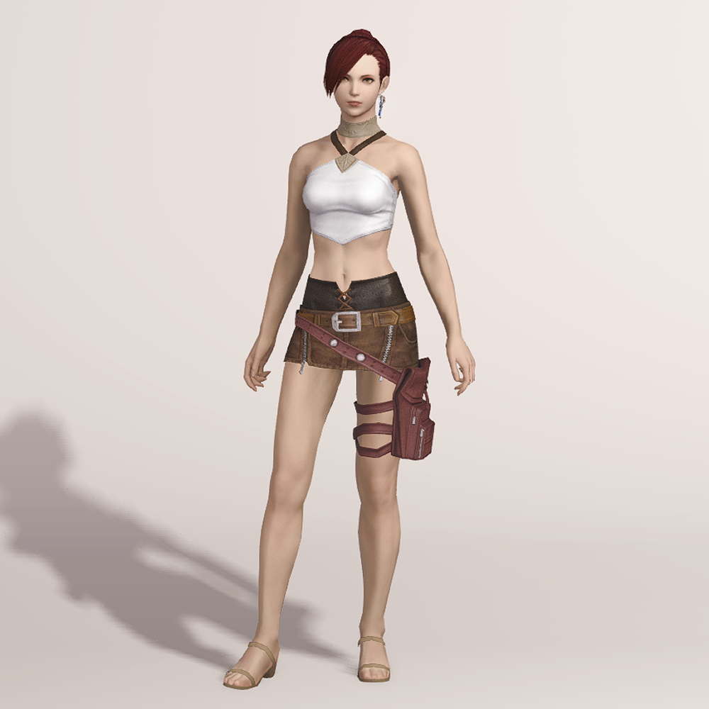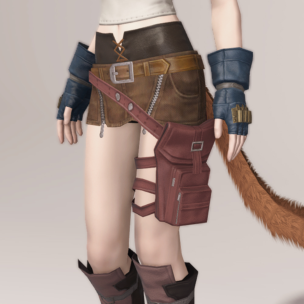 파이널판타지13의 주인공, 라이트닝의 하의입니다. 벨트와 지퍼로 이루어진 시원한 디자인의 가죽치마로 레그백이 눈에 띄며 라이트닝의 하의가 그대로 구현되어 디테일합니다. 해변의 겹옷, 달여행 유격대 조끼, 푀부트 재킷 등 가죽 계열의 옷과 함께 매치하면 다양하게 활용할 수 있습니다.
