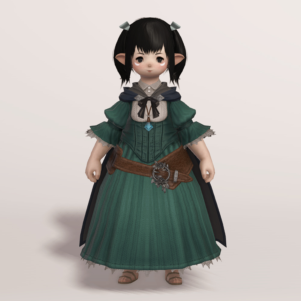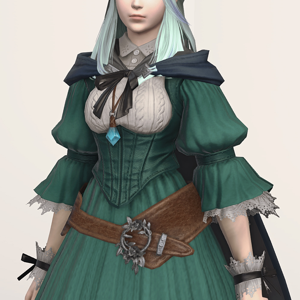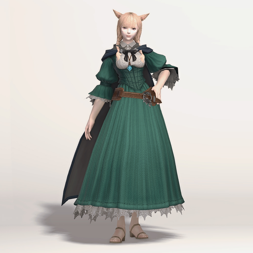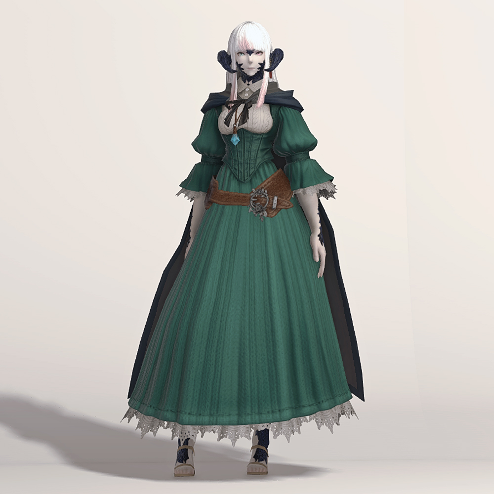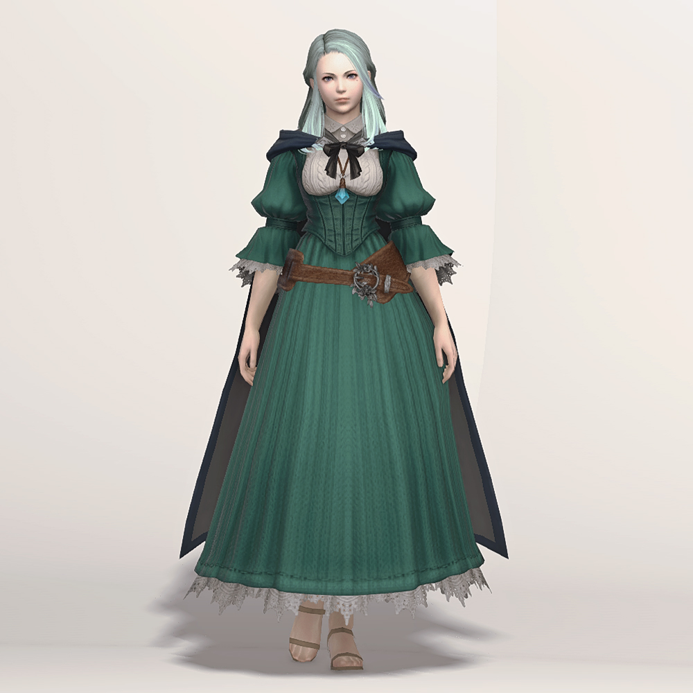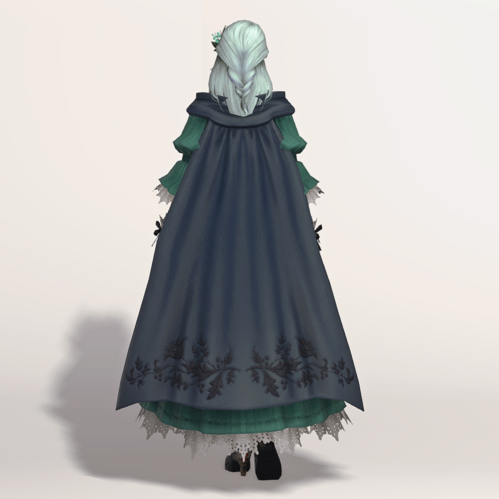 보태니컬 패턴이 수놓아진 망토부터 레이스나 셔츠 옷깃에 수놓아진 장식등 섬세한 디테일들이 감성을 불러 일으키는 원피스입니다. NPC의상이라 염색이 안된다는 점은 매우 아쉽지만 그런점도 감수하고 입고싶어지는 매력적인 원피스입니다.