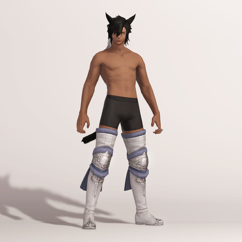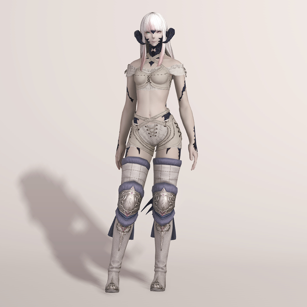 두툼하고 따뜻해 보이는 오버니부츠입니다. 무릎과 정강이, 발끝에 기품 있는 판타지풍 무늬가 디테일하게 새겨져 있어 고급스러워 보이며 마치 모눈종이처럼 새겨진 허벅지의 격자무늬 스티치가 눈에 띕니다. 이대로 입어도 좋지만 너무 두툼하고 화려해 부담스럽다고 느끼신다면 도회풍 장화, 악마의 허벅지장화 순백색의 조합을 추천드립니다.