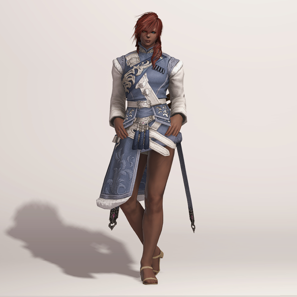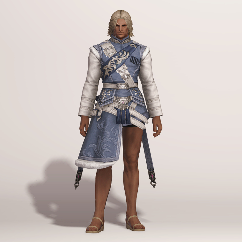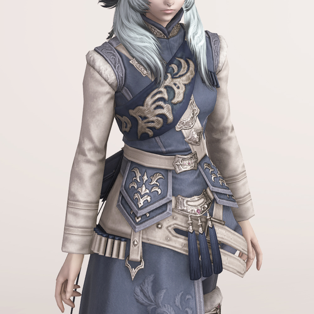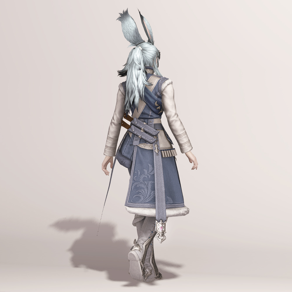 곳곳의 포근해 보이는 털 장식과 함께 고급스러운 문양이 새겨져 겨울철 정복을 연상하게 되는 외투입니다. 매서운 추위를 견딜 수 있도록 신경 썼으며, 전체적으로 디테일해 활동성을 고려했다는 것을 알 수 있습니다. 허리 뒤쪽의 나이프 2개와 함께 길게 내려온 스트랩이 눈에 띕니다.
