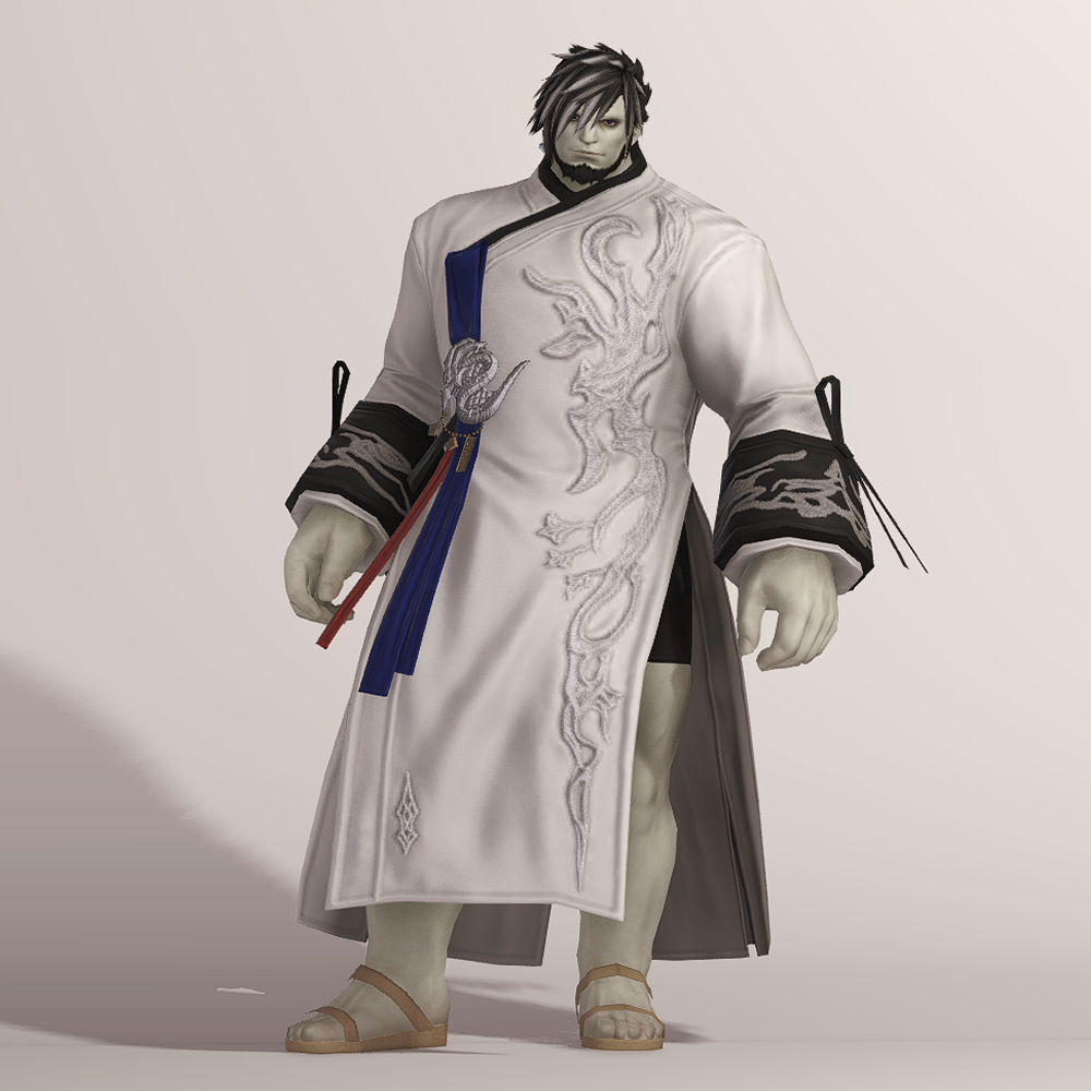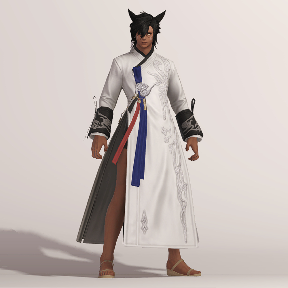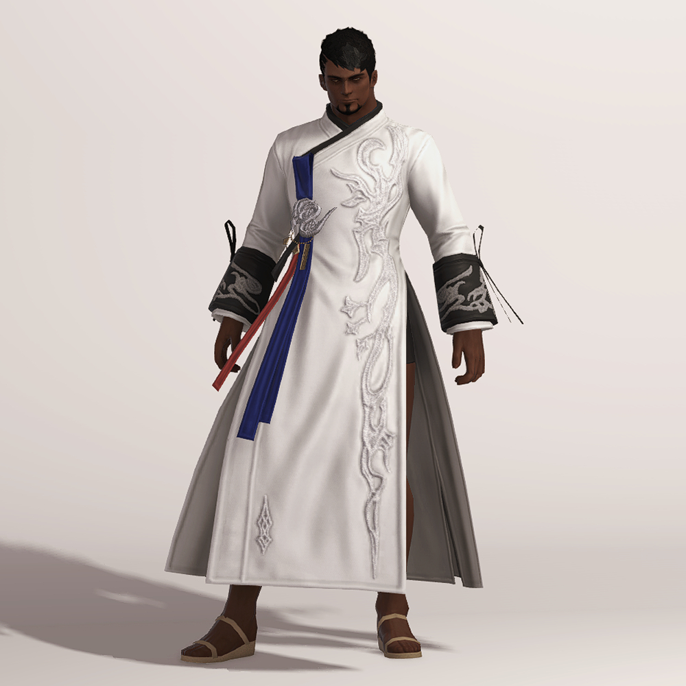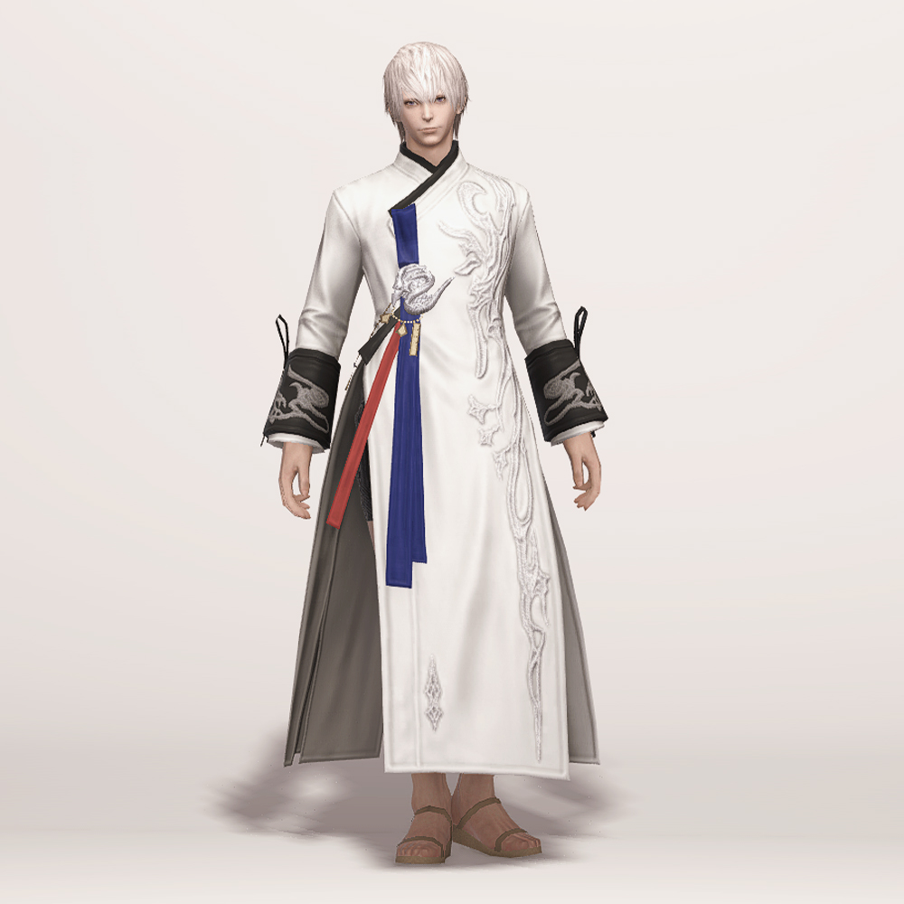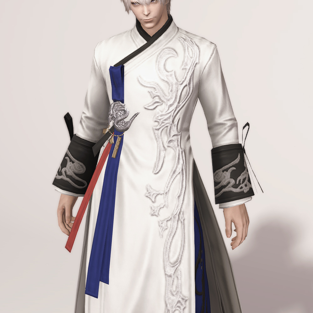 명치 근처에 있는 은색 용 장식과 함께 구름이나 연기를 나타낸듯한 화려한 자수 디테일이 돋보여 동방 특유의 느낌을 볼 수 있는 아름다운 한복입니다. 푸른색 고름과 함께 곳곳의 금속 장식이 눈에 띄며, 전체적으로 슬림한 핏을 자랑합니다. 동작이 크고, 몸을 많이 움직이는 탱커나 딜러가 착용하면 펄럭거리는 옷깃이 너무 멋있어 추천드립니다.
