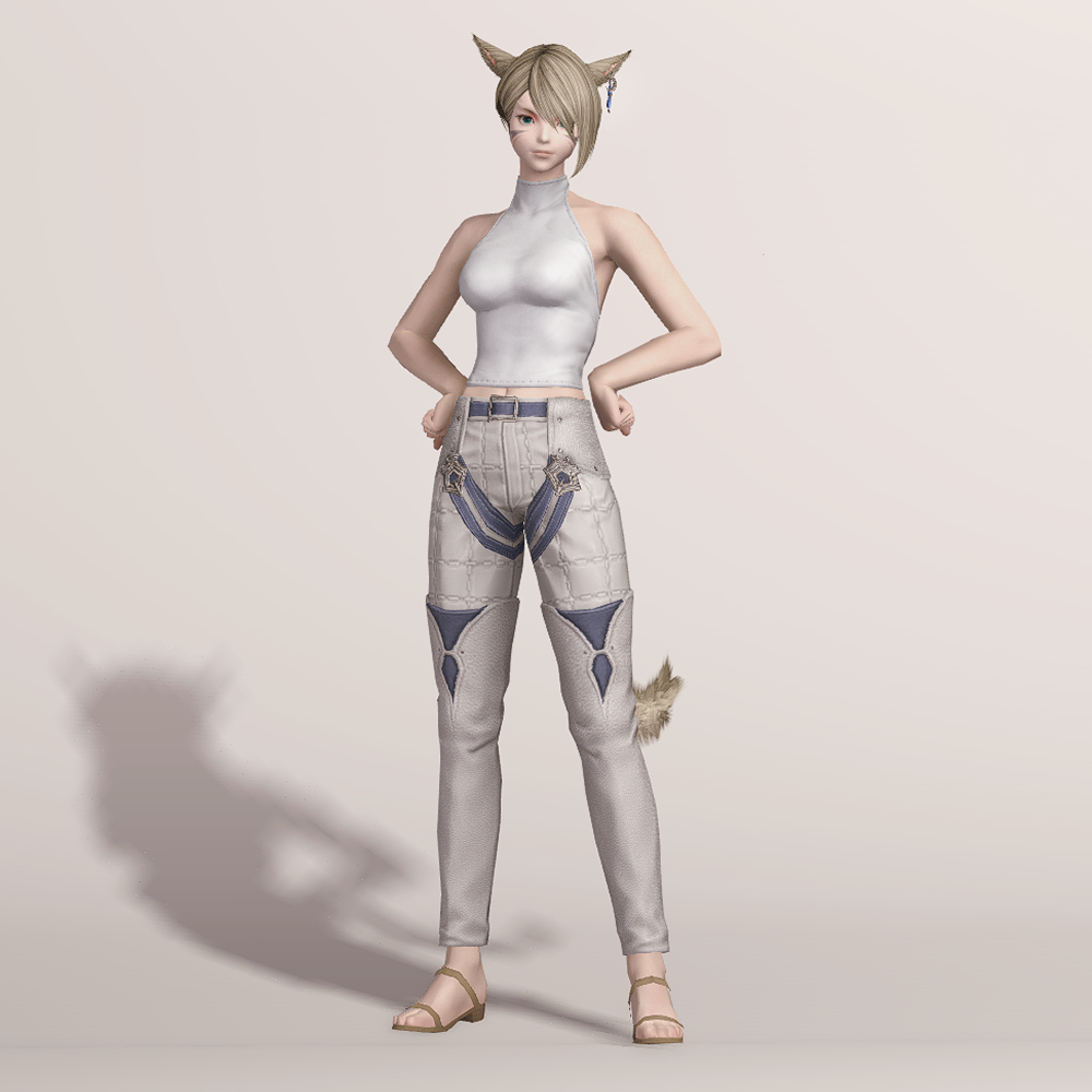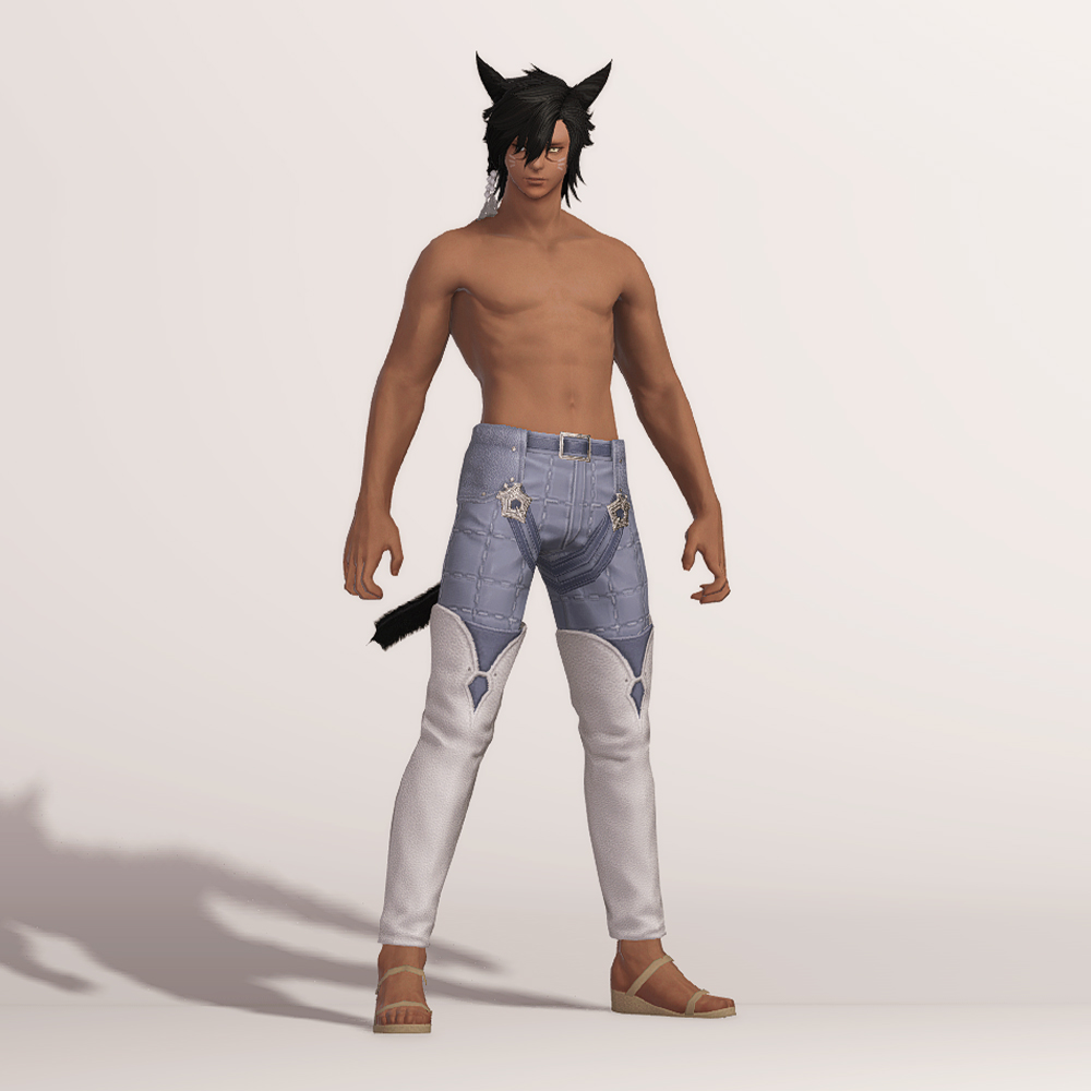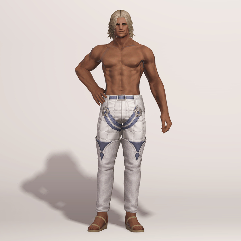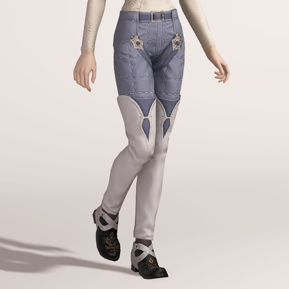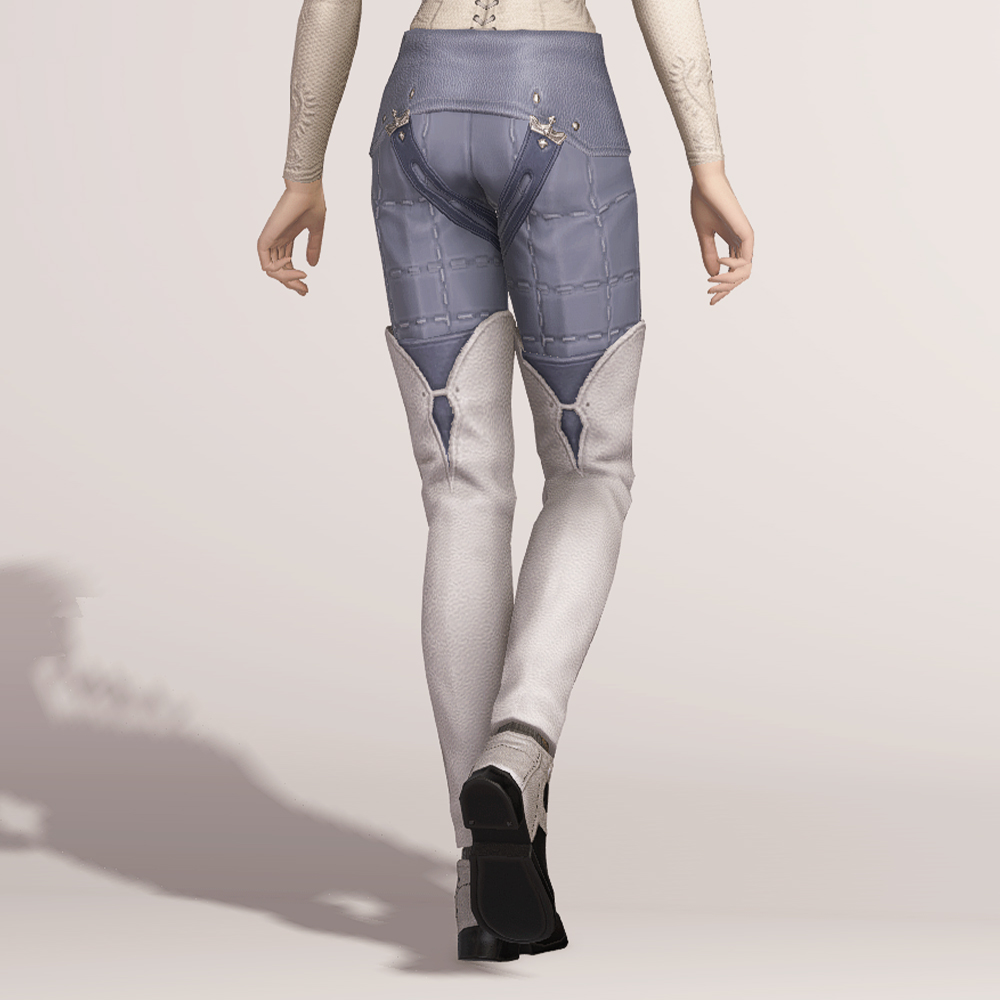 타 직업 궁정 하의들과 다르게 개성 있는 슬랙스입니다. 마치 모눈종이처럼 새겨진 격자무늬 스티치가 가장 먼저 눈에 띄며, 동시에 허리와 엉덩이에 덮인 가죽을 고정시켜주는 스트랩이 눈에 띕니다. 종아리도 아닌 허벅지까지 올라오는 가죽은 오버니부츠가 연상되며 추위를 이길 수 있을 정도로 두툼하지는 않지만, 질기고 정교해 최전선 앞에 나가 싸우는 학살자의 다리를 보호해 줍니다.