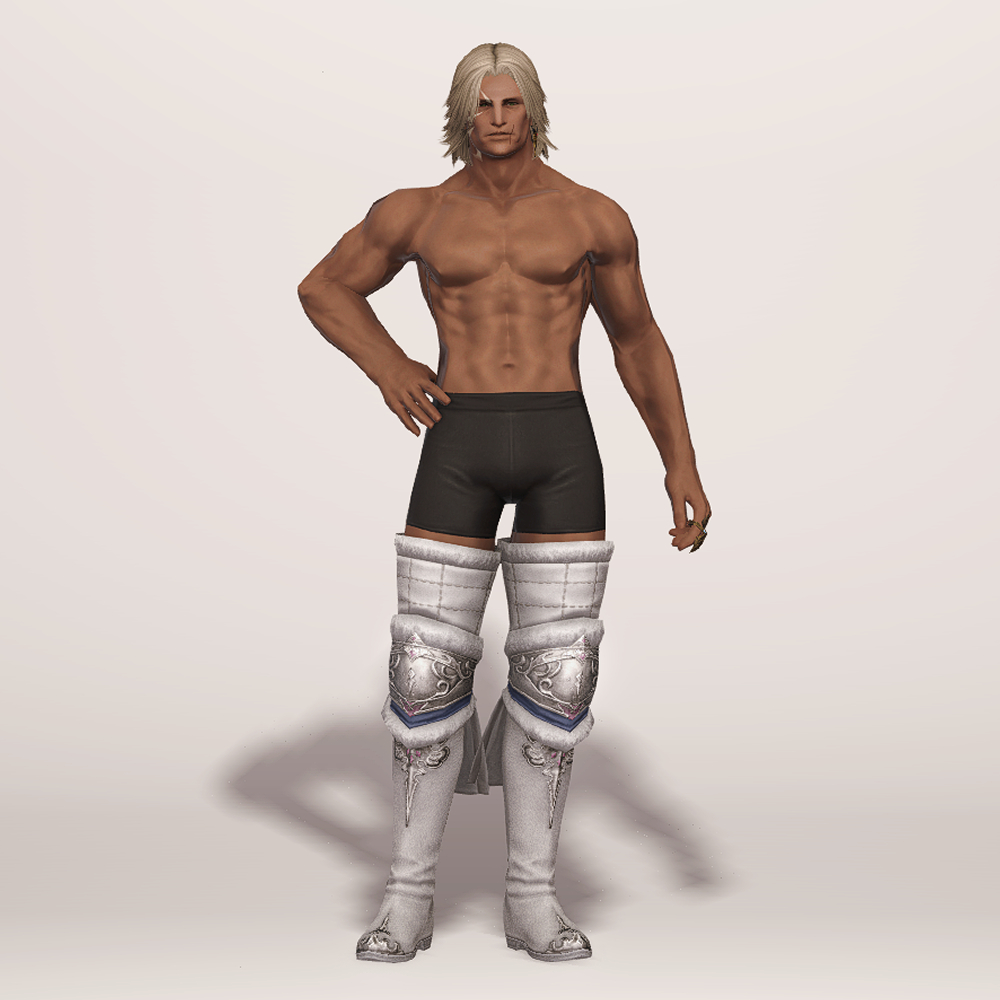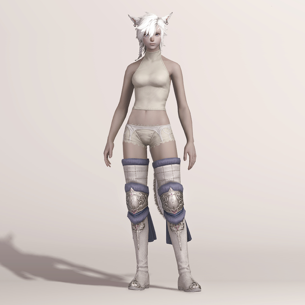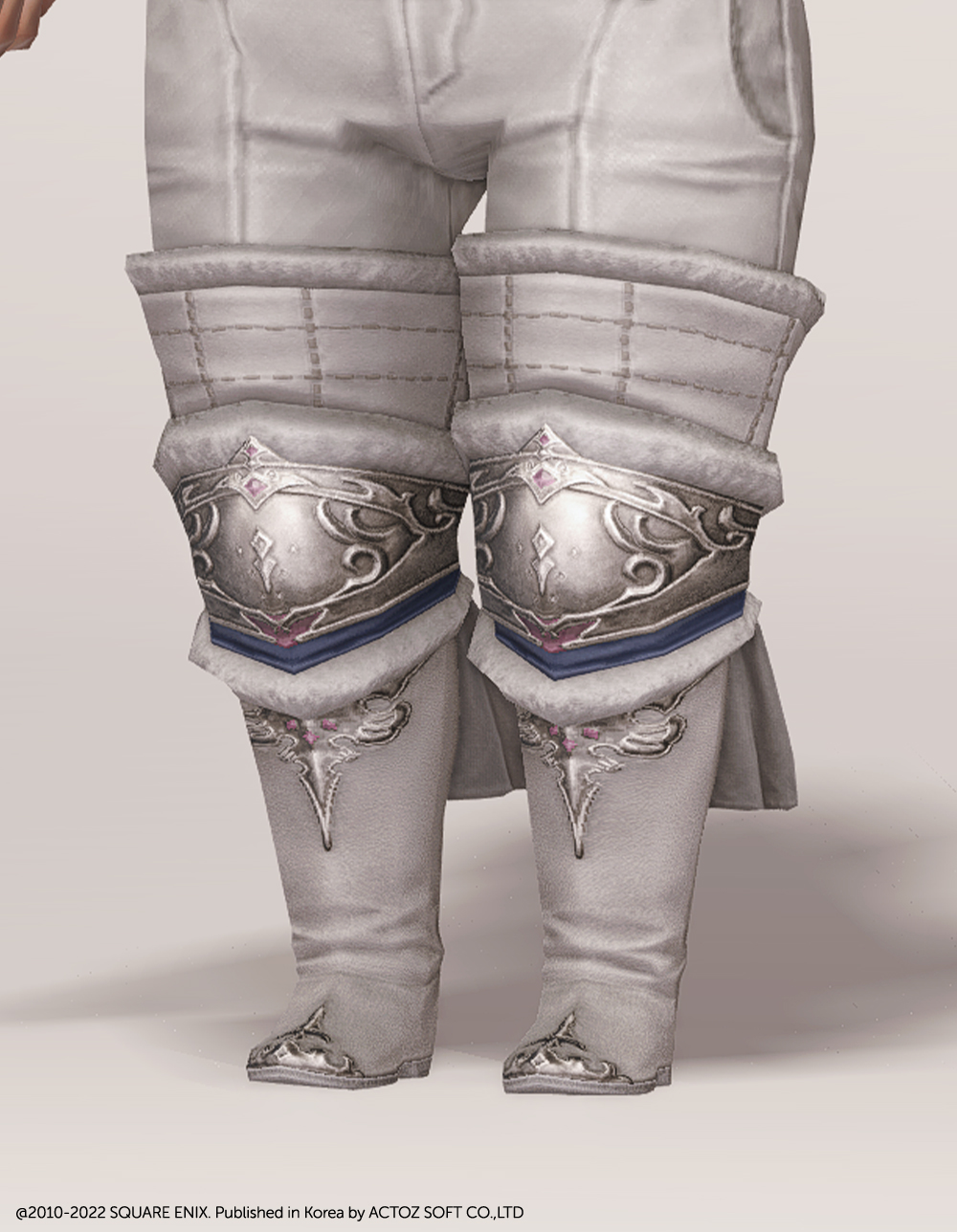 두툼하고 따뜻해 보이는 오버니부츠입니다. 무릎과 정강이, 발끝에 기품 있는 판타지풍 무늬가 디테일하게 새겨져 있어 고급스러워 보이며 마치 모눈종이처럼 새겨진 허벅지의 격자무늬 스티치가 눈에 띕니다. 이대로 입어도 좋지만 너무 두툼하고 화려해 부담스럽다고 느끼신다면 도회풍 장화, 악마의 허벅지장화 순백색의 조합을 추천드립니다.