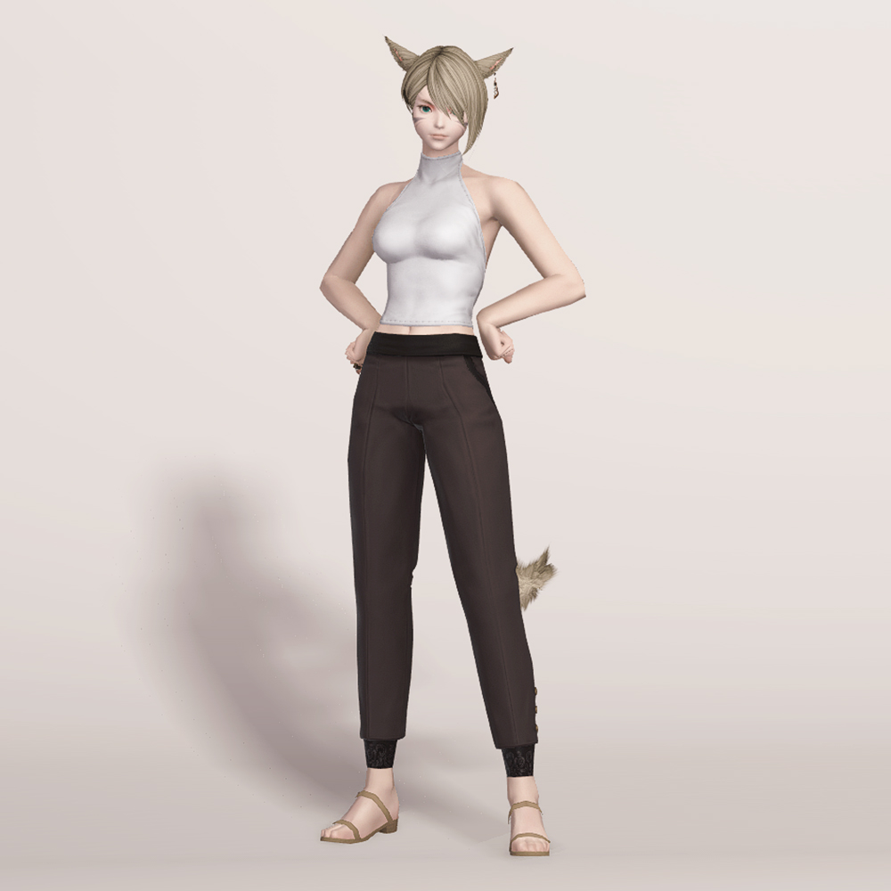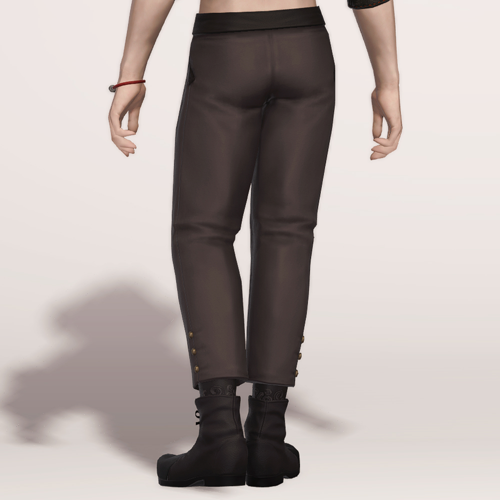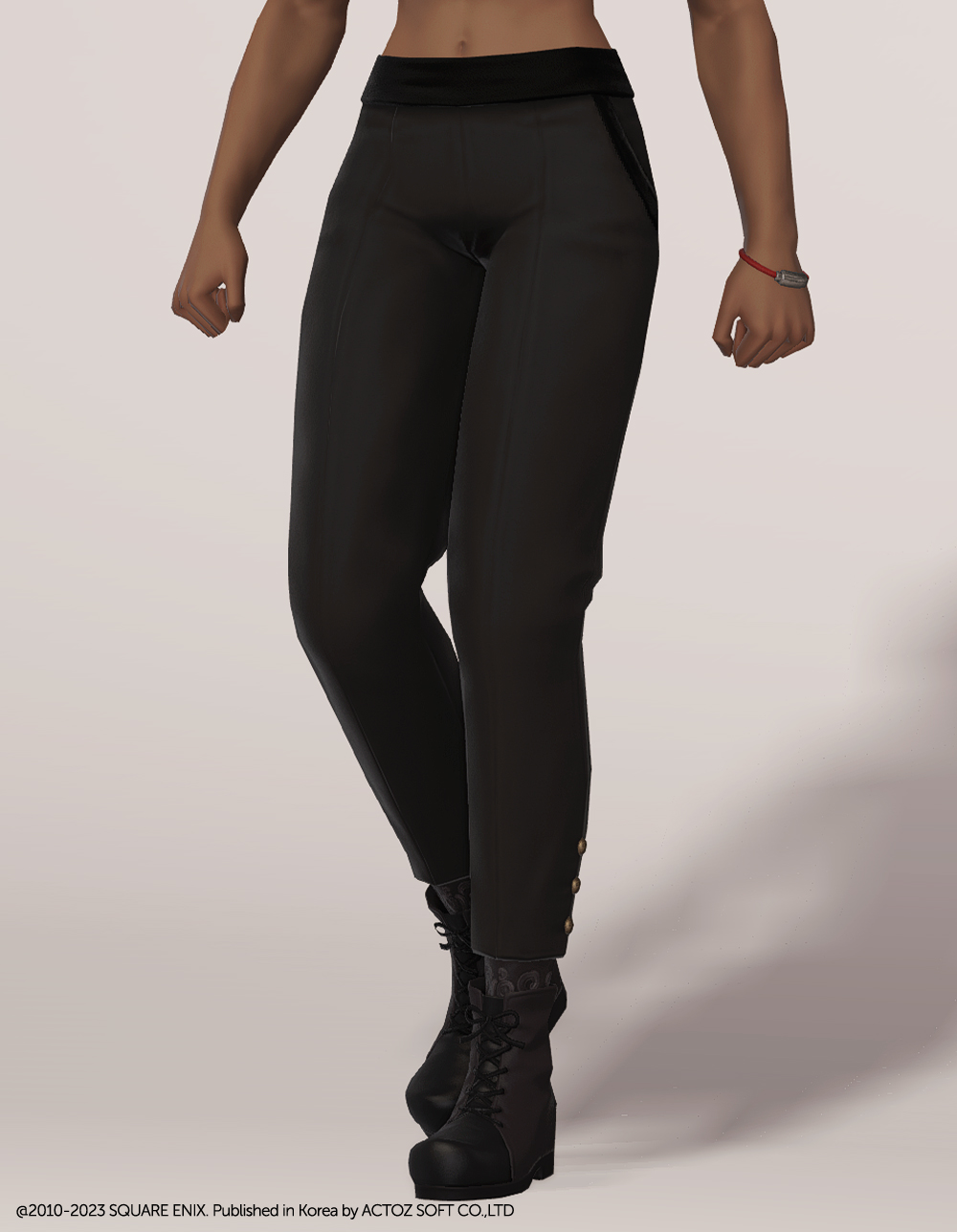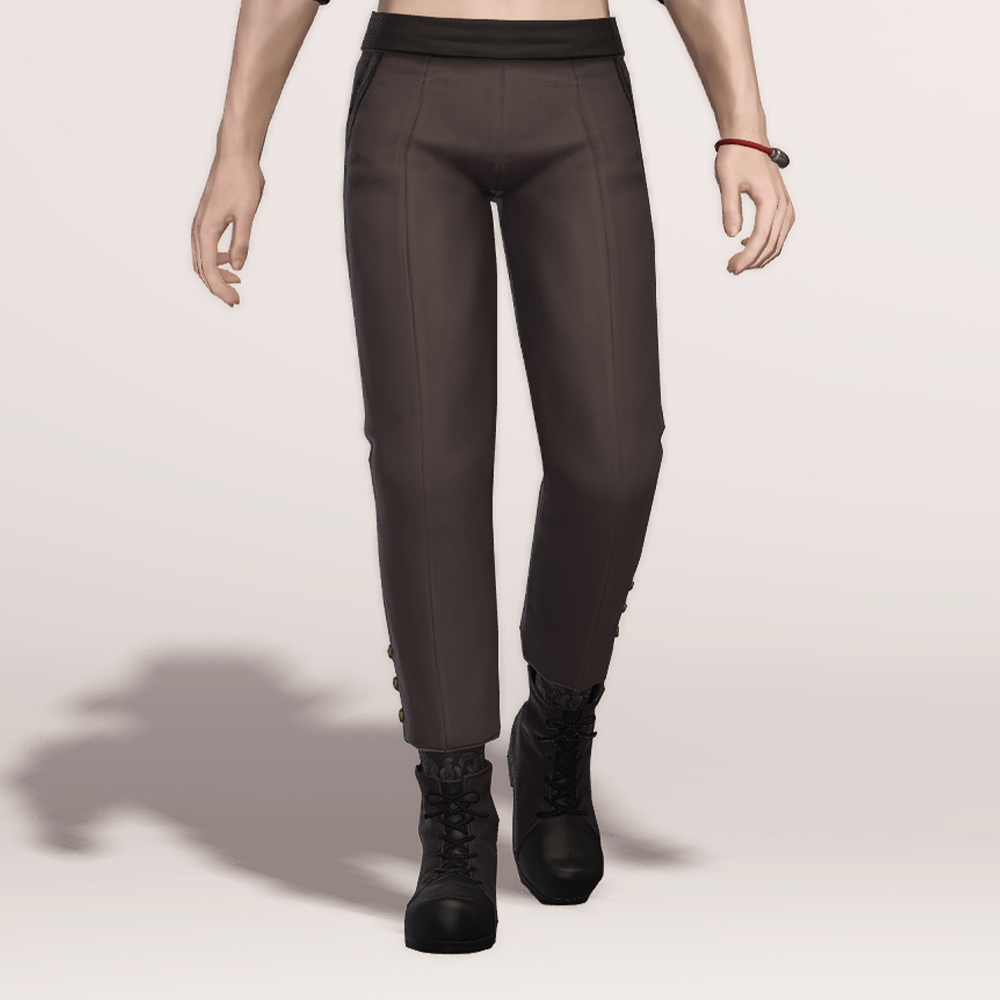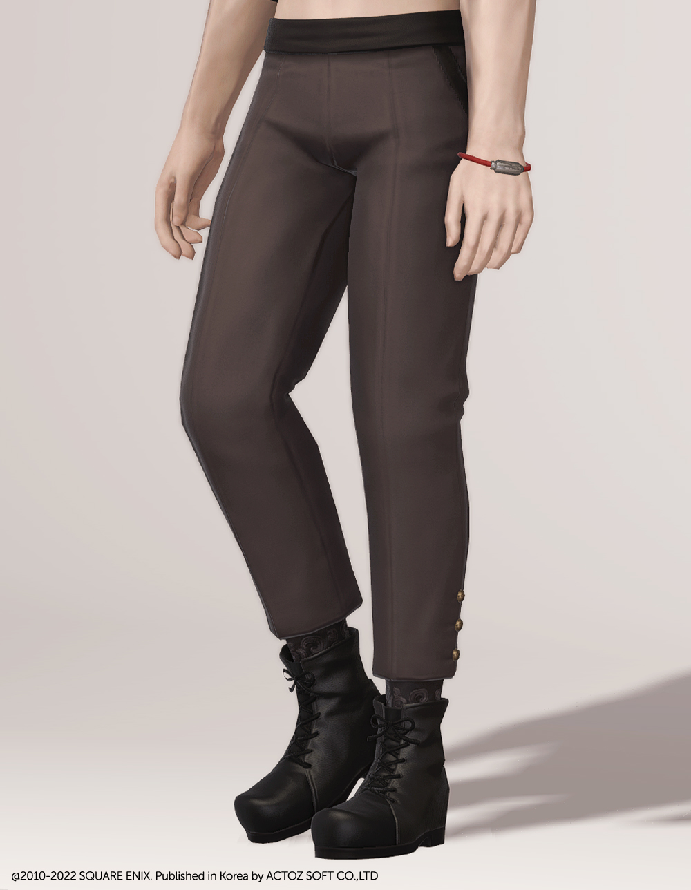 깔끔하고 예쁜 핏의 슬랙스입니다. 바지 밑단을 시보리 처리해 발목을 감싸고 있는 모습을 보면 조거팬츠 느낌도 납니다. 쓰리 버튼과 함께 동양풍스러운 발목의 자수가 포인트지만 호불호가 조금 갈리는 편입니다. 발목이 거슬리는 분들은 에오르제아 교복 로퍼: 장목양말 등과 같이 발목을 완전히 가려줄 수 있는 부츠나 워커 계열의 신발과 매치하시는 것을 추천드립니다.