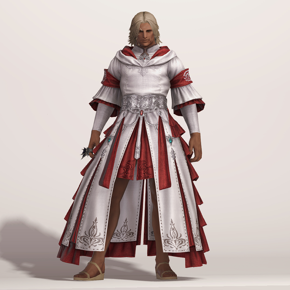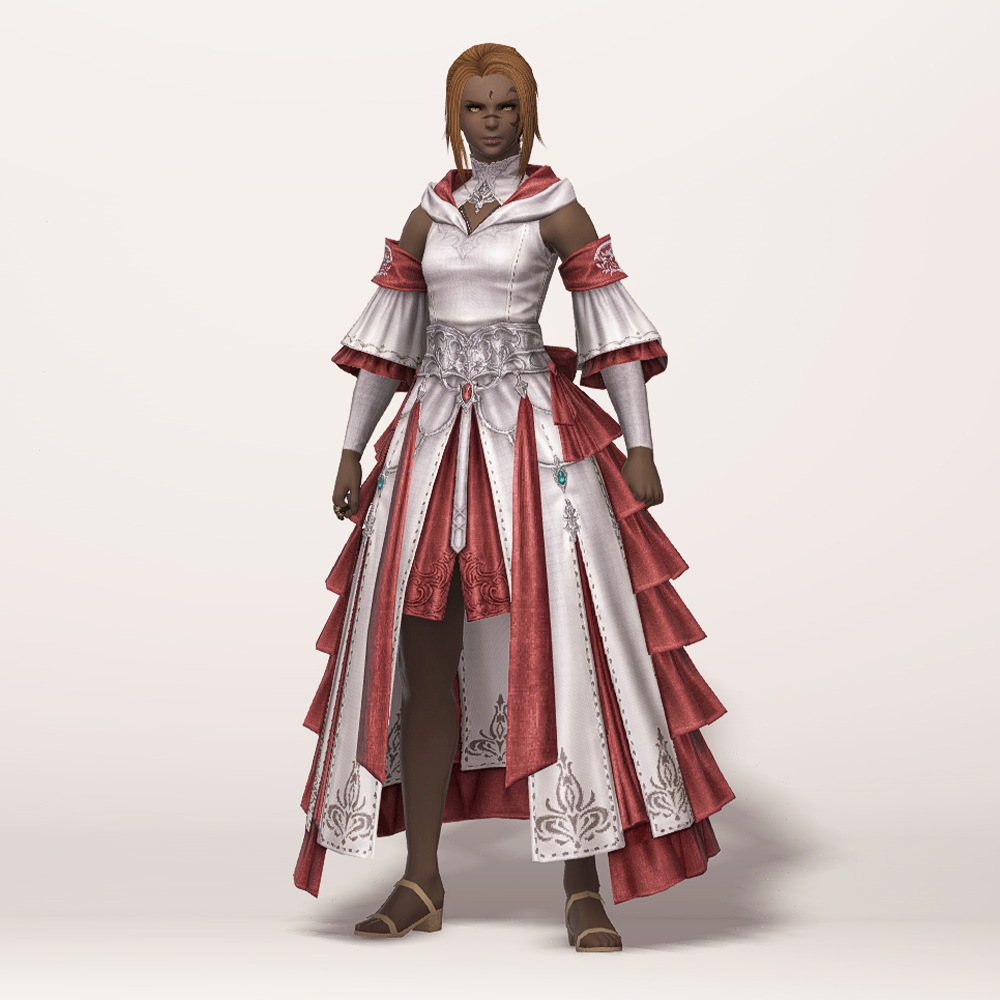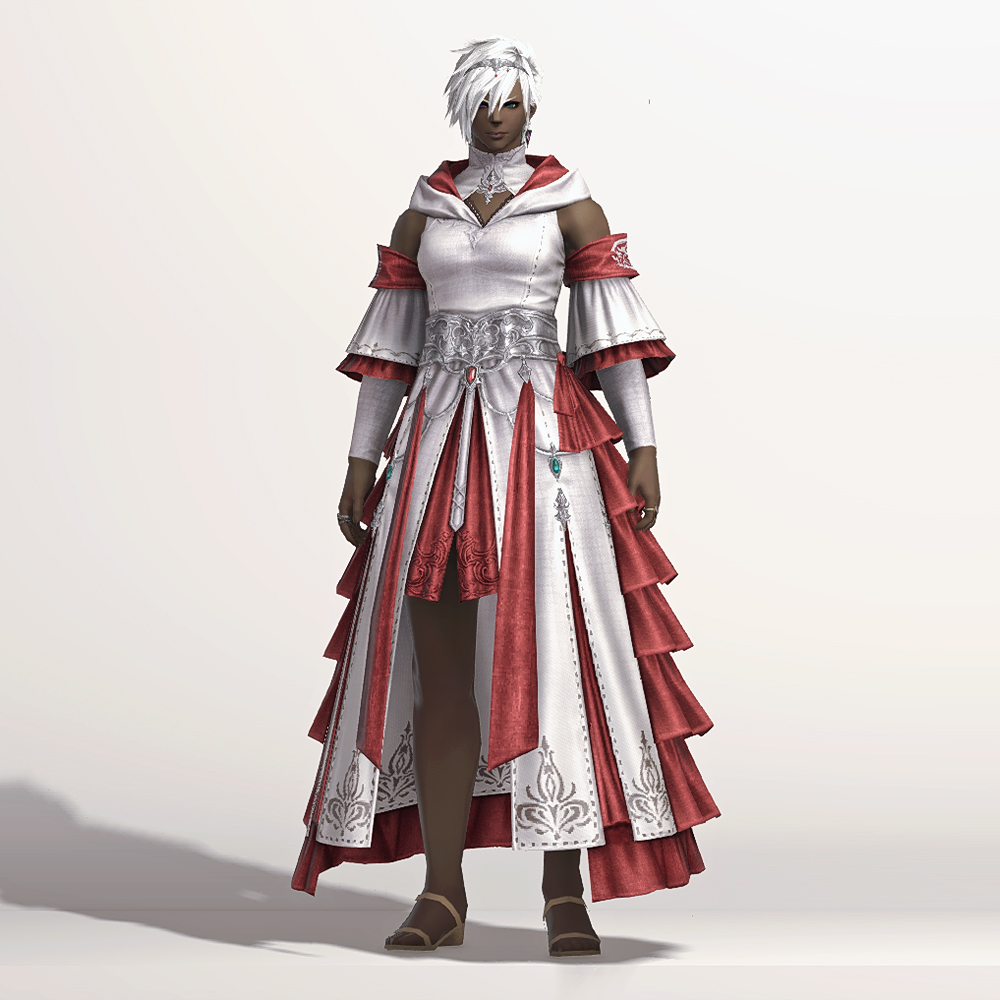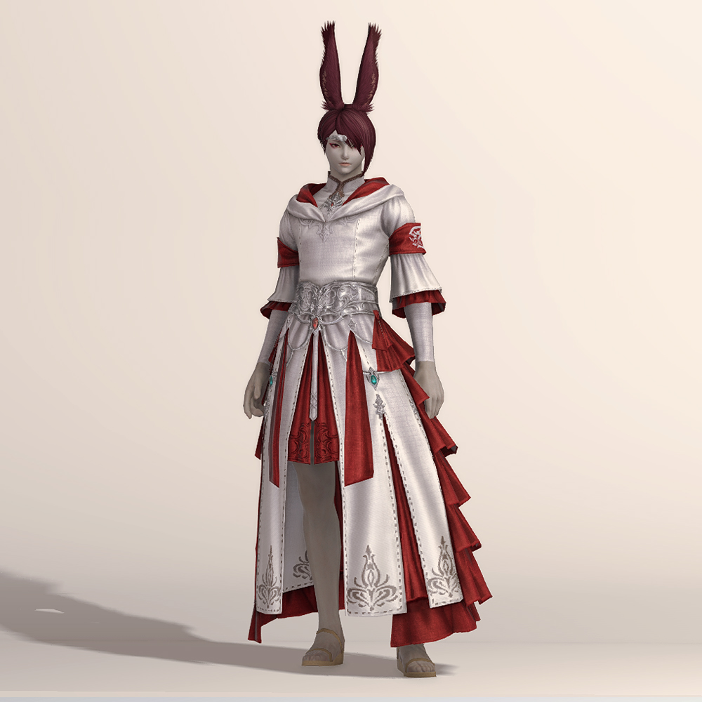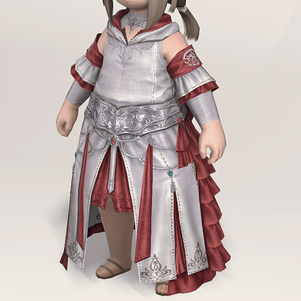 후면 프릴디테일이 굉장한 백마도사 90레벨 잡룩입니다. 목걸이 문양이나 허리띠 등 굉장한 성스러운 디테일이 가득한 의상입니다. 사랑스러운 프릴 디테일을 가진 다른 하의와 매치하는 것도 좋을 것 같습니다. 염색을 하지 않을때 옷감의 질감이 살짝 어둡게 들어가 기본이 생화이트로 보이지 않는 것이 아쉬우나, 염색시 색상이 선명하게 올라갑니다.