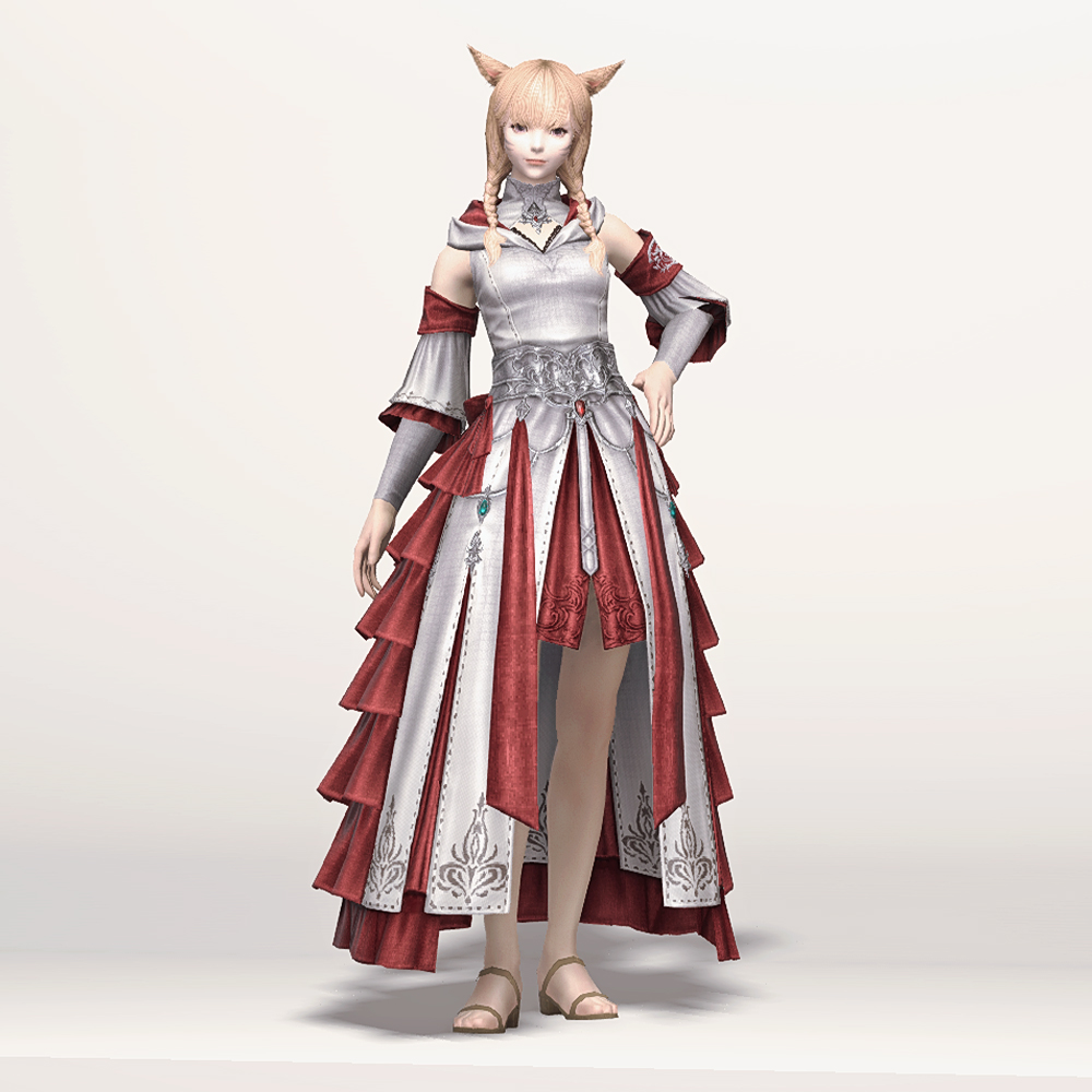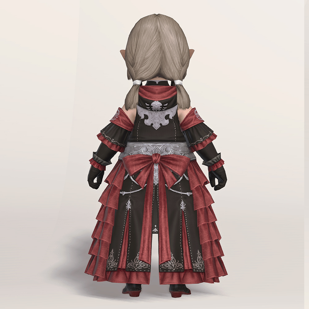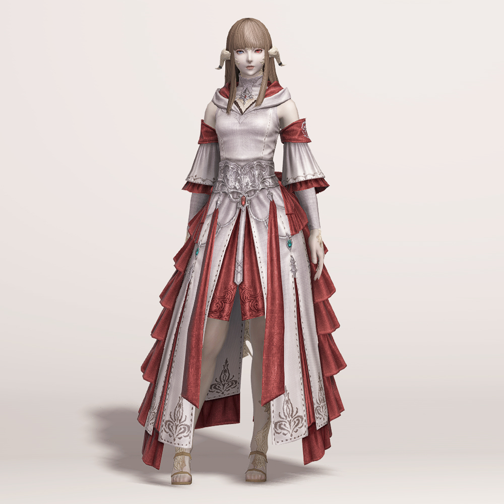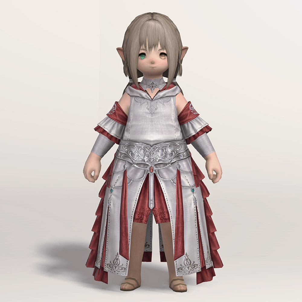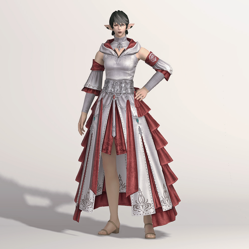 후면 프릴디테일이 굉장한 백마도사 90레벨 잡룩입니다. 목걸이 문양이나 허리띠 등 굉장한 성스러운 디테일이 가득한 의상입니다. 사랑스러운 프릴 디테일을 가진 다른 하의와 매치하는 것도 좋을 것 같습니다. 염색을 하지 않을때 옷감의 질감이 살짝 어둡게 들어가 기본이 생화이트로 보이지 않는 것이 아쉬우나, 염색시 색상이 선명하게 올라갑니다.