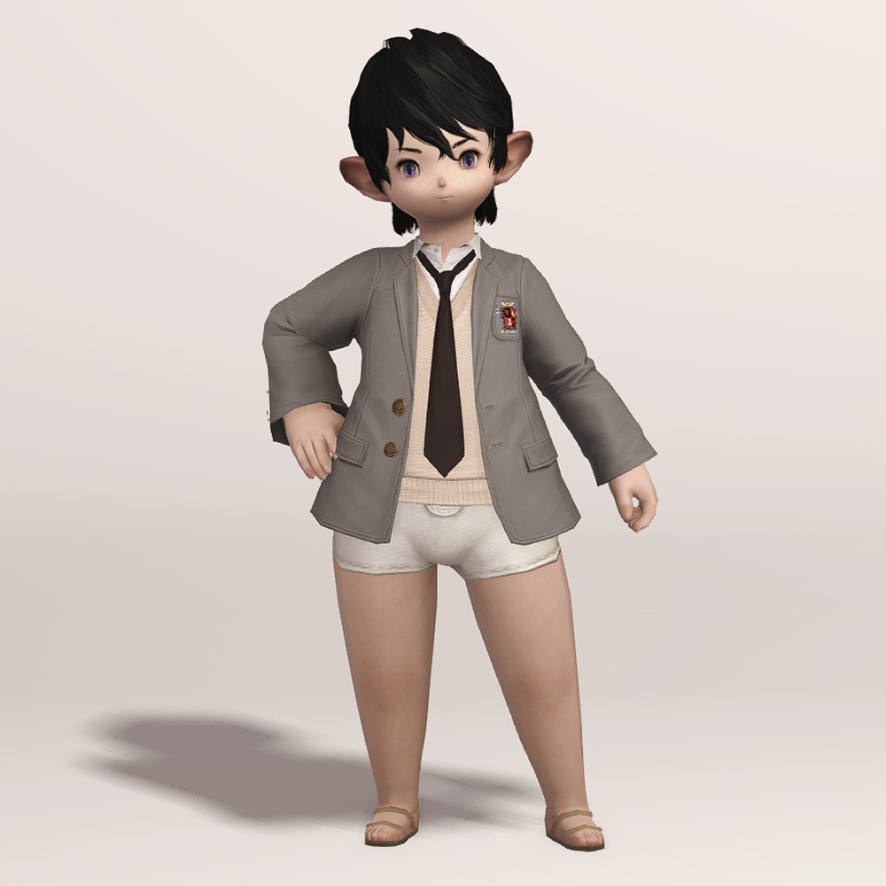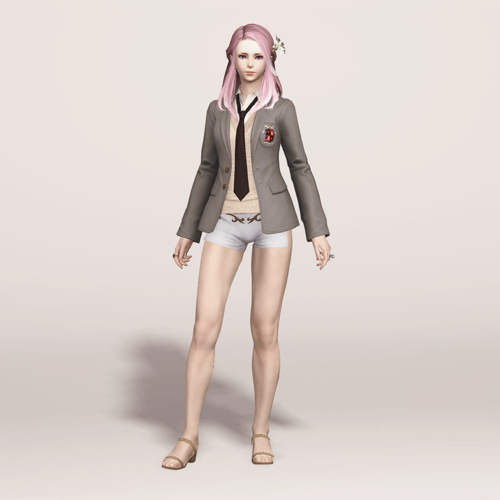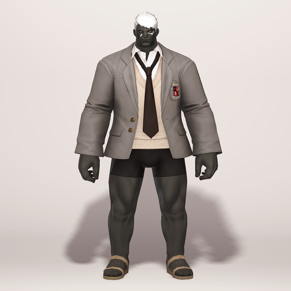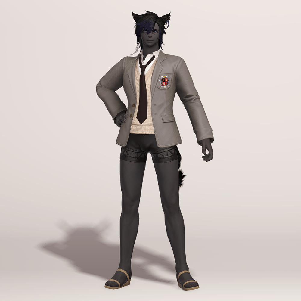 대중적인 블레이저 상의와 베이지색 니트 조끼의 조합으로 전체적으로 단정하면서도 세련된 핏을 자랑하는 교복 상의입니다. 편하게 늘어뜨린 넥타이가 멋스러움을 더해주며 보는 사람을 기준으로 오른쪽 가슴에 위치한 패치 포켓에는 이슈가르드 사대명가를 뜻하는 심볼이 있는데, 이는 각 총사령부의 문장 담당관 NPC에게서 속해있는 자유부대 심볼로 변경이 가능합니다.