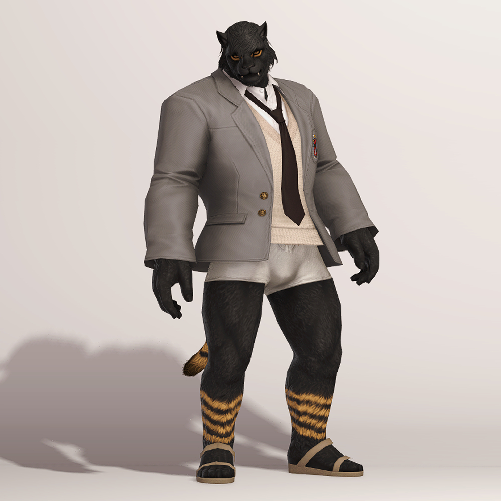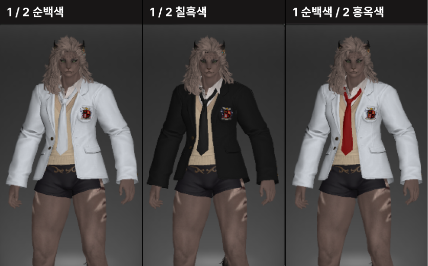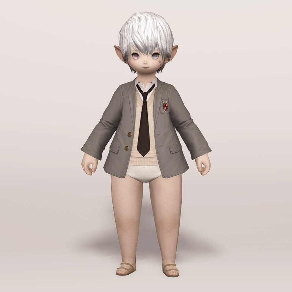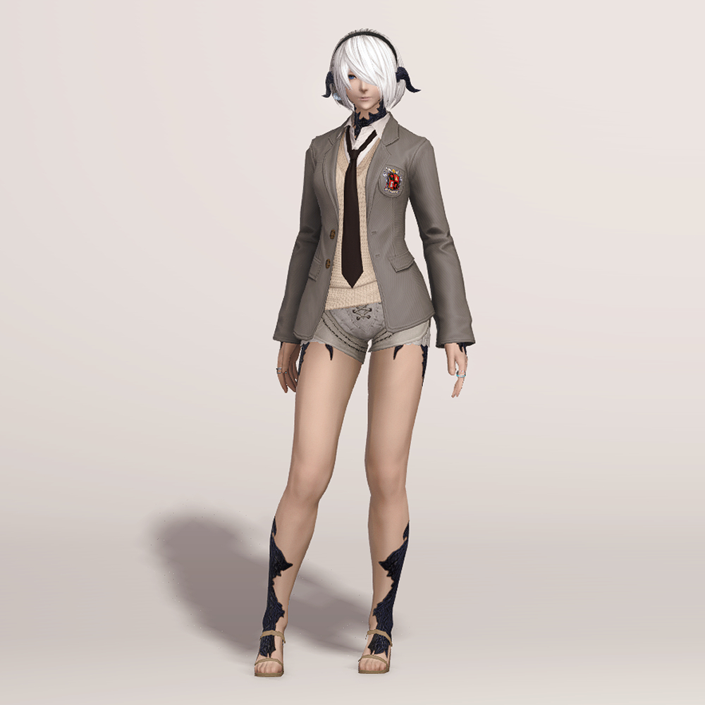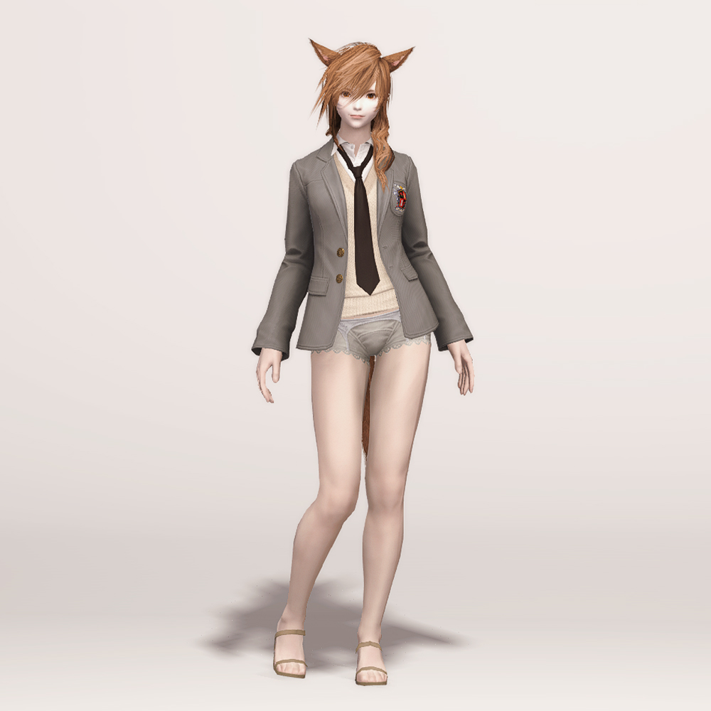 대중적인 블레이저 상의와 베이지색 니트 조끼의 조합으로 전체적으로 단정하면서도 세련된 핏을 자랑하는 교복 상의입니다. 편하게 늘어뜨린 넥타이가 멋스러움을 더해주며 보는 사람을 기준으로 오른쪽 가슴에 위치한 패치 포켓에는 이슈가르드 사대명가를 뜻하는 심볼이 있는데, 이는 각 총사령부의 문장 담당관 NPC에게서 속해있는 자유부대 심볼로 변경이 가능합니다.