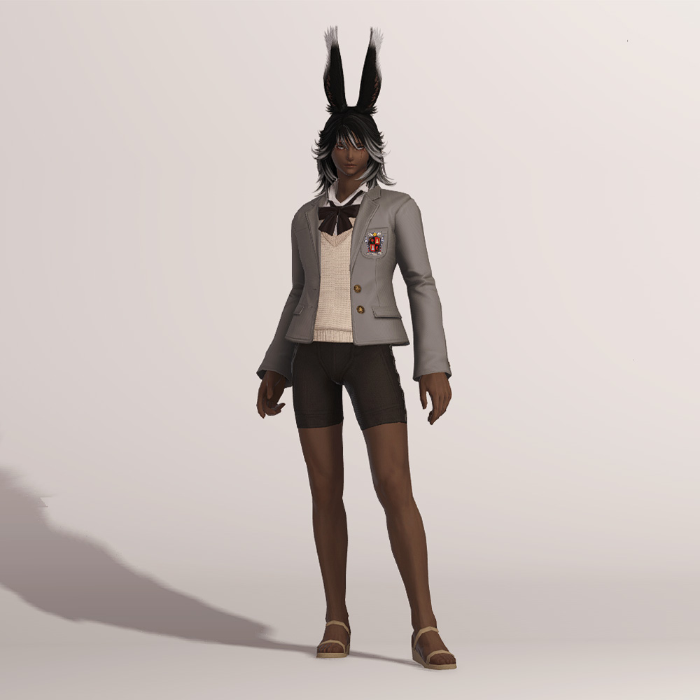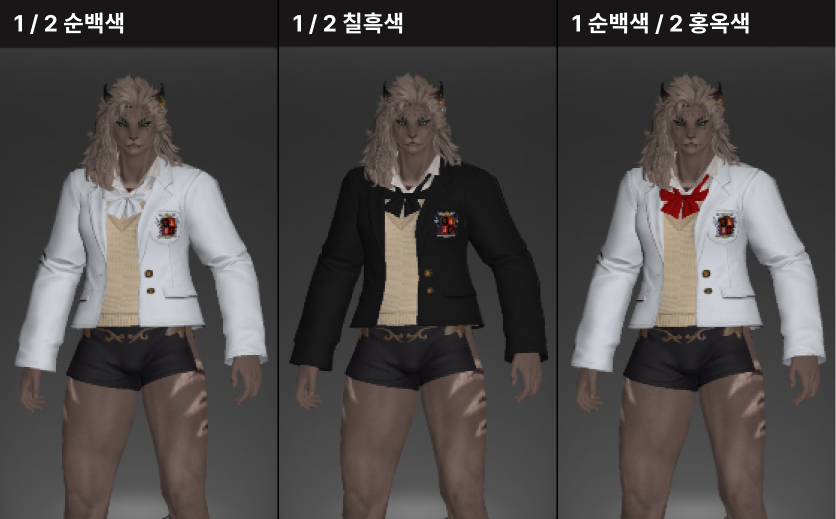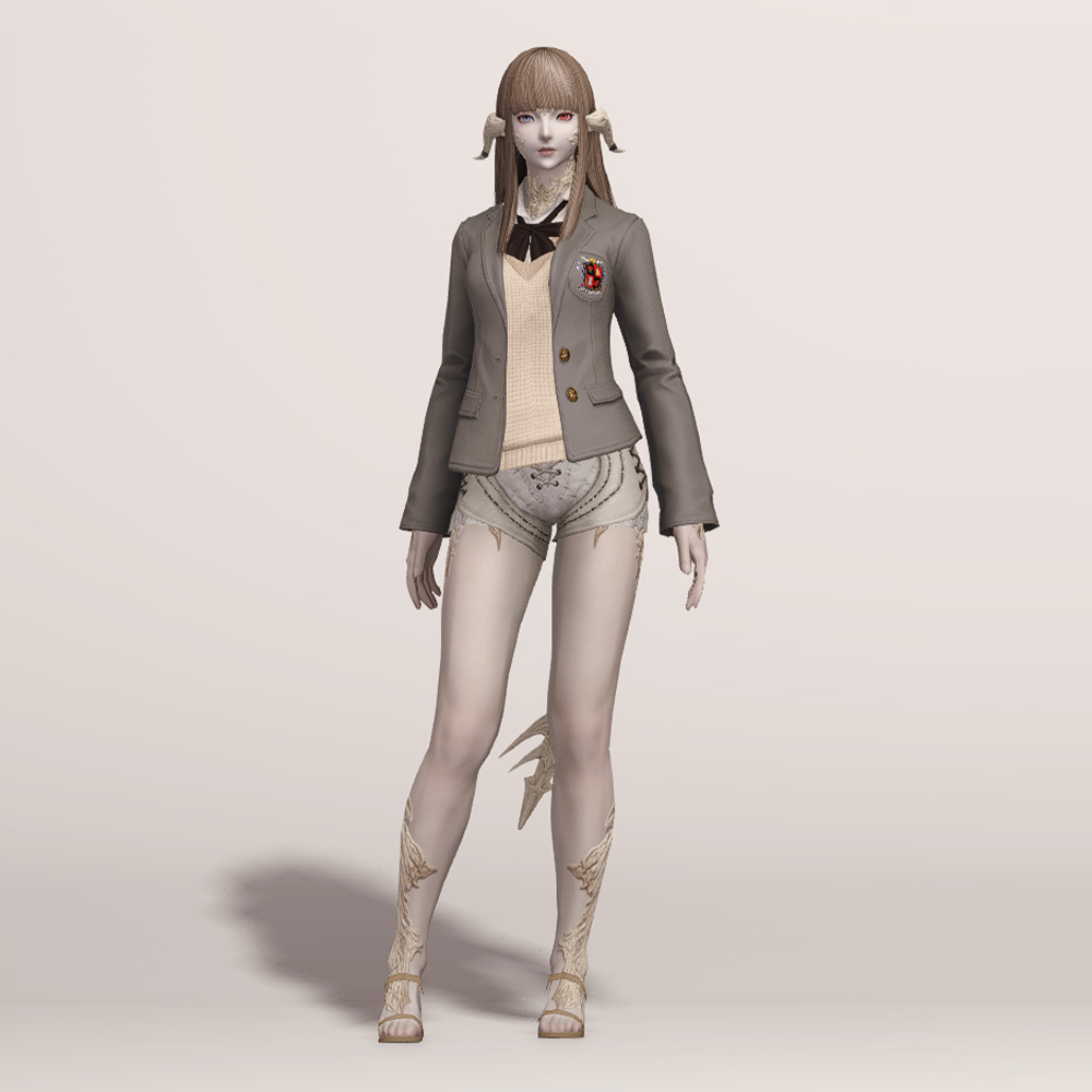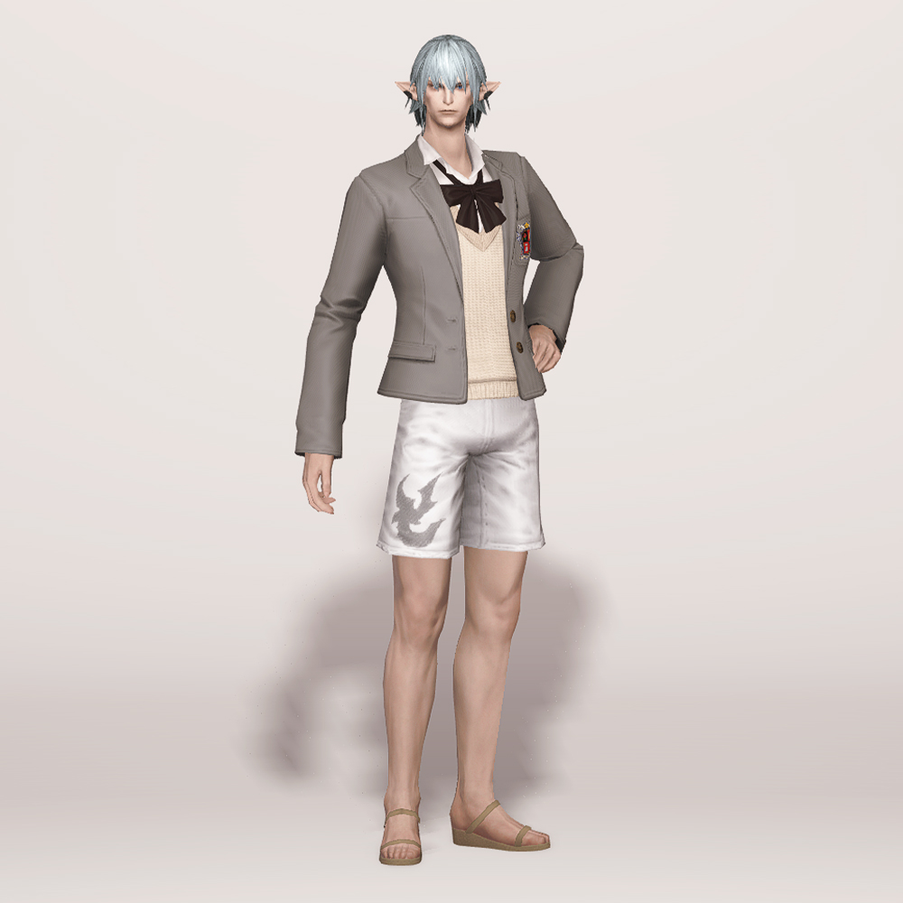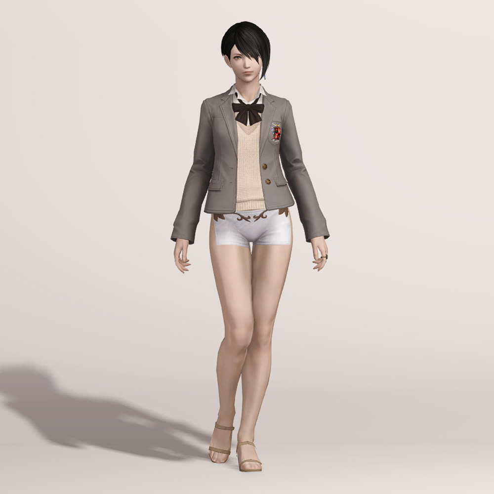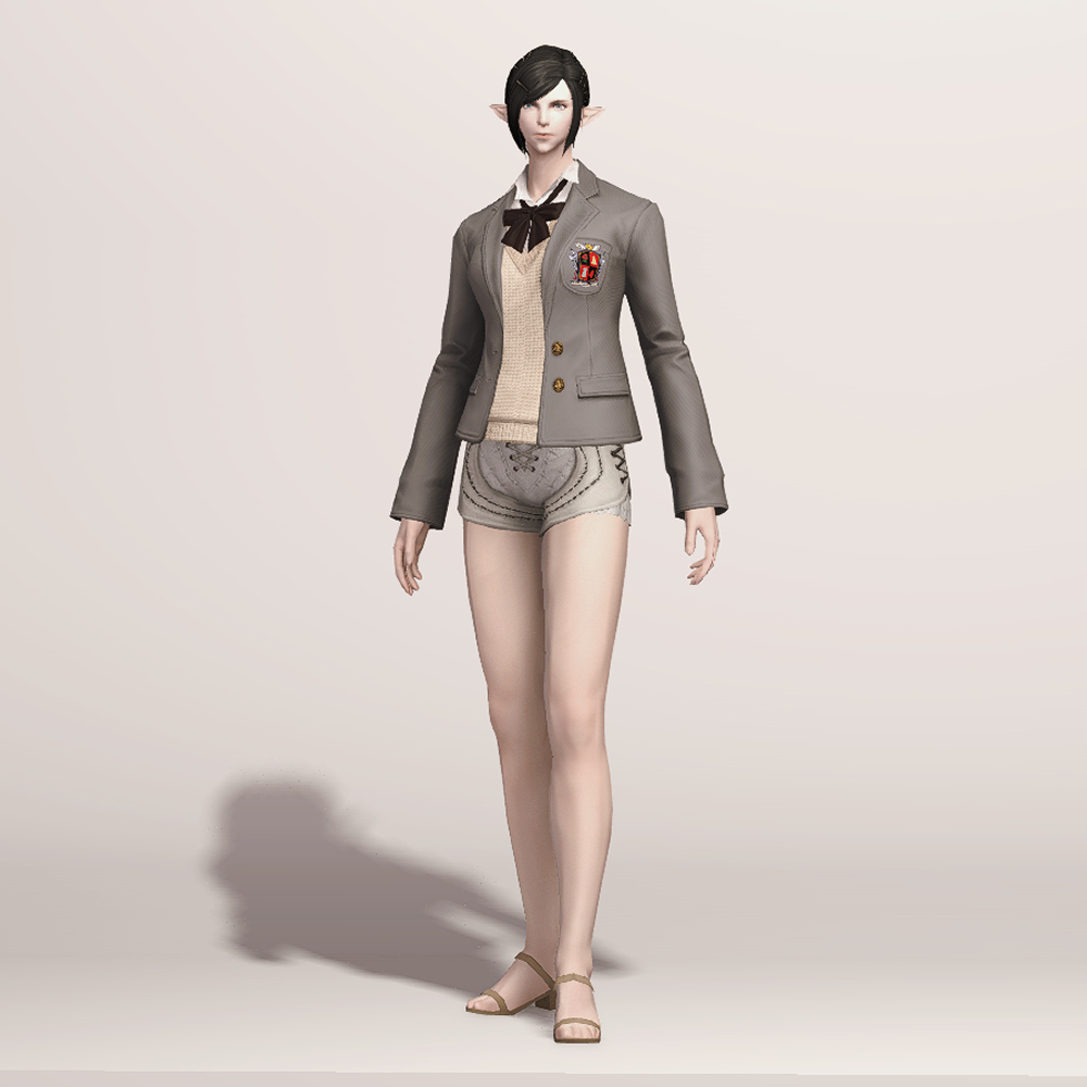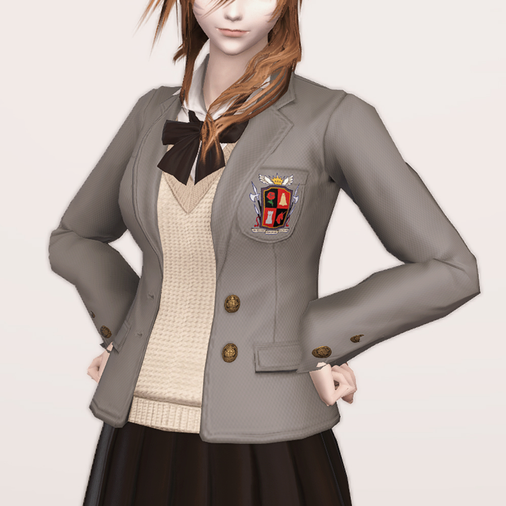 대중적인 블레이저 상의와 베이지색 니트 조끼의 조합으로 전체적으로 단정하면서도 세련된 핏을 자랑하는 교복 상의입니다. 커다란 리본 넥타이가 귀여움을 더해주며 보는 사람을 기준으로 오른쪽 가슴에 위치한 패치 포켓에는 이슈가르드 사대명가를 뜻하는 심볼이 있는데, 이는 각 총사령부의 문장 담당관 NPC에게서 속해있는 자유부대 심볼로 변경이 가능합니다.