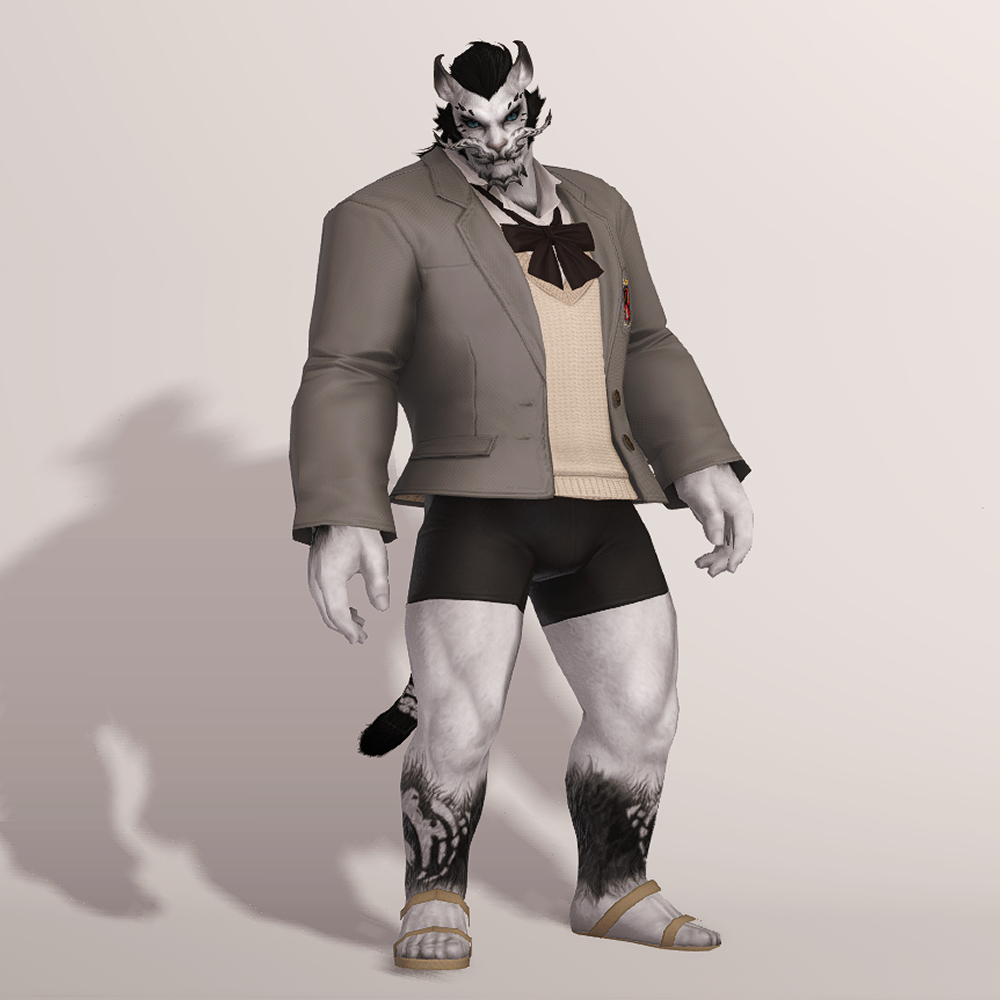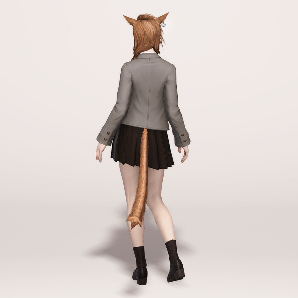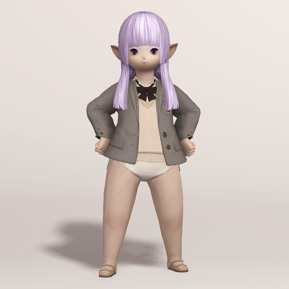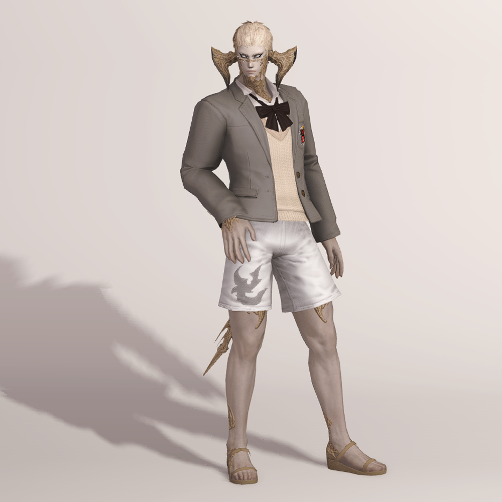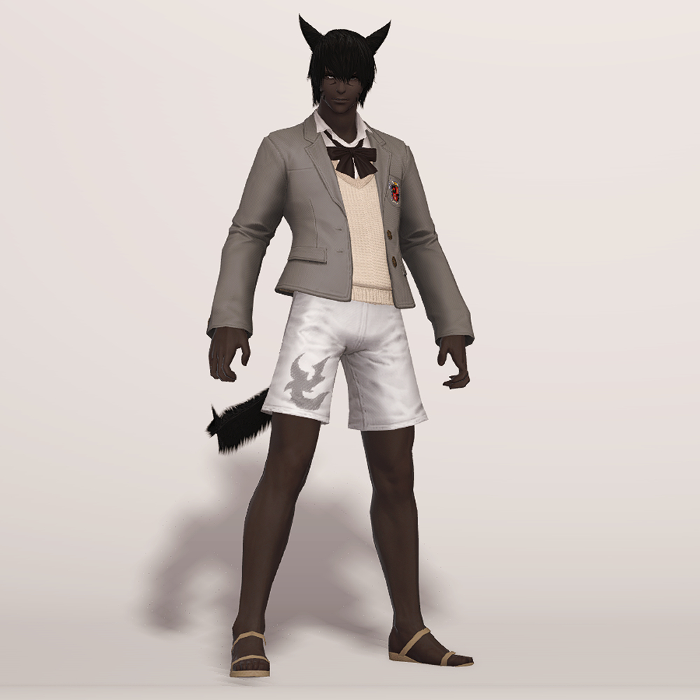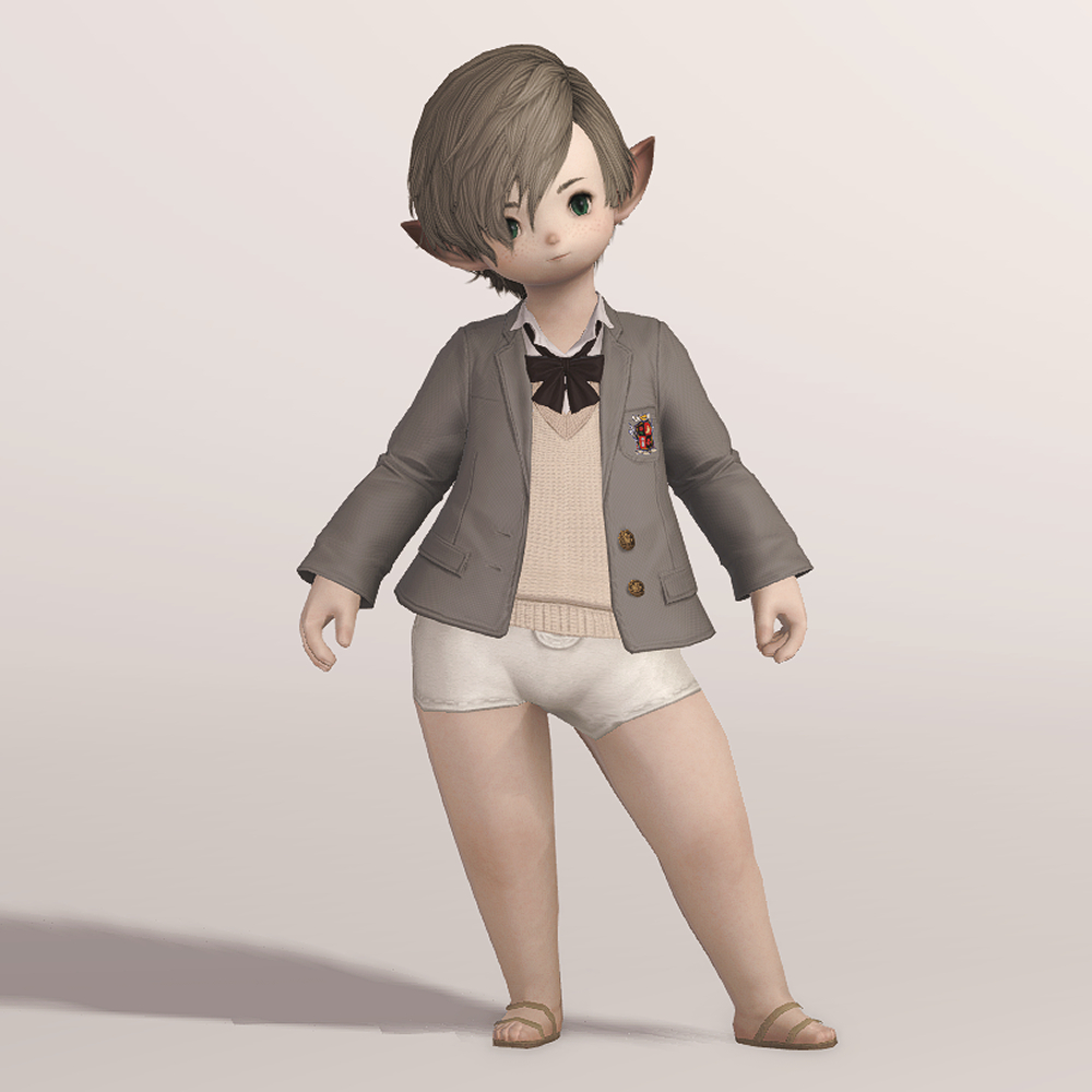 대중적인 블레이저 상의와 베이지색 니트 조끼의 조합으로 전체적으로 단정하면서도 세련된 핏을 자랑하는 교복 상의입니다. 커다란 리본 넥타이가 귀여움을 더해주며 보는 사람을 기준으로 오른쪽 가슴에 위치한 패치 포켓에는 이슈가르드 사대명가를 뜻하는 심볼이 있는데, 이는 각 총사령부의 문장 담당관 NPC에게서 속해있는 자유부대 심볼로 변경이 가능합니다.