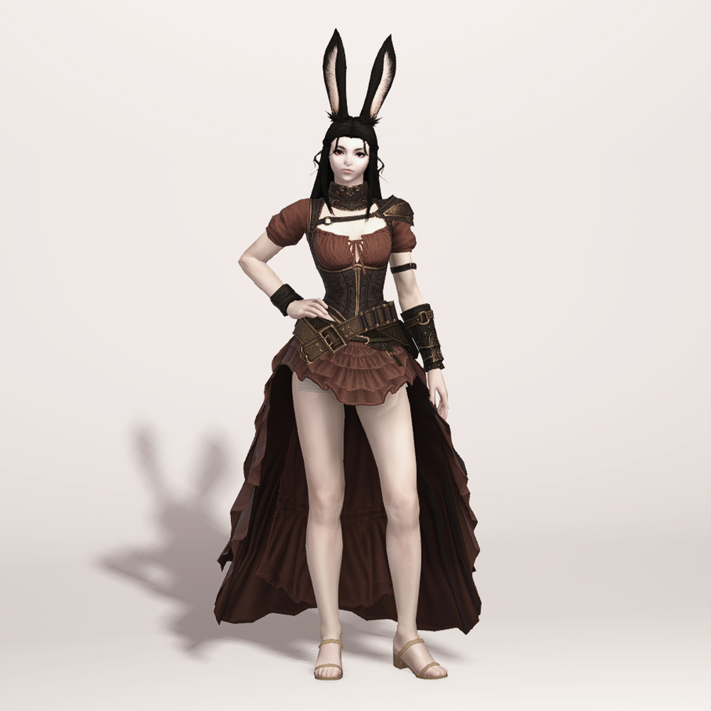 오프숄더 캡소매 원피스로 전체적인 디자인이 오피오타우로스 치유사 상의(여)와 유사하지만 곳곳의 스트랩 벨트와 사선으로 흘러내린 탄대, 보호대 등이 추가되어 우아함보다는 강인함이 느껴집니다. 보는 사람을 기준으로 왼쪽에 살짝 노출된 허리가 포인트로 짧은 프릴 스커트와 함께 양다리가 드러납니다.