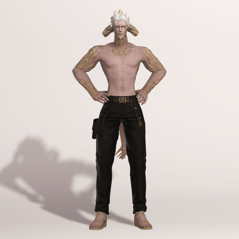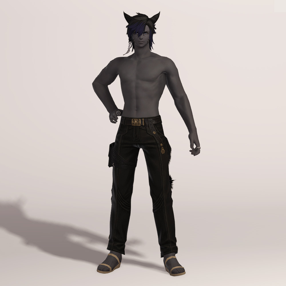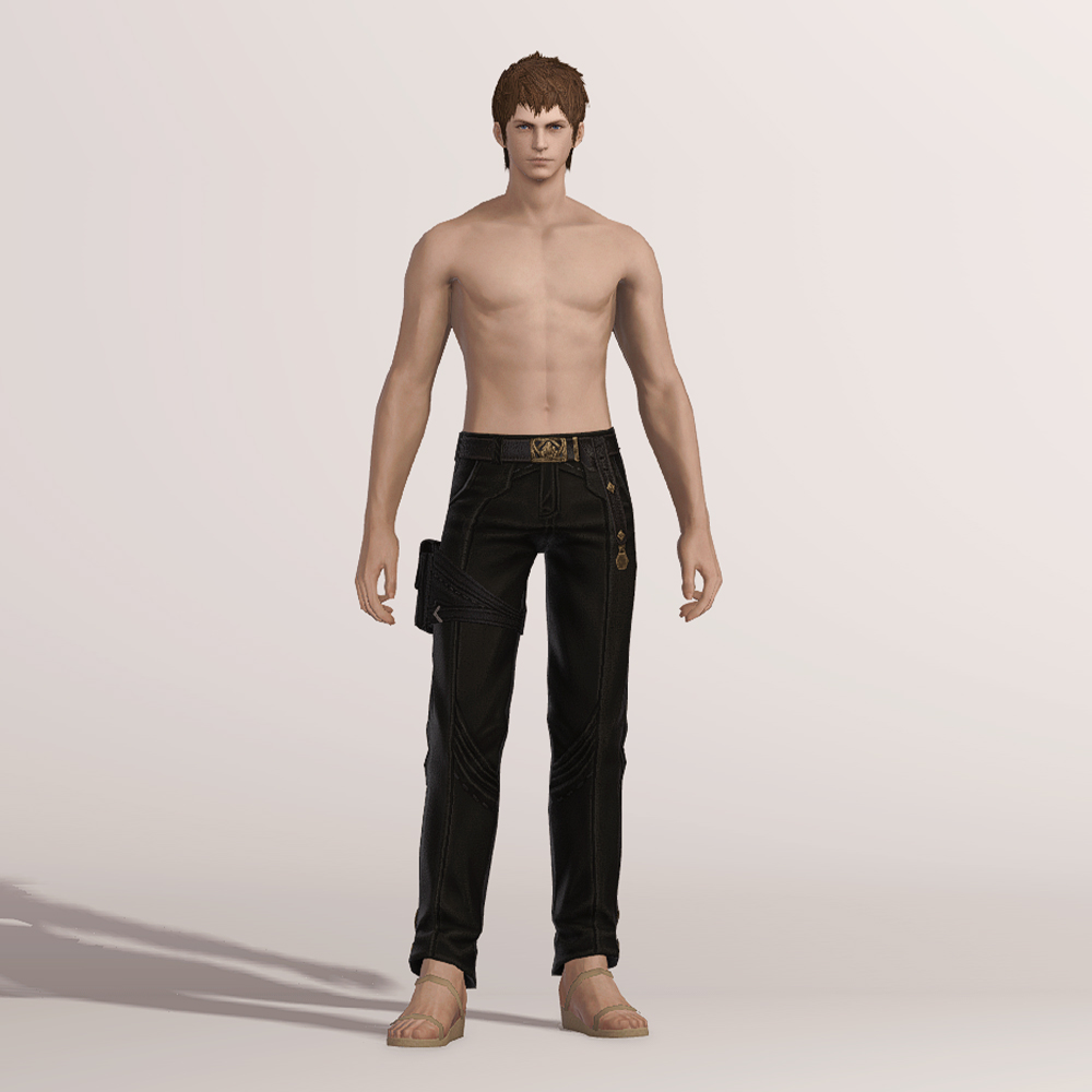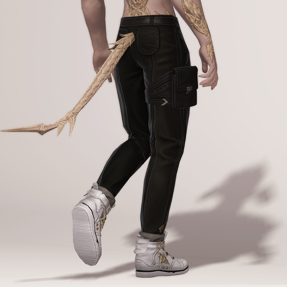 무두질한 오피오타우로스 가죽으로 제작된 슬랙스입니다. 고급스러운 벨트와 함께 보는 사람을 기준으로 왼쪽 허벅지에 차고 있는 레그 홀스터는 다양한 도구들을 사용하는 제작자의 편리함을 위해서 손이 닿기 쉬운 위치에 고정되어 있습니다. 바지 밑단 바깥쪽에는 마름모 모양의 장식이 포인트로 들어갔으며, 엉덩이 위쪽에는 스티치와 함께 귀엽게 마감된 2개의 주머니가 있습니다.