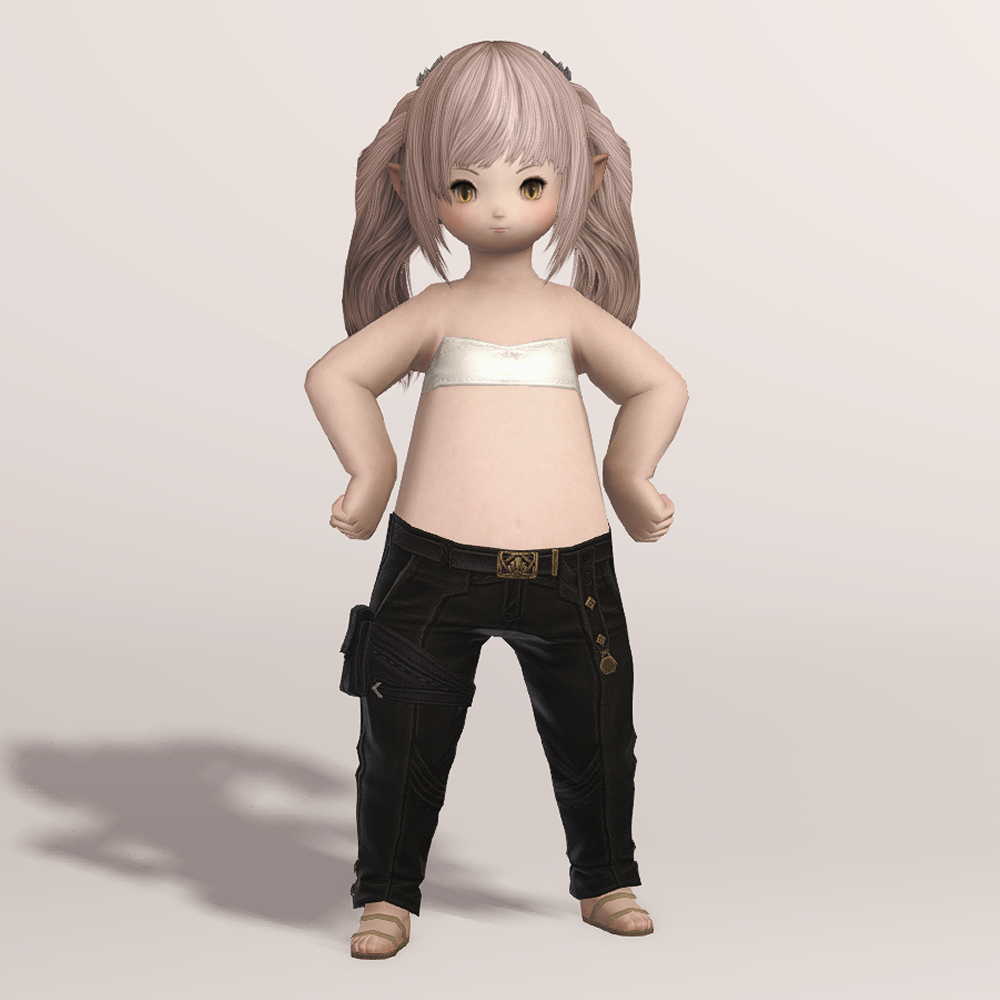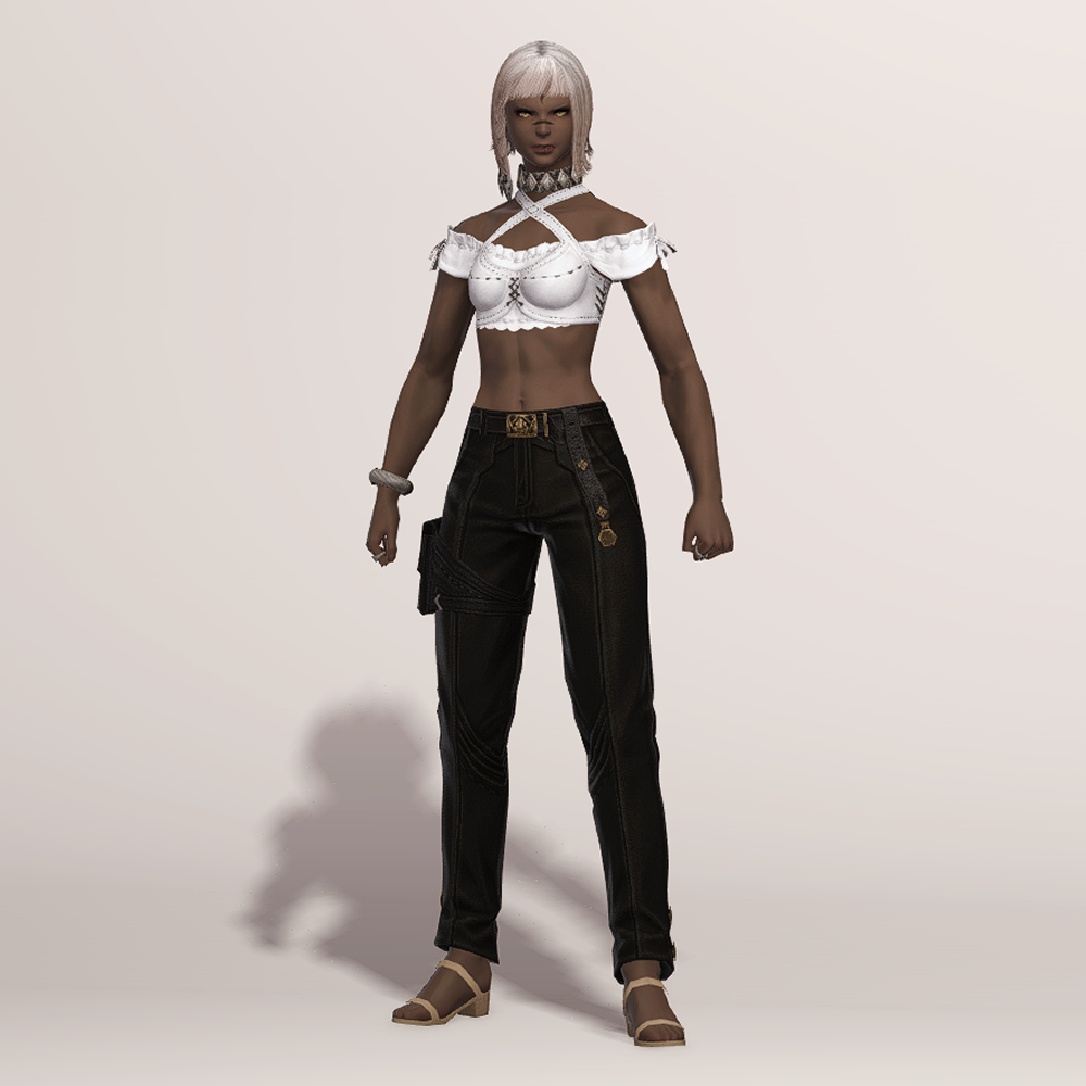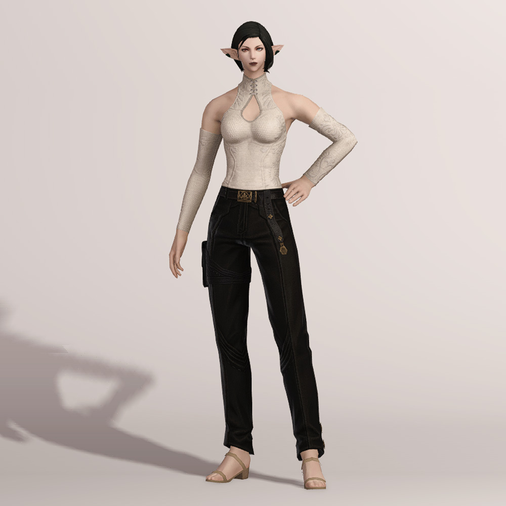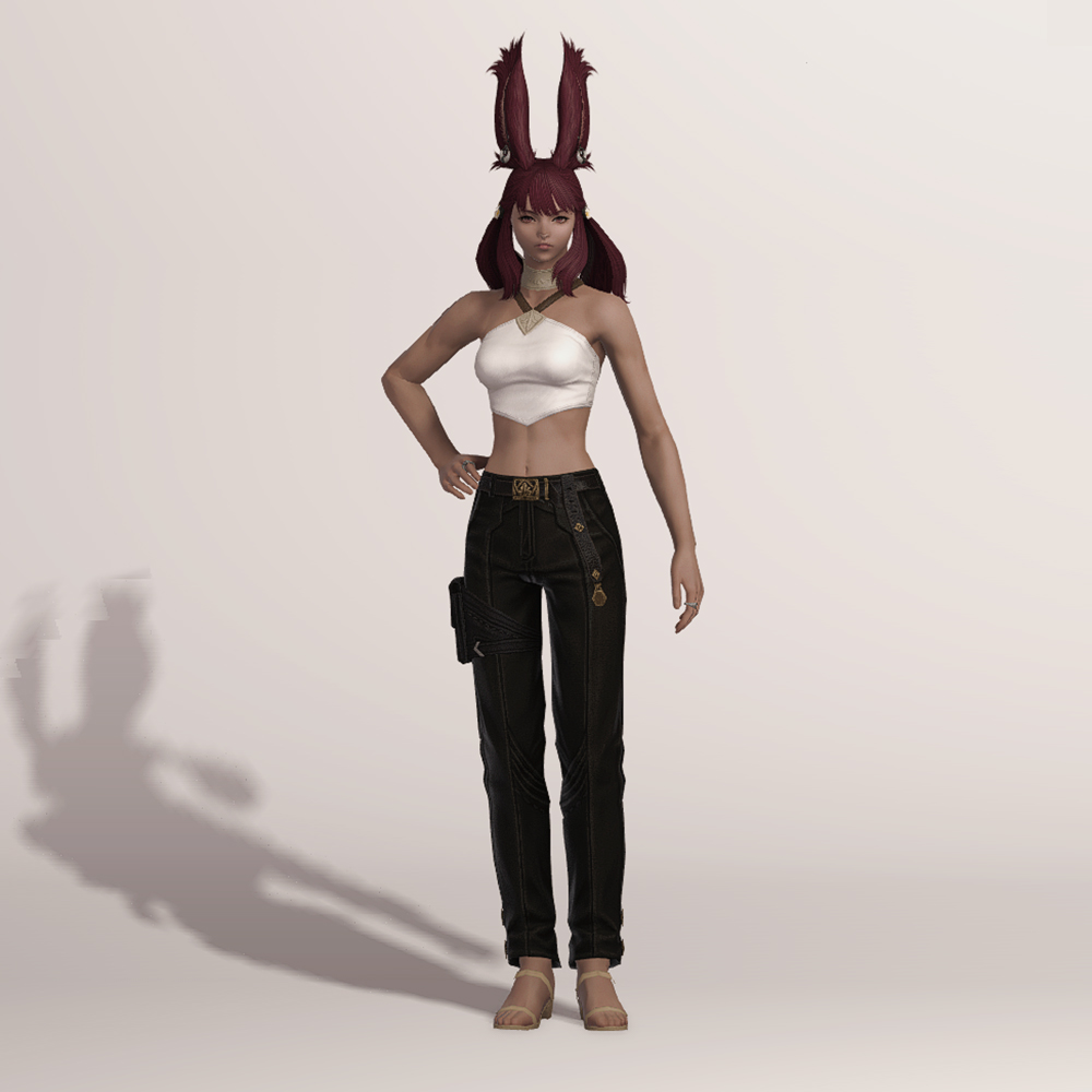 무두질한 오피오타우로스 가죽으로 제작된 슬랙스입니다. 고급스러운 벨트와 함께 보는 사람을 기준으로 왼쪽 허벅지에 차고 있는 레그 홀스터는 다양한 도구들을 사용하는 제작자의 편리함을 위해서 손이 닿기 쉬운 위치에 고정되어 있습니다. 바지 밑단 바깥쪽에는 마름모 모양의 장식이 포인트로 들어갔으며, 엉덩이 위쪽에는 스티치와 함께 귀엽게 마감된 2개의 주머니가 있습니다.