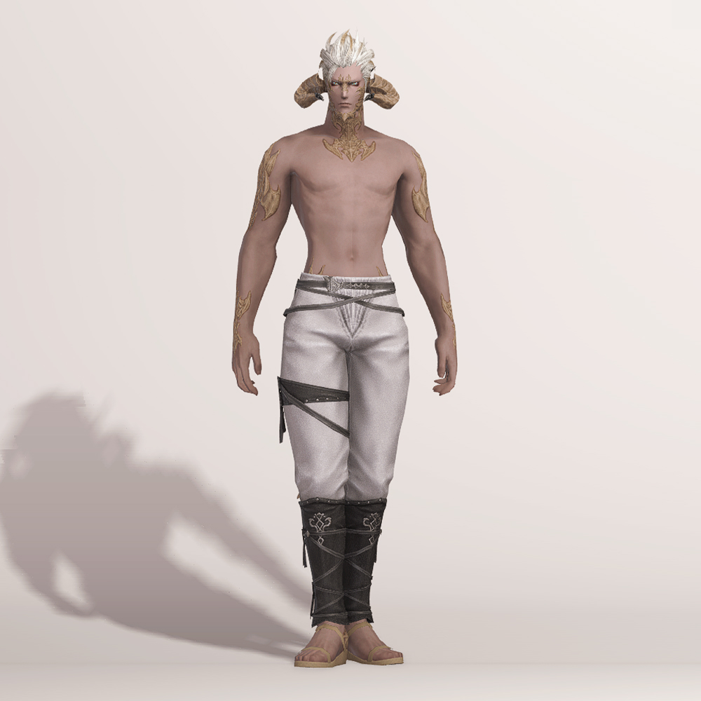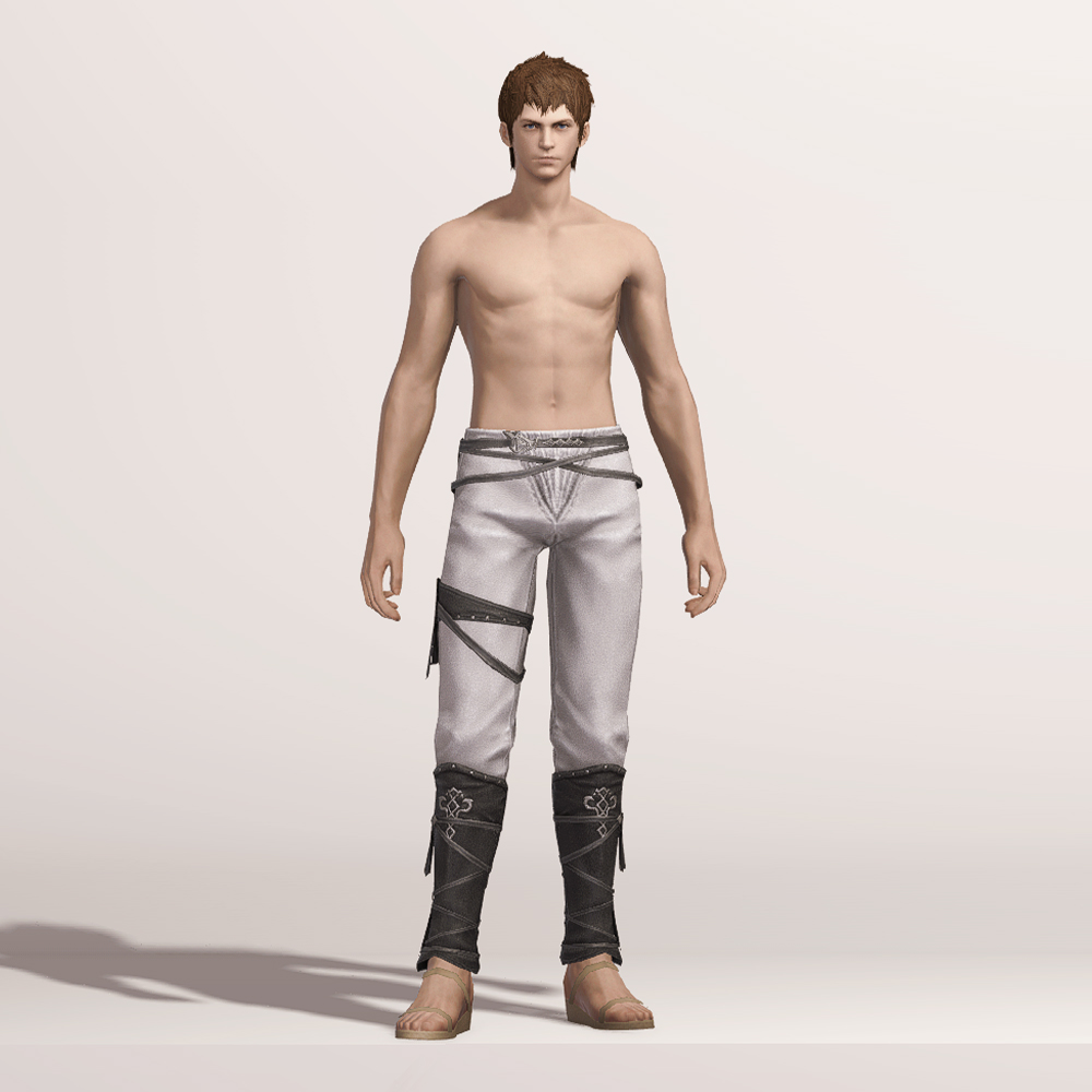 승마 바지의 일종 중 하나인 브리치스입니다. 깔끔한 바지와 함께 보는 사람을 기준으로 왼쪽 허벅지의 가터링과 허리와 종아리의 스트랩 등을 이용해 밋밋하지 않도록 포인트를 줬습니다. 무릎 밑의 종아리 보호대가 거슬릴 경우, 반역자 장화처럼 무릎 아래까지 올라오는 부츠와 매치하시는 것을 추천드립니다.