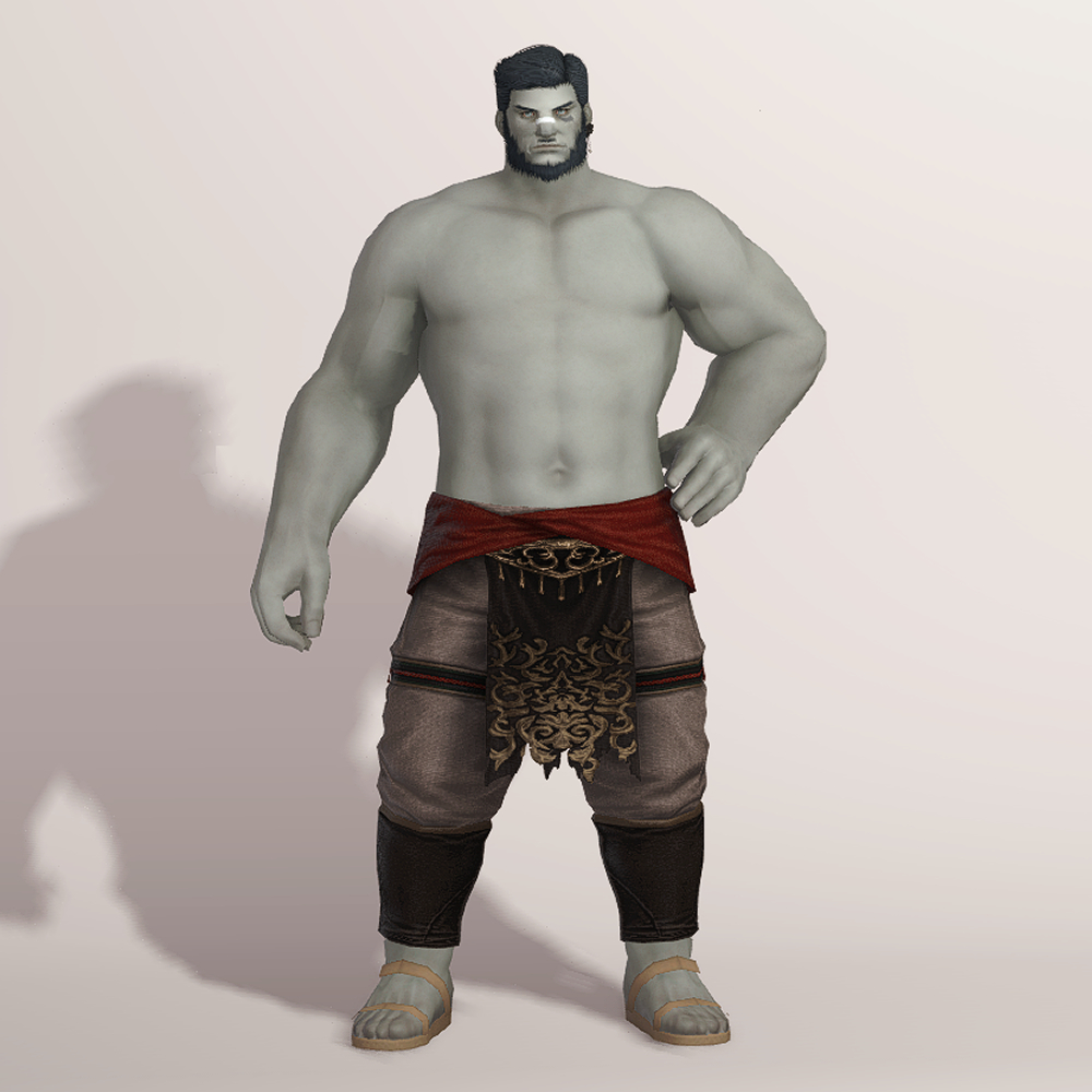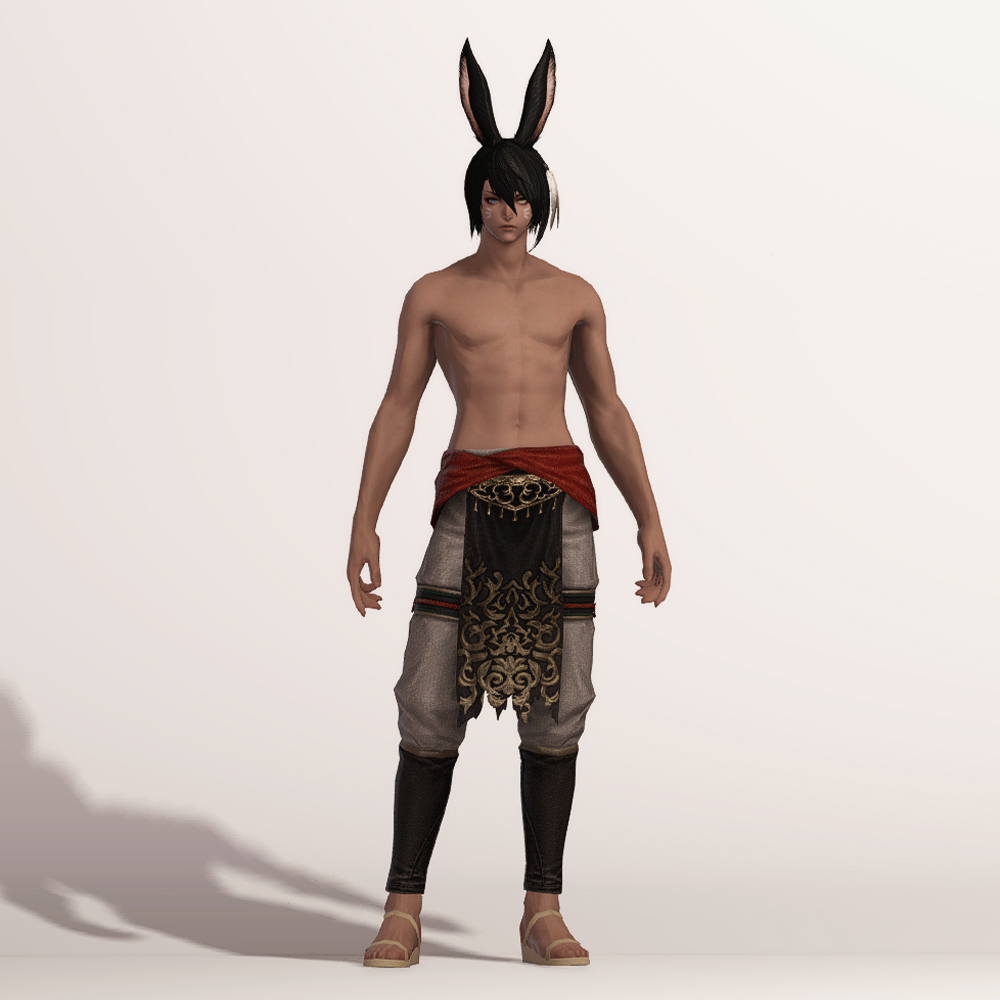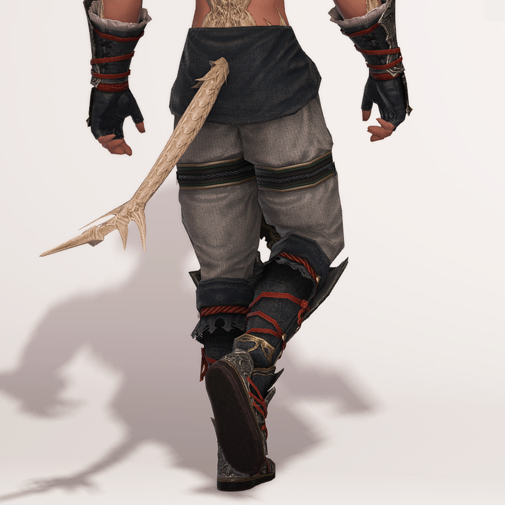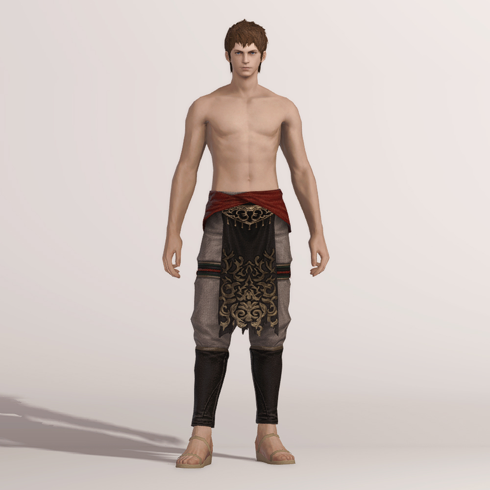 잦은 움직임으로부터 편리하도록 만들어진 조거팬츠 스타일의 하의입니다. 골반에 둘러진 붉은 천과 함께 길게 늘어뜨려진 검은색 천에는 금박 자수가 디테일하게 수놓아져 있으며, 끝자락은 불에 타 없어진 듯 뜯겨져 있습니다. 몽크라는 직업답게, 다리도 무기로 사용하기 때문에 보호를 목적으로 종아리에 둘러진 가죽 보호대는 튼튼해 보이며 동시에 사용감이 느껴집니다.