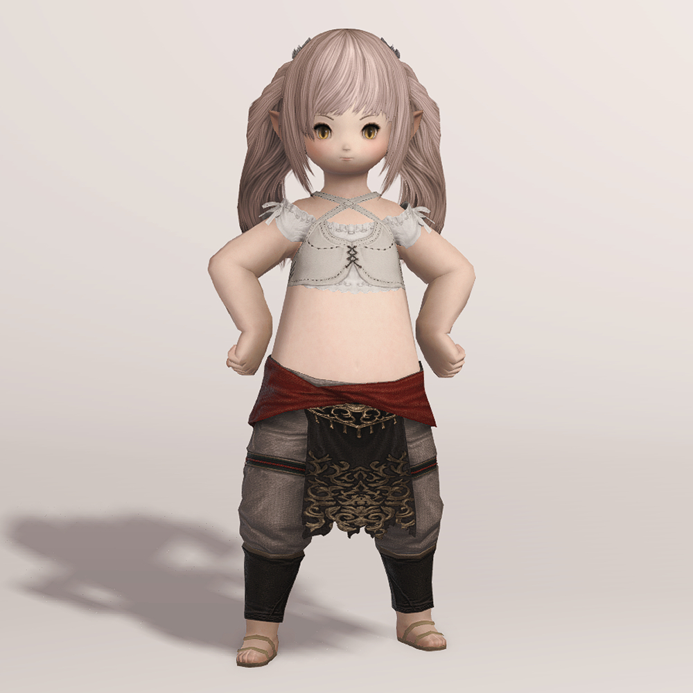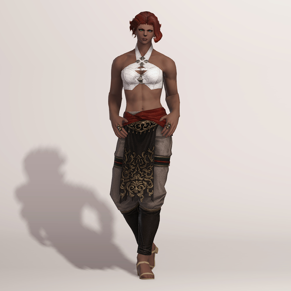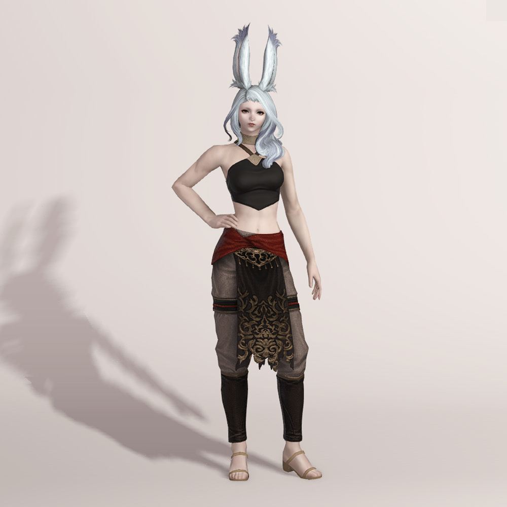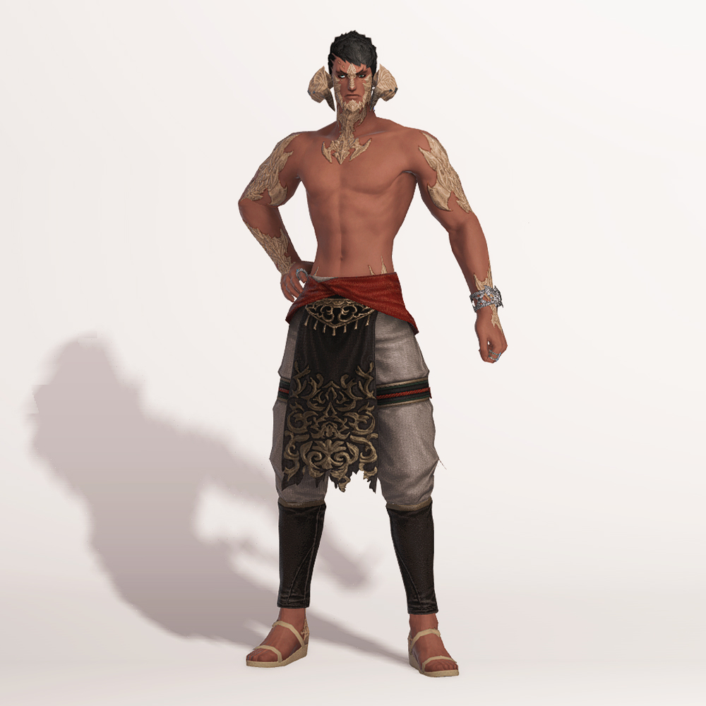 잦은 움직임으로부터 편리하도록 만들어진 조거팬츠 스타일의 하의입니다. 골반에 둘러진 붉은 천과 함께 길게 늘어뜨려진 검은색 천에는 금박 자수가 디테일하게 수놓아져 있으며, 끝자락은 불에 타 없어진 듯 뜯겨져 있습니다. 몽크라는 직업답게, 다리도 무기로 사용하기 때문에 보호를 목적으로 종아리에 둘러진 가죽 보호대는 튼튼해 보이며 동시에 사용감이 느껴집니다.