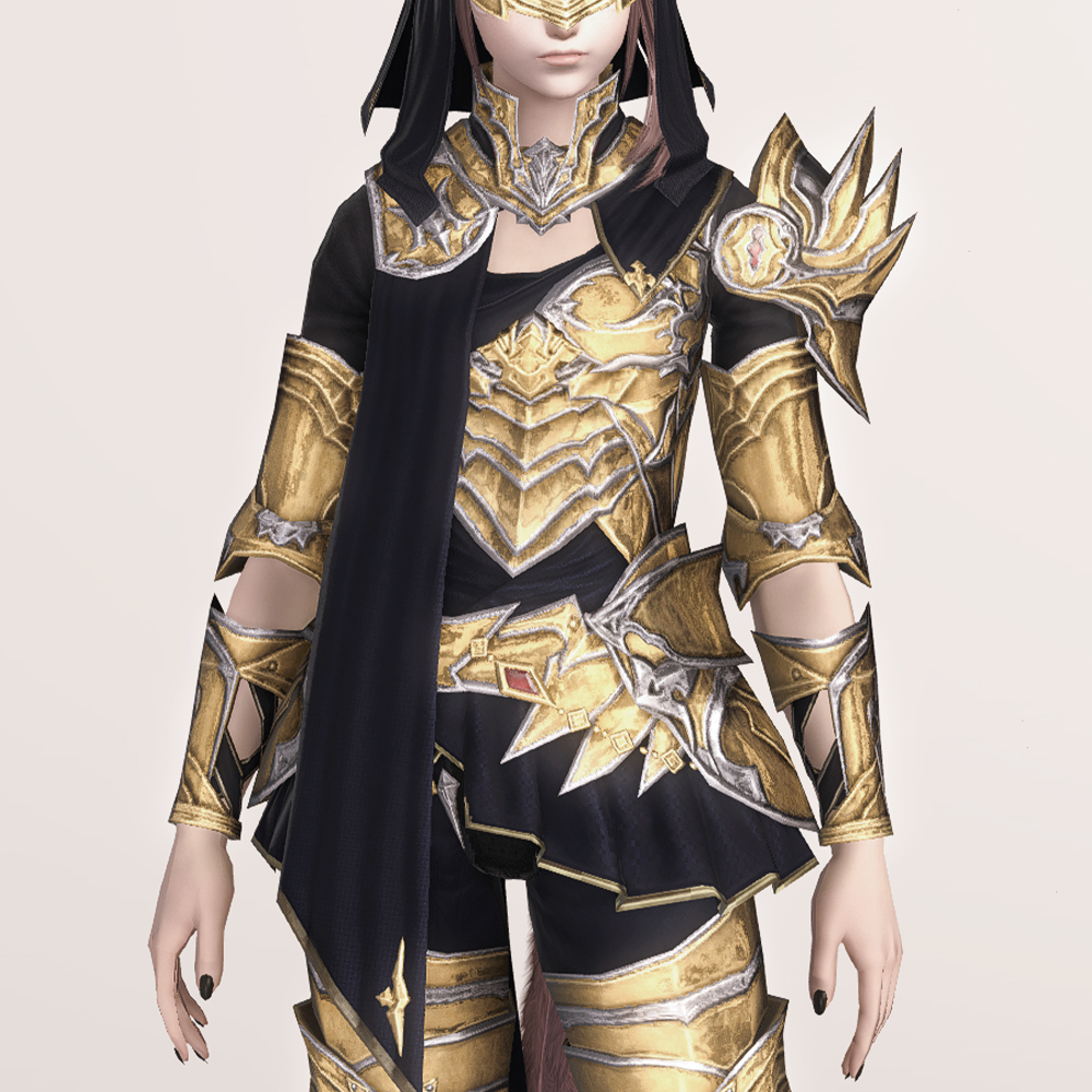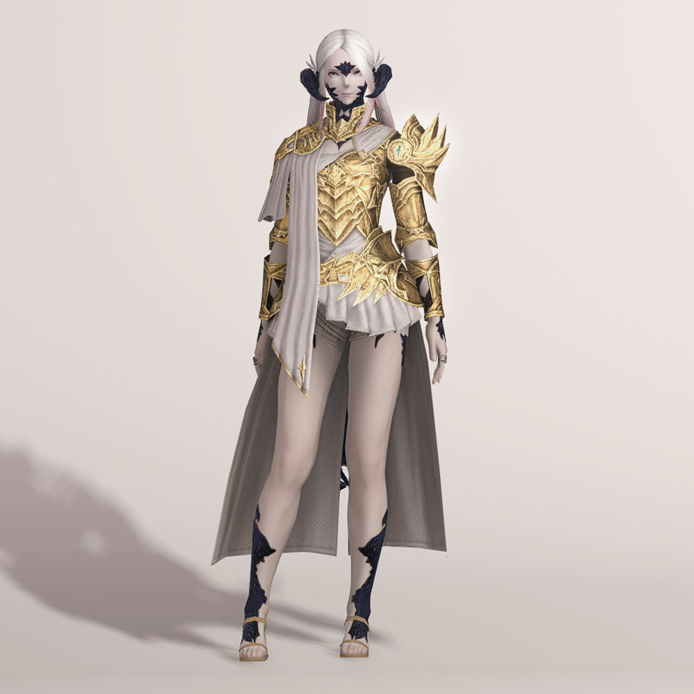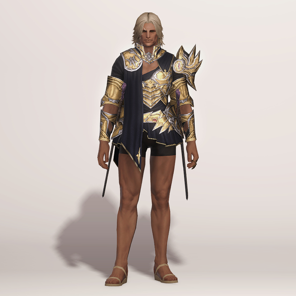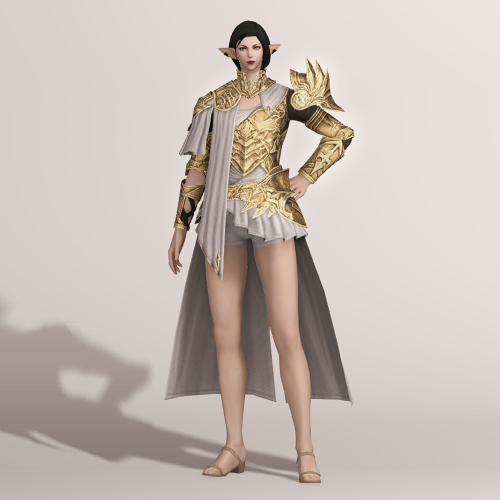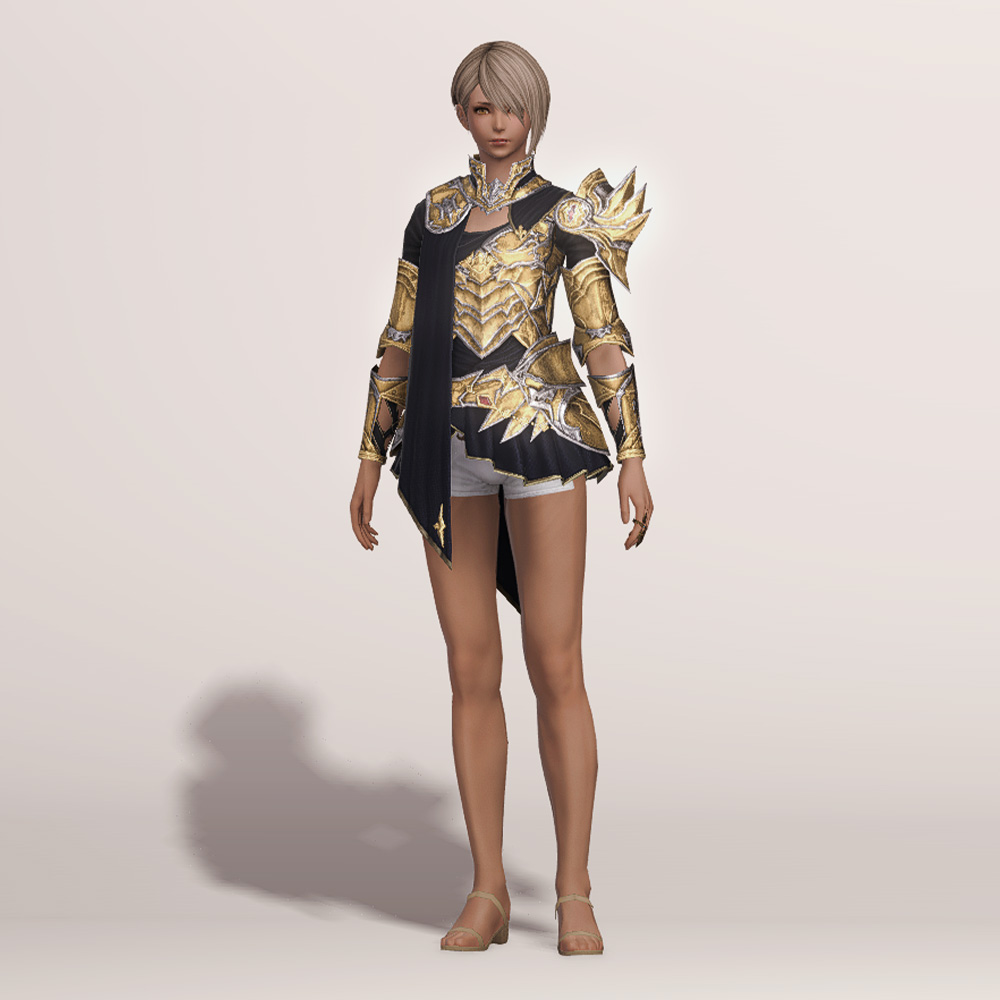 양쪽 어깨가 언밸런스하며 신축성이 좋아 보이는 상의에 팔을 보호할 수 있는 뱀 브레이스와 상체를 보호할 수 있는 브레스트 플레이트 등의 갑옷들로 이루어져 있어 공격으로부터 안전하며, 관절이 꺾이는 부분들은 비어두어 활동이 자유롭습니다. 전체적으로 디테일하면서도 고풍스러운 디자인과 함께 드레이프 된 천까지 더해져 외관에 많은 신경을 썼다는 점을 알 수 있습니다. 허리 위치에서 사선으로 짧게 내려오는 천은 얼핏 보면 미니스커트처럼 보여 귀엽습니다.
