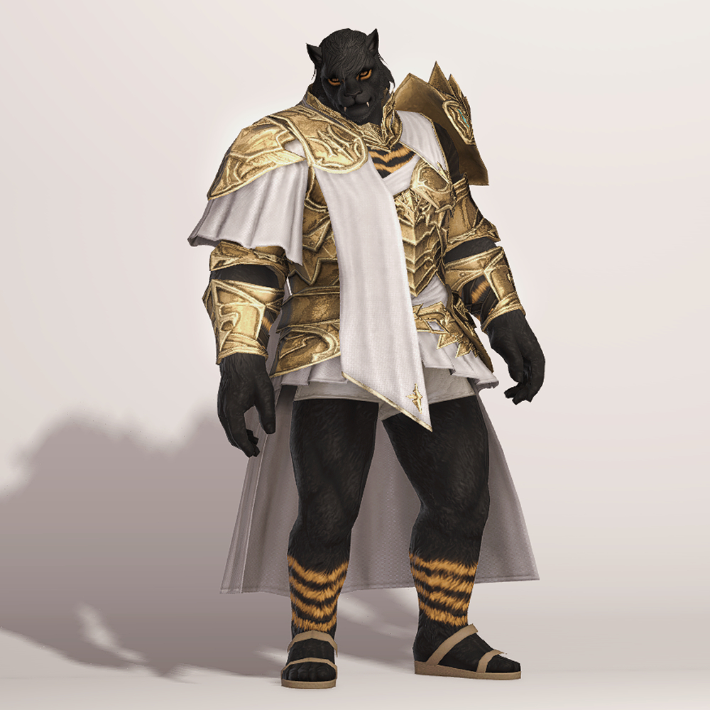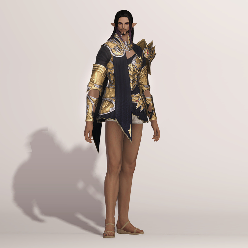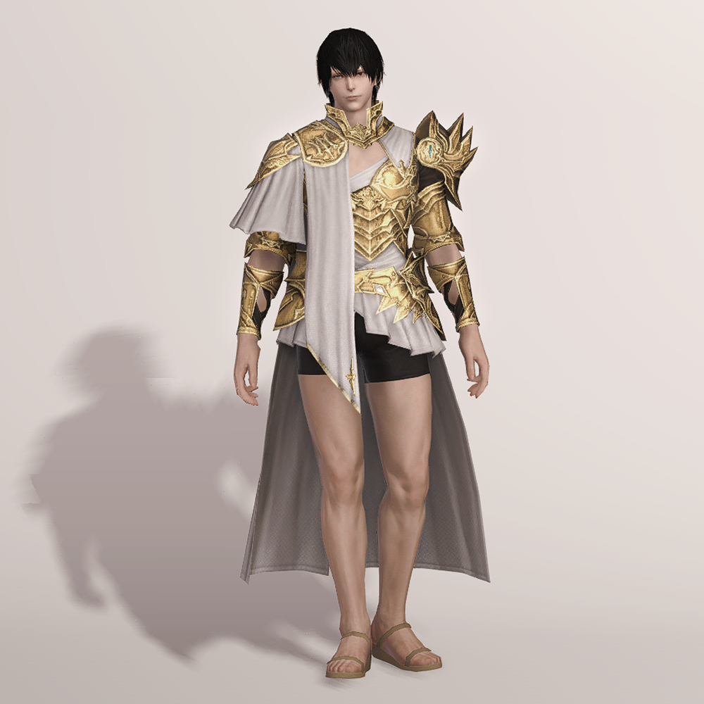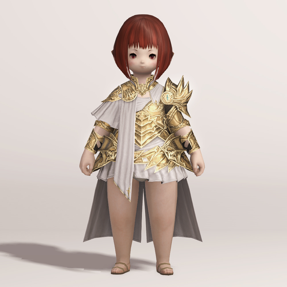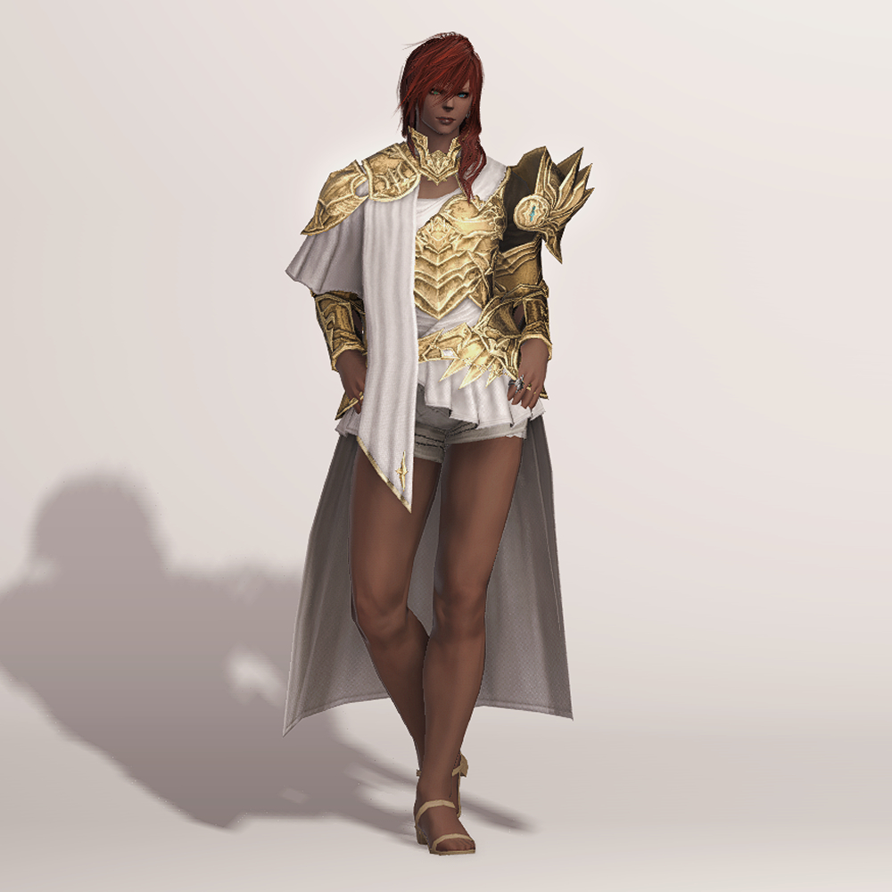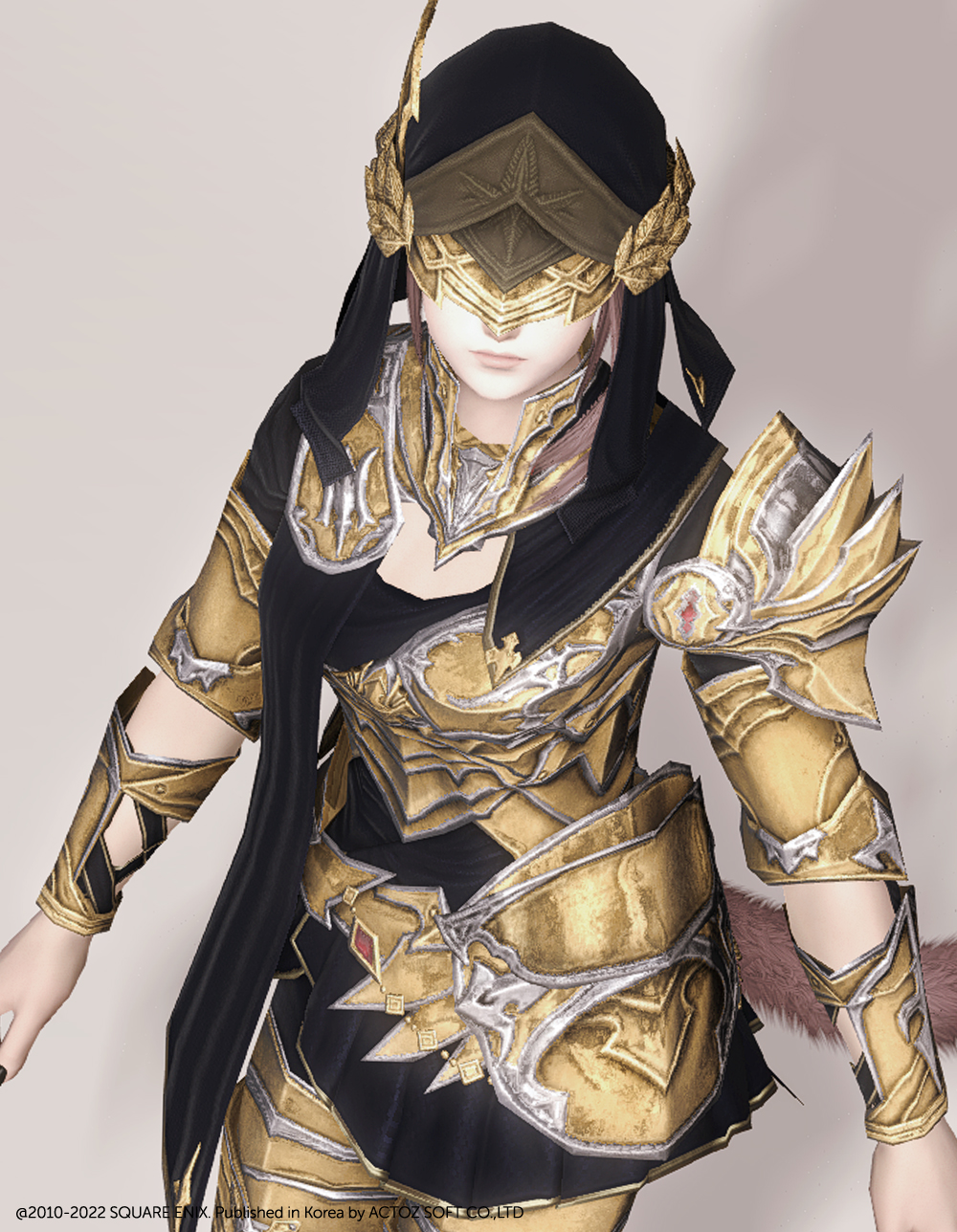 양쪽 어깨가 언밸런스하며 신축성이 좋아 보이는 상의에 팔을 보호할 수 있는 뱀 브레이스와 상체를 보호할 수 있는 브레스트 플레이트 등의 갑옷들로 이루어져 있어 공격으로부터 안전하며, 관절이 꺾이는 부분들은 비어두어 활동이 자유롭습니다. 전체적으로 디테일하면서도 고풍스러운 디자인과 함께 드레이프 된 천까지 더해져 외관에 많은 신경을 썼다는 점을 알 수 있습니다. 허리 위치에서 사선으로 짧게 내려오는 천은 얼핏 보면 미니스커트처럼 보여 귀엽습니다.