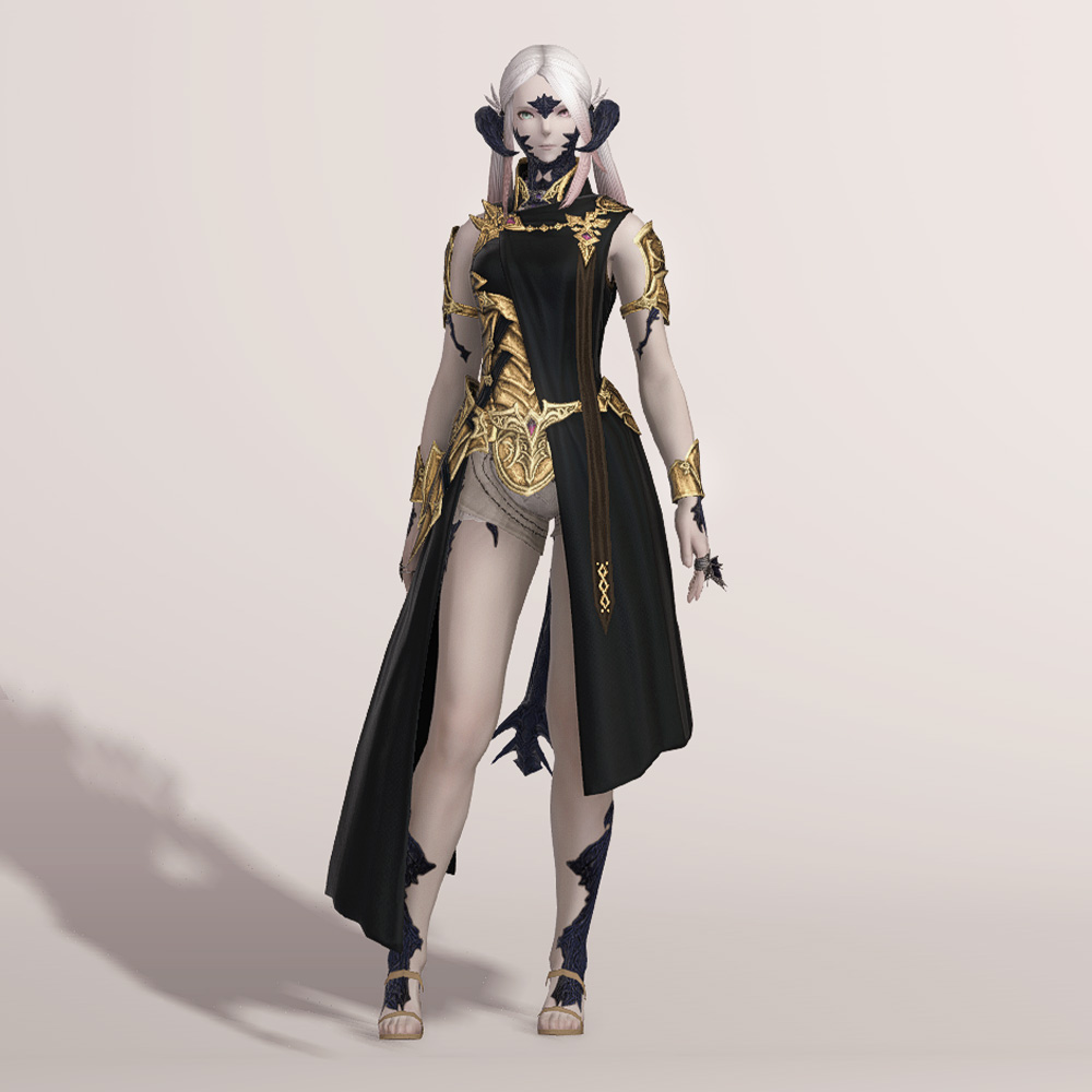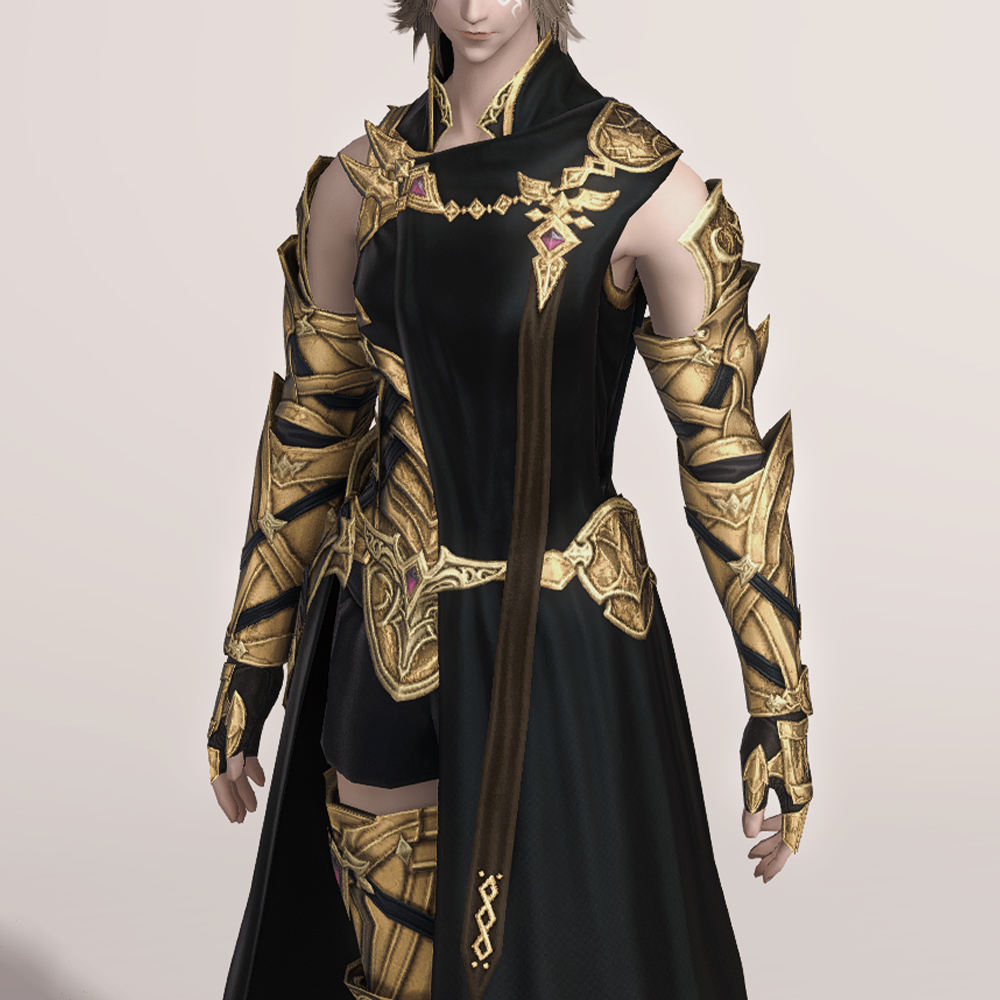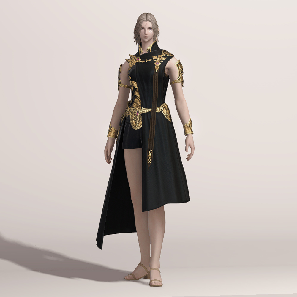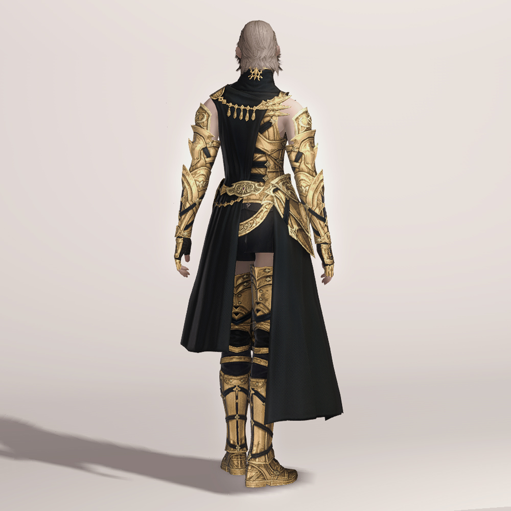 어깨와 겨드랑이를 시원하게 드러낸 민소매에 상체를 보호할 수 있는 흉갑 코슬릿이 가슴과 허리를 꽉 조여 유려한 곡선을 만들어내며, 그 위에 보는 사람을 기준으로 왼쪽 어깨에서 시작해 사선으로 길게 늘어뜨려 무릎까지 내려온 드레이프 된 천은 상체의 절반을 감쌉니다. 허리나 팔뚝, 손목 등의 보호구들이 눈에 띄지만 전체적으로 갑옷치고는 가볍고, 맨살이 노출되는 부위가 많아 활동이 자유로우며 디테일하면서도 고풍스러운 디자인에 외관에 많은 신경을 썼다는 점을 알 수 있습니다. 평소 갑옷 계열을 좋아하지만 온몸을 둘둘 둘러싸매는 것은 부담스럽다고 느끼시는 분들께 추천드립니다.