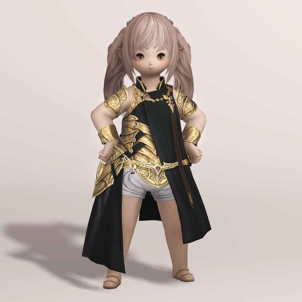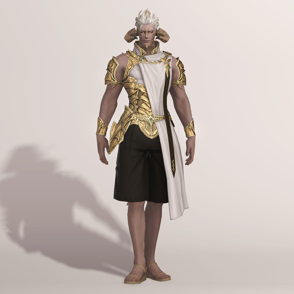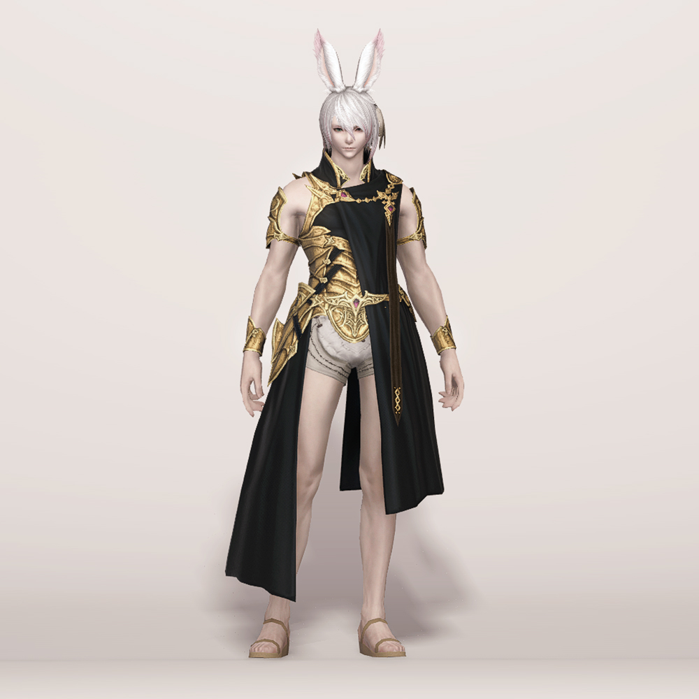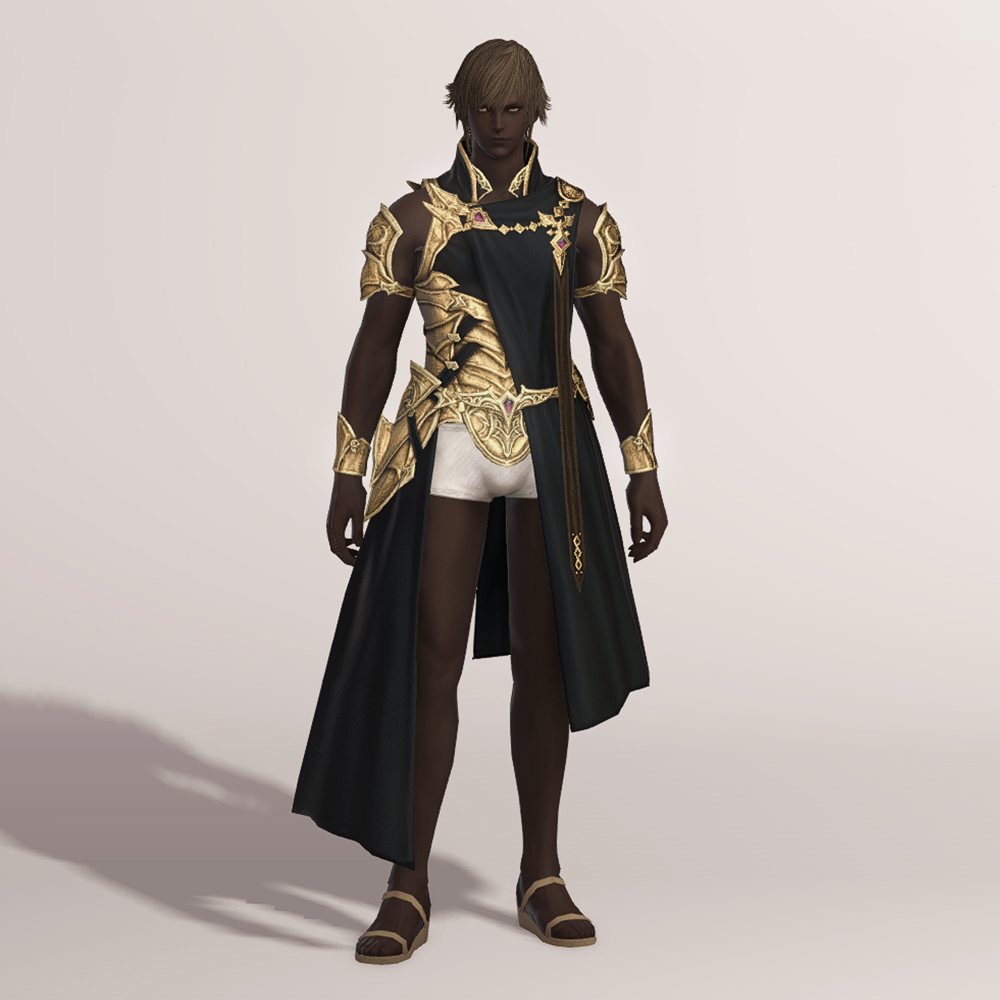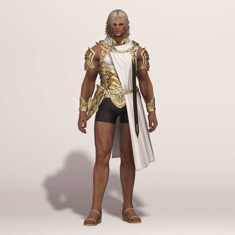 어깨와 겨드랑이를 시원하게 드러낸 민소매에 상체를 보호할 수 있는 흉갑 코슬릿이 가슴과 허리를 꽉 조여 유려한 곡선을 만들어내며, 그 위에 보는 사람을 기준으로 왼쪽 어깨에서 시작해 사선으로 길게 늘어뜨려 무릎까지 내려온 드레이프 된 천은 상체의 절반을 감쌉니다. 허리나 팔뚝, 손목 등의 보호구들이 눈에 띄지만 전체적으로 갑옷치고는 가볍고, 맨살이 노출되는 부위가 많아 활동이 자유로우며 디테일하면서도 고풍스러운 디자인에 외관에 많은 신경을 썼다는 점을 알 수 있습니다. 평소 갑옷 계열을 좋아하지만 온몸을 둘둘 둘러싸매는 것은 부담스럽다고 느끼시는 분들께 추천드립니다.