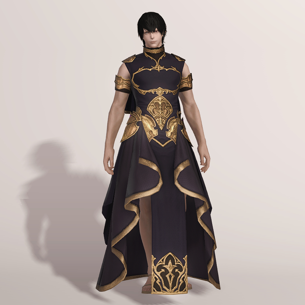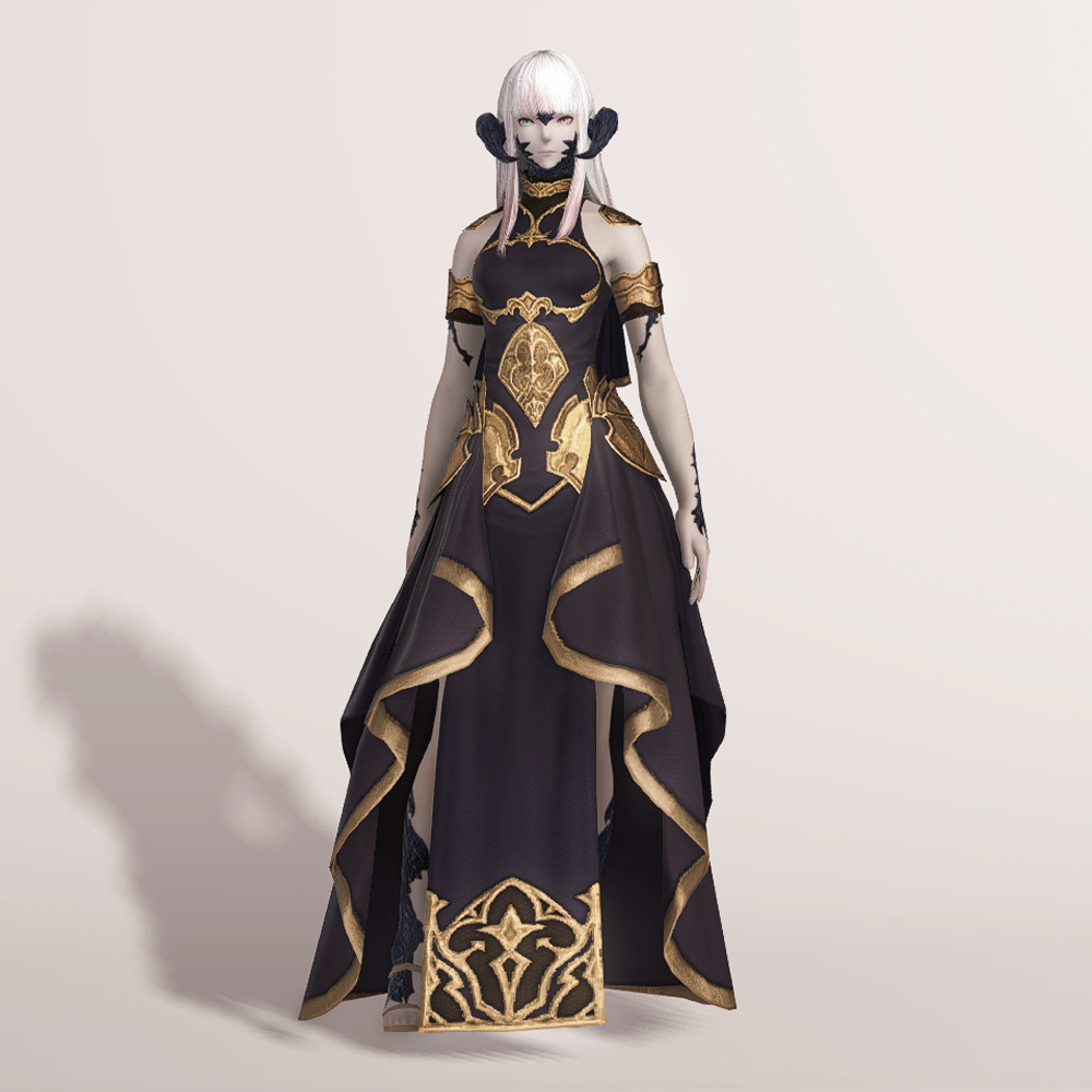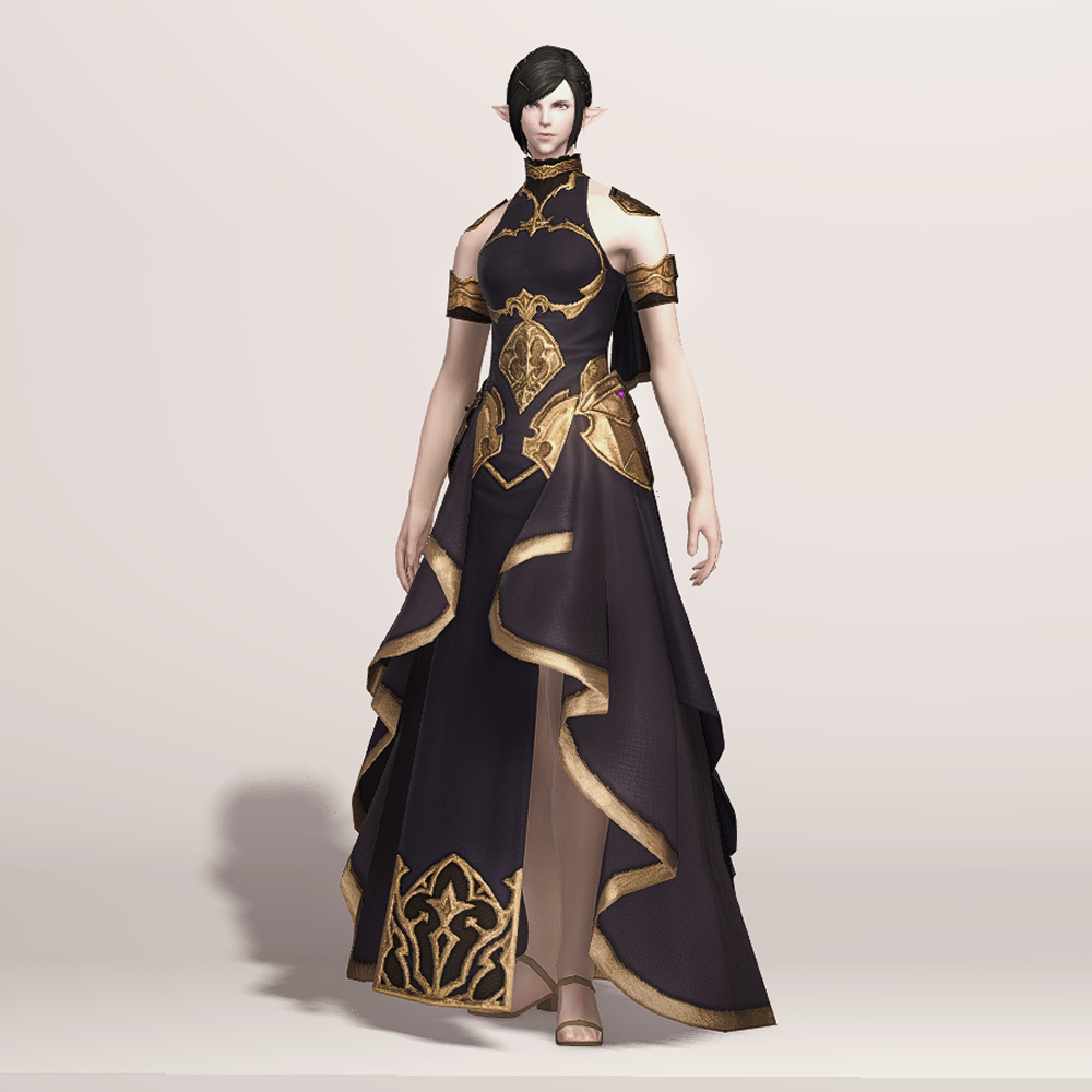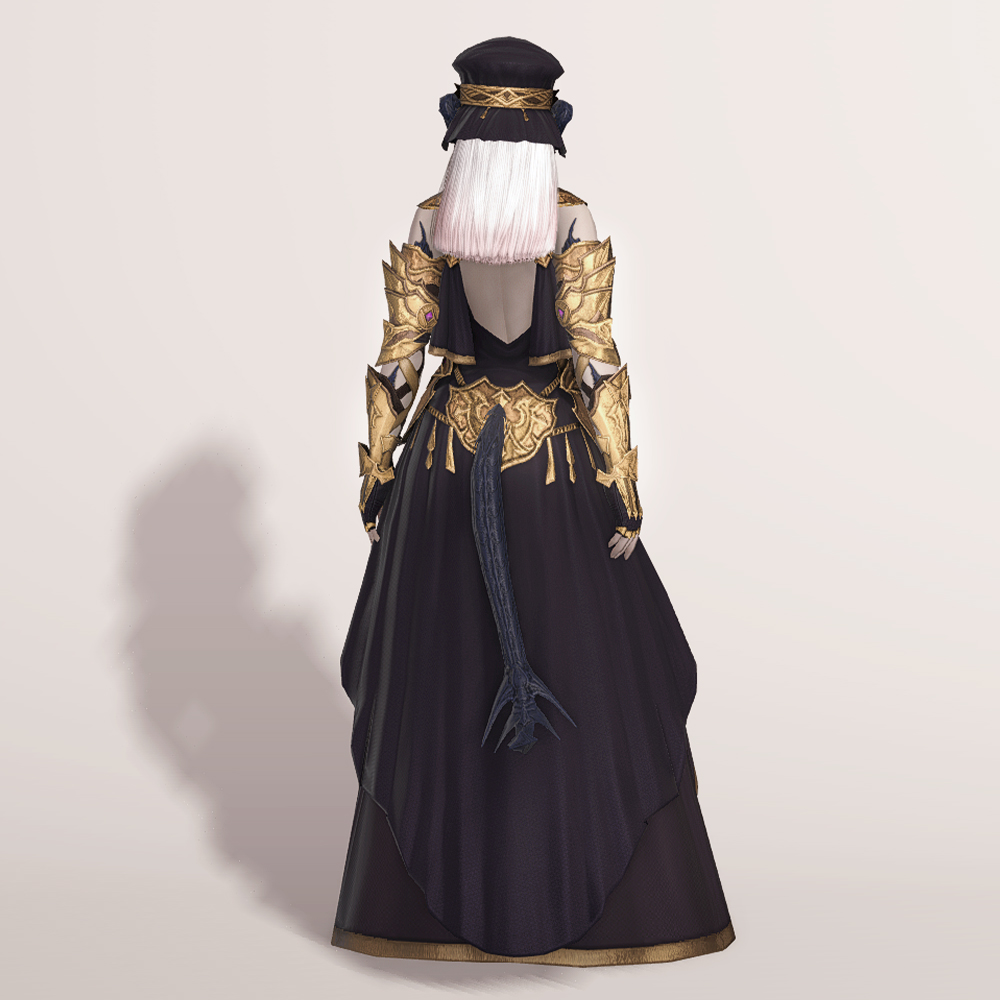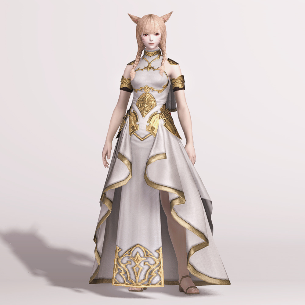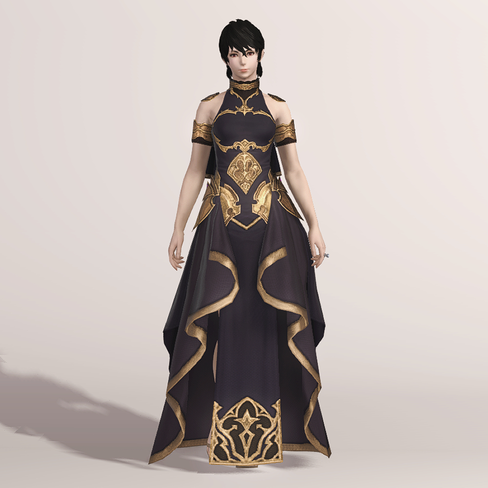 몸에 달라붙는 상의에 어깨와 허리춤에 천을 달아 길게 늘어트려 드레이프 된 천으로 풍성한 하의를 만들어낸 민소매 터틀넥 원피스입니다. 목, 어깨, 팔, 허리 등 다양한 부위에 황금 장식을 얹어 전체적으로 화려하면서도 고풍스러운 외관을 자랑해 신성한 느낌이 들면서도 동시에 강조된 상체라던가, 훤히 노출되어 있는 팔과 다리, 그리고 아주 시원하게 드러난 등짝을 보면...배덕적입니다. 노출을 사랑하는 분들께 적극적으로 추천하며, 메그 야카 머리장식이나 나찰 마술사 관, 사베네어 팔덮개 등 금속과 천으로 제작된 아이템과 매치하면 잘 어울려 추천드립니다.