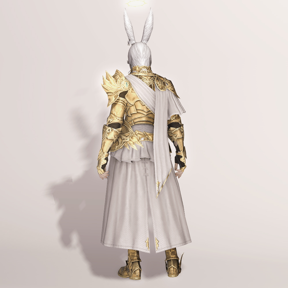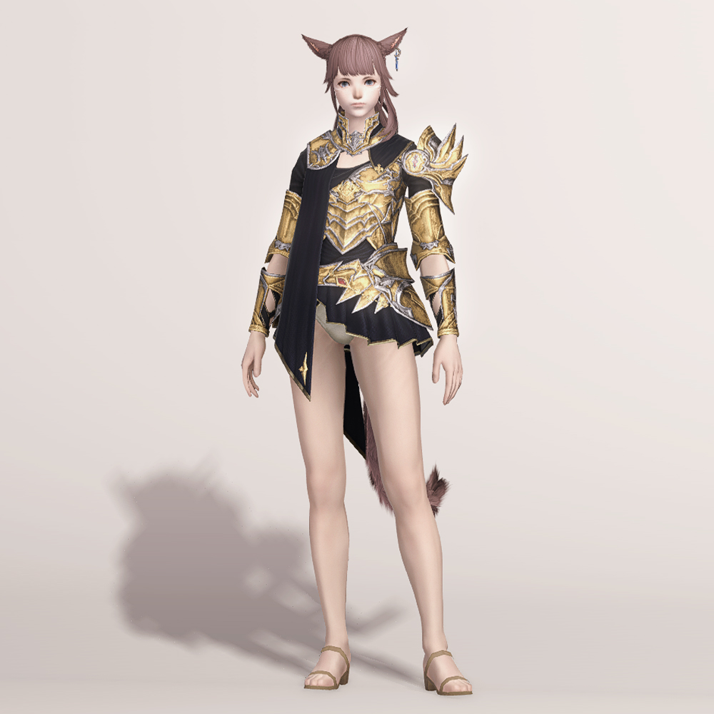 양쪽 어깨가 언밸런스하며 신축성이 좋아 보이는 상의에 팔을 보호할 수 있는 뱀 브레이스와 상체를 보호할 수 있는 브레스트 플레이트 등의 갑옷들로 이루어져 있어 공격으로부터 안전하며, 관절이 꺾이는 부분들은 비어두어 활동이 자유롭습니다. 전체적으로 디테일하면서도 고풍스러운 디자인과 함께 드레이프 된 천까지 더해져 외관에 많은 신경을 썼다는 점을 알 수 있습니다. 허리 위치에서 사선으로 짧게 내려오는 천은 얼핏 보면 미니스커트처럼 보여 미니 원피스처럼 연출도 가능합니다.