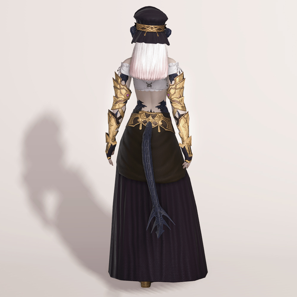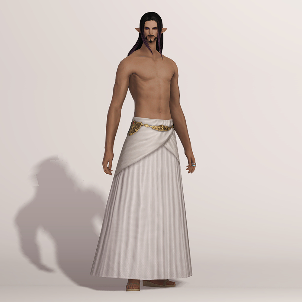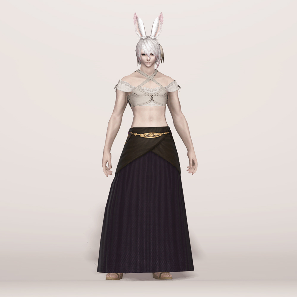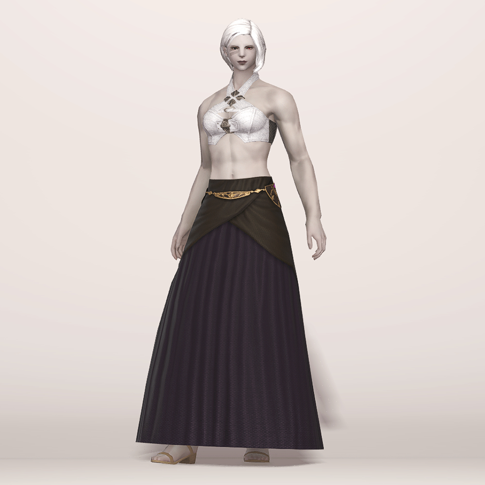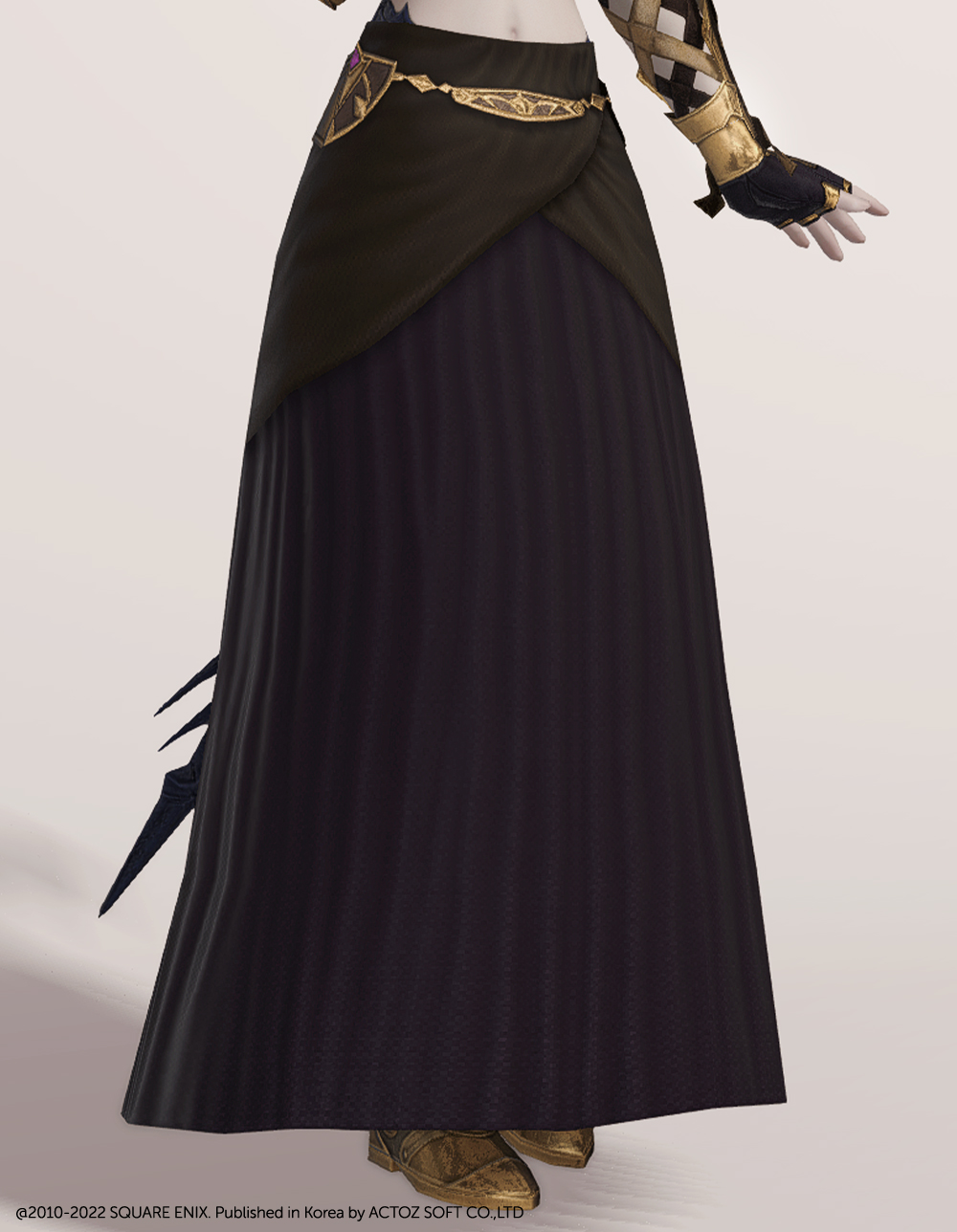 허리에서 발등까지 길게 내려오는 플리츠스커트입니다. 동방 미인의 치마, 풍아 바지와 유사해 하카마 느낌도 납니다. 허리에 덧댄 천과 함께 화려한 금속 장식을 더해 밋밋하지 않게 포인트를 줬습니다. 장식이나 덧댄 천이 조금 거슬리지만 스커트의 주름이 예쁘게 잘 나와 긴 상의와 매치하면 깔끔하게 가릴 수 있어 다양하게 활용할 수 있습니다. 이발리스 제사장 외투나 봄처녀 드레스와 잘 어울려 추천드립니다.