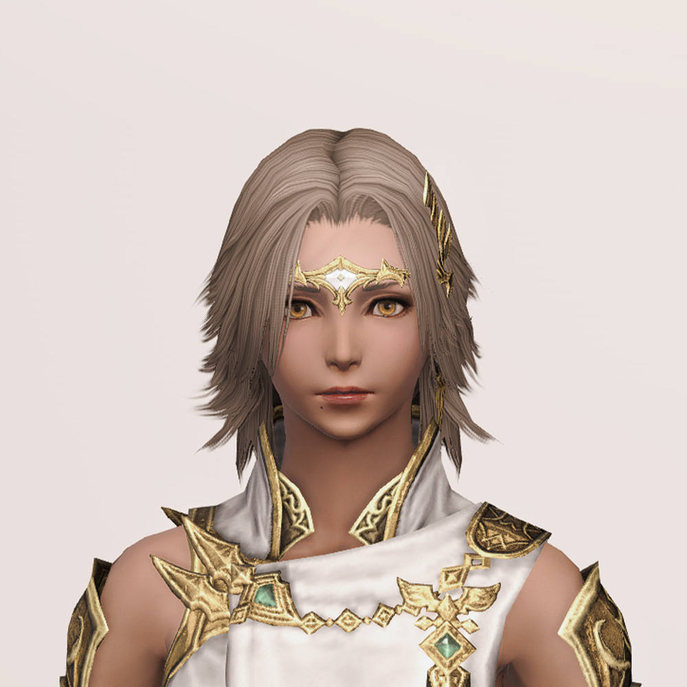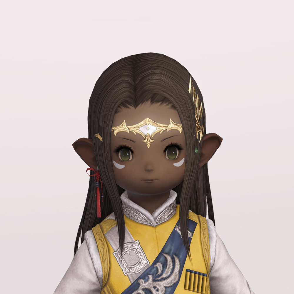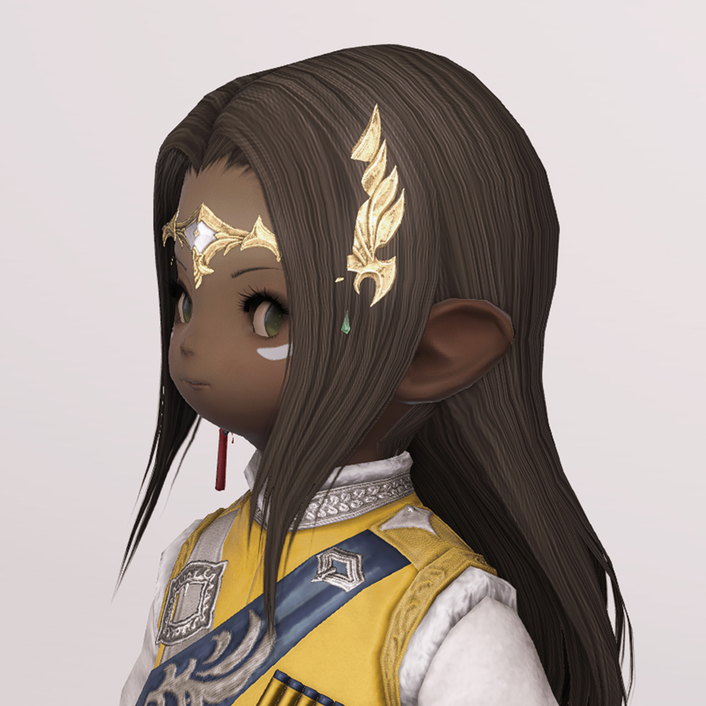머리에 살짝 걸치게 쓰는 좁은 띠 형태의 금속관, 서클릿입니다. 보는 사람을 기준으로 오른쪽에 날개 장식이 있으며, 이마 중앙과 날개 장식 끝에 끝에 보석이 달려 있습니다. 날개 장식에 의해서 묘하게 발키리가 떠오릅니다. 앞머리가 있는 경우 서클릿과 장식이 묻혀 조금만 보입니다.