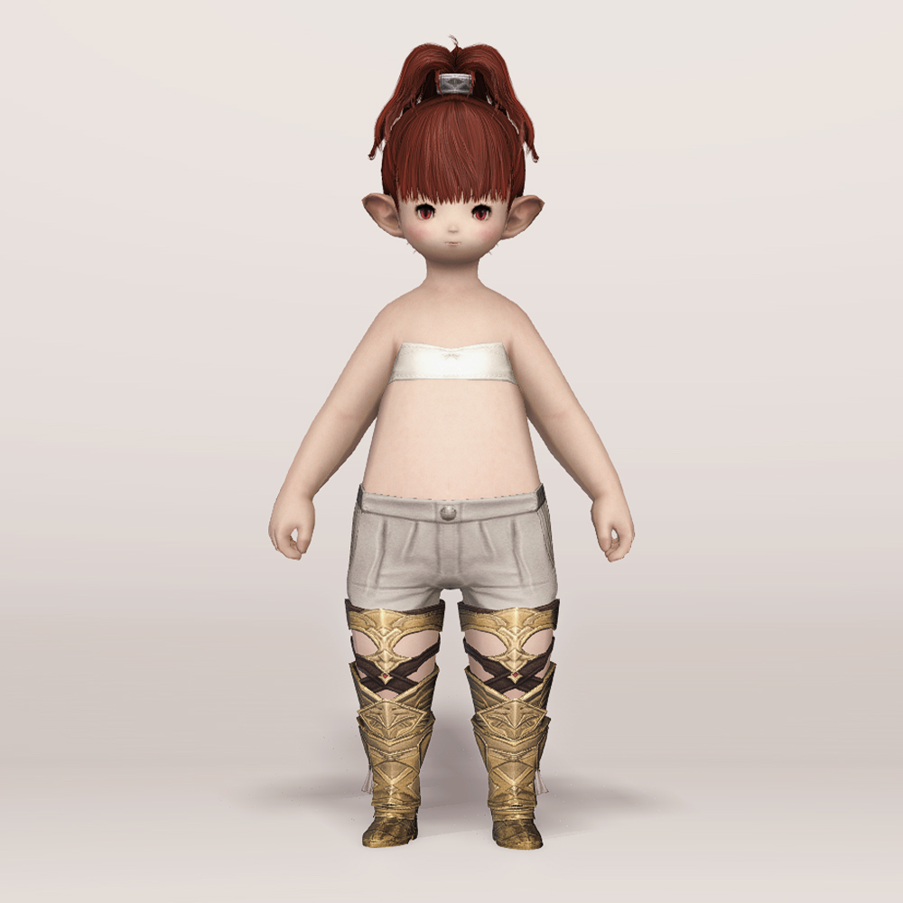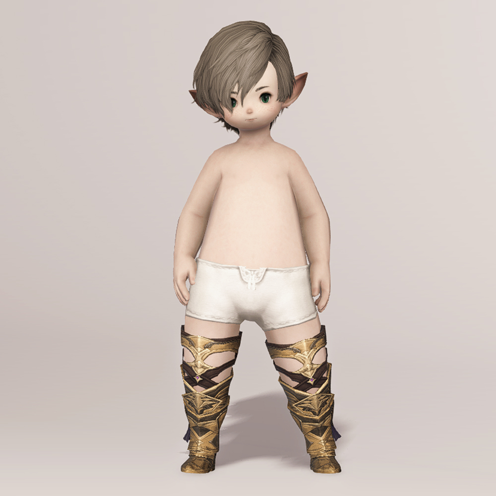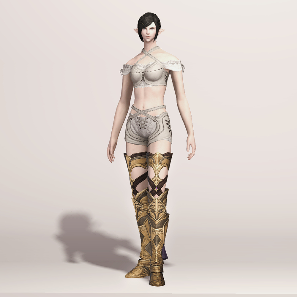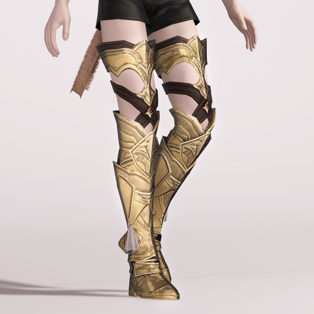 니삭스 위에 정강이와 종아리를 보호할 수 있는 갑옷인 그리브와 발을 보호할 수 있는 사바톤으로 이루어진 보호구입니다. 무릎 위의 엑스 자 모양의 스트랩과 함께 노출되는 허벅지와 양 발목 위에 달려있는 귀여운 천 장식이 포인트입니다. 일반적인 갑옷 다리 보호구에 비해서는 비교적 슬림한 편입니다. 달여행 치유사 상의와 꽤 잘 어울립니다.
