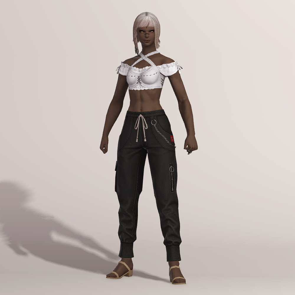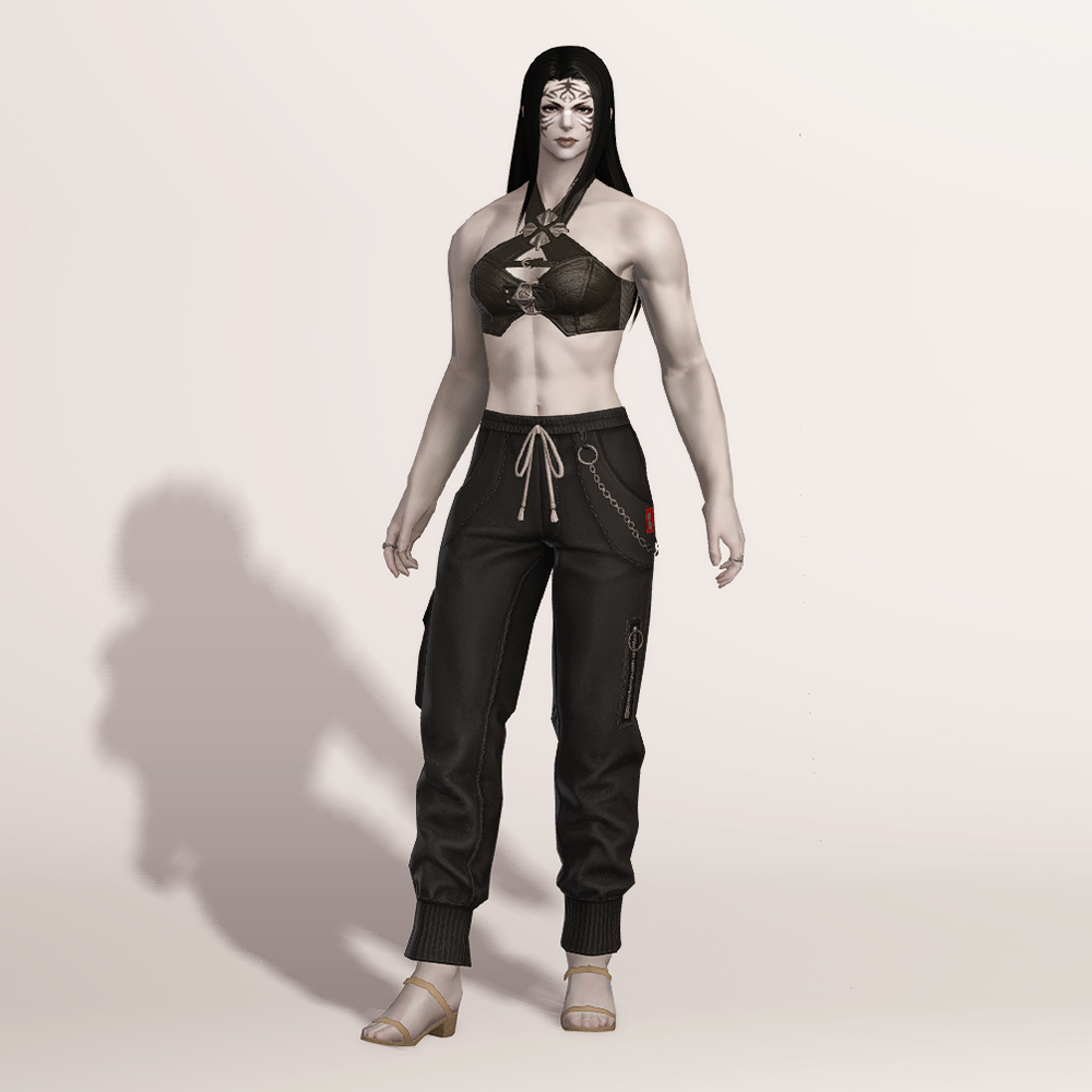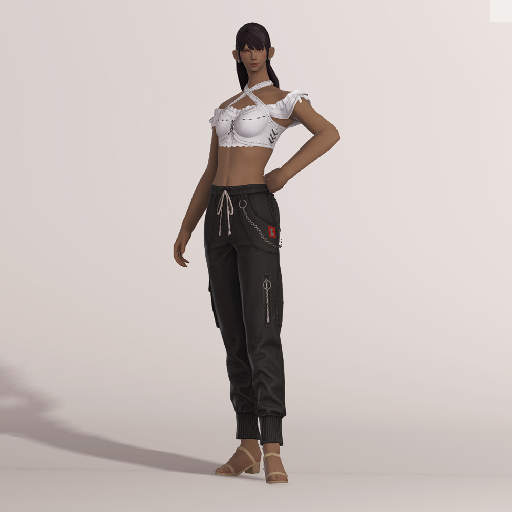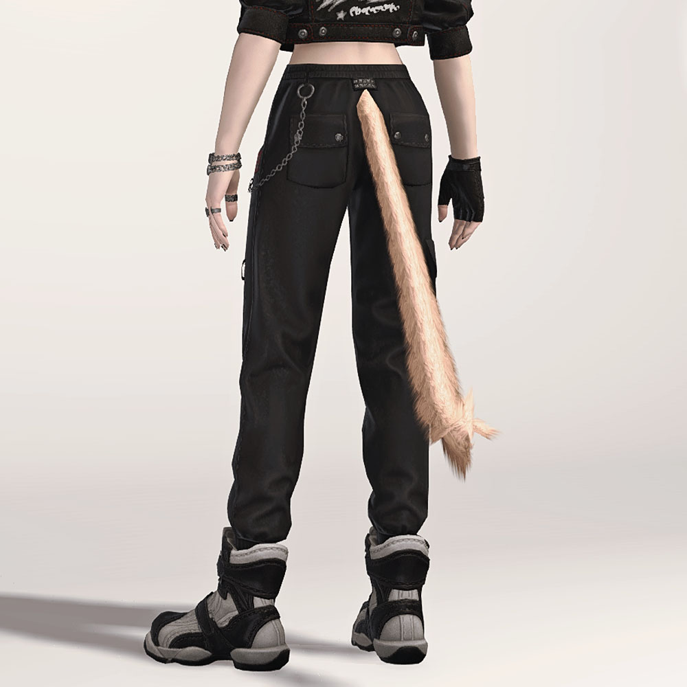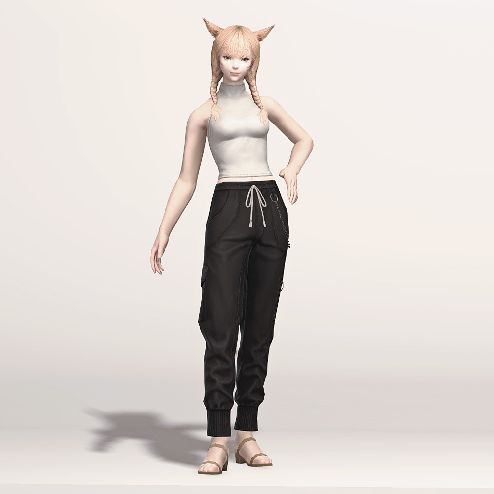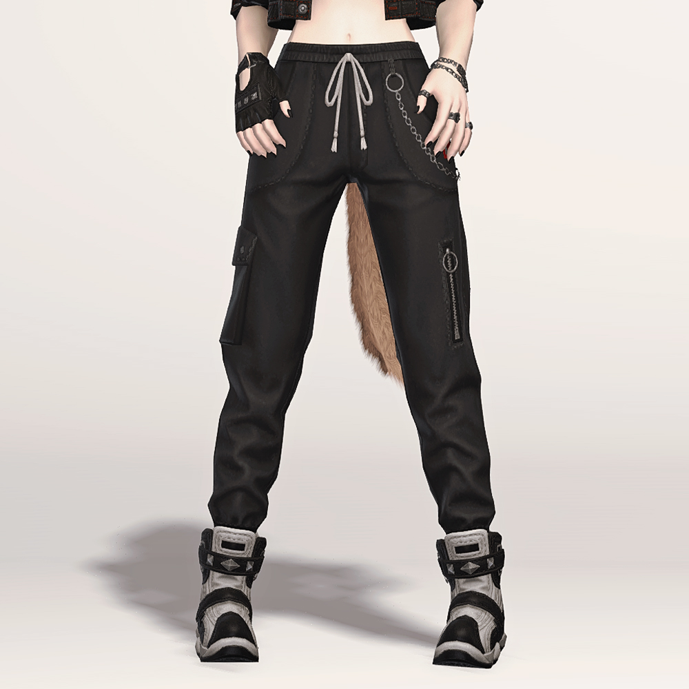 깔끔한 스웨트+카고(주머니있음)+조거(끝에 밴딩으로 잡아줌) 팬츠입니다. 기존에 카고팬츠로 애용하던 녹티스 바지보다 훨씬 깔끔한 인상으로, 핏도 부하지 않고 깔끔하게 나와 예쁜 캐주얼용 파츠로 쓰기 좋습니다. 귀여운 체인과 스터드 장식은 덤!