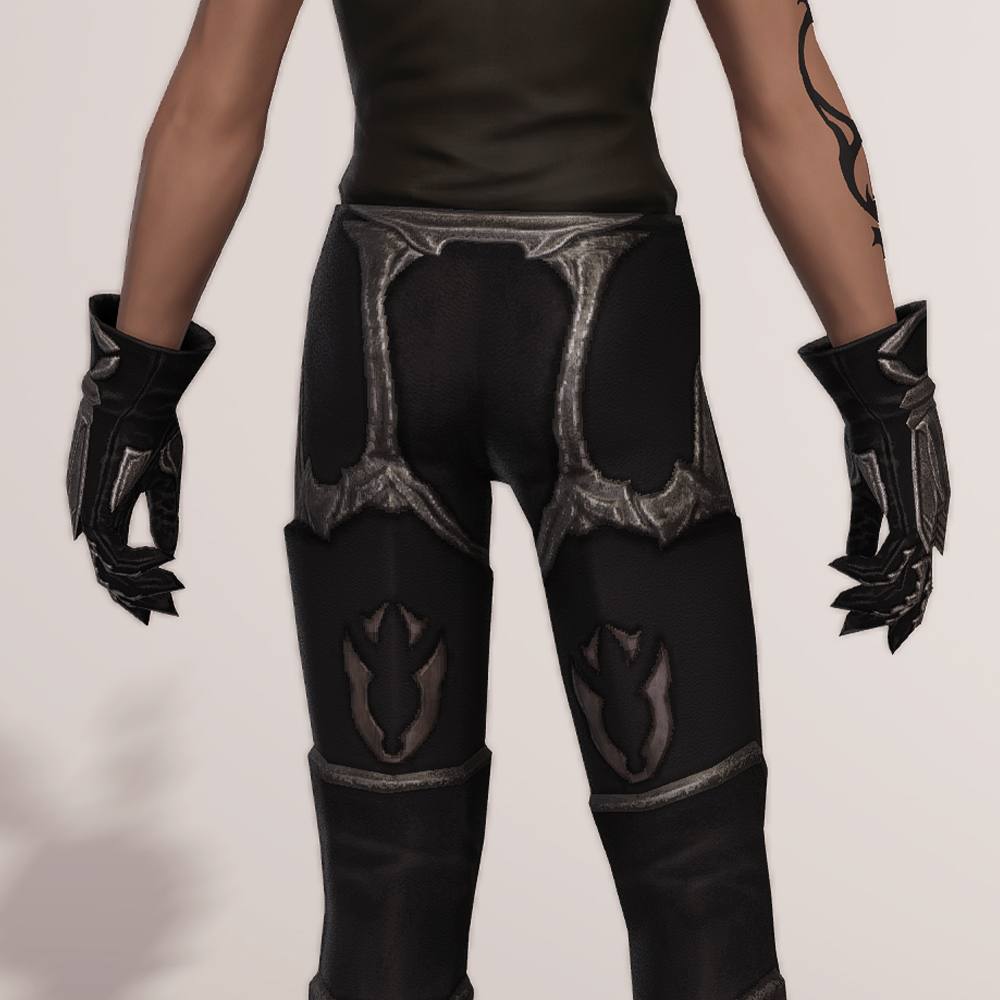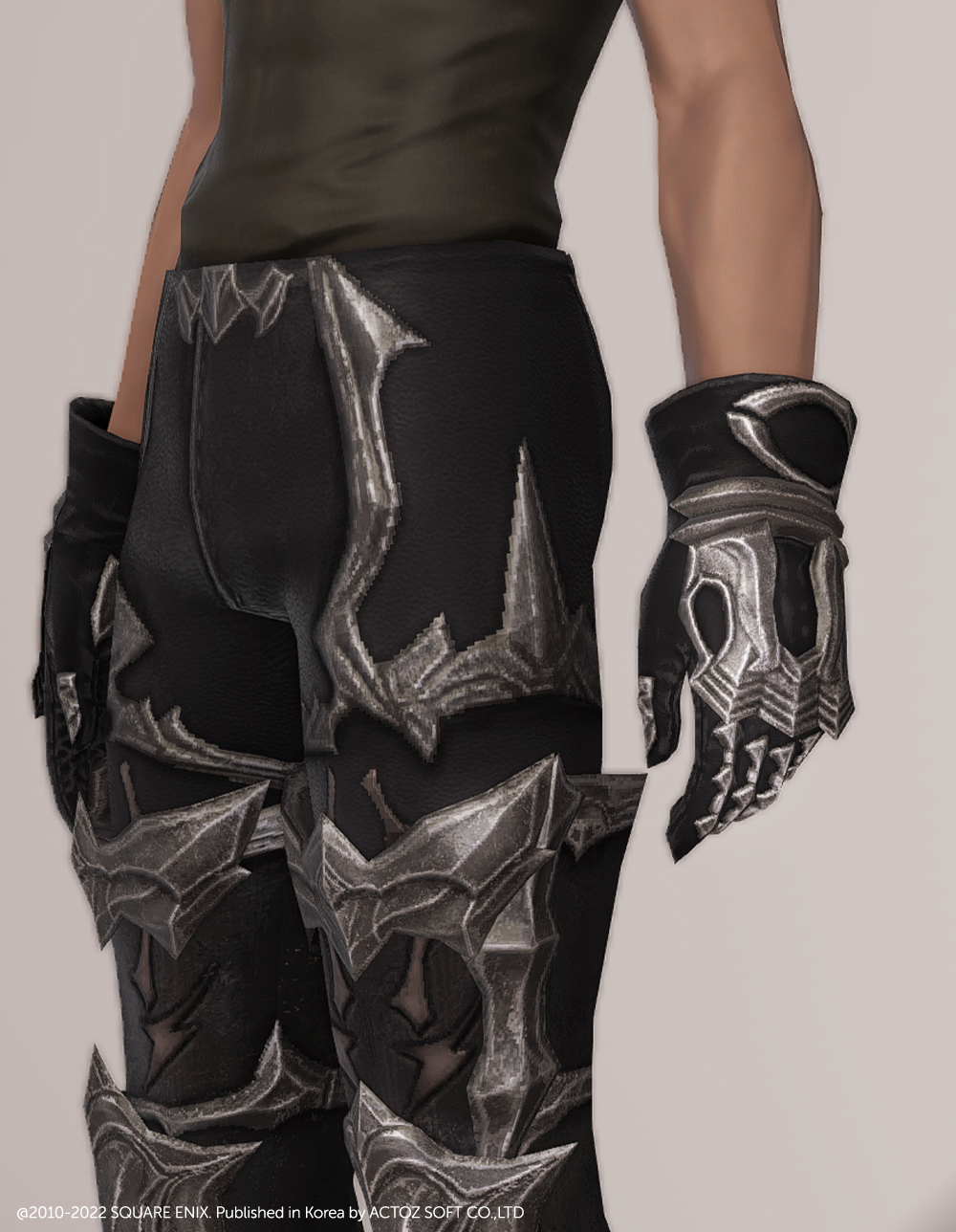 가죽 장갑 위에 손등과 손가락을 보호할 수 있도록 금속을 덧댄 건틀릿 형식의 장갑입니다. 손가락 부위가 마치 인간의 뼈처럼 보이며, 악마의 장갑처럼 특이하게도 손가락 끝이 뾰족합니다.