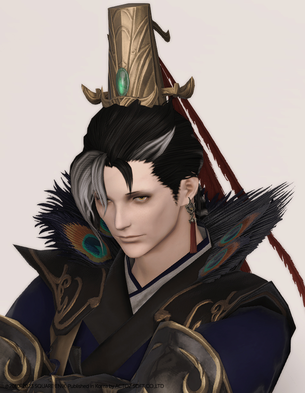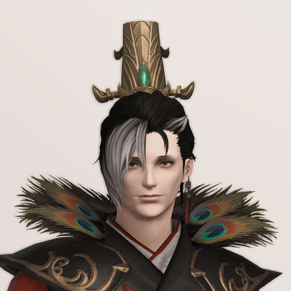 판타지 동양풍의 느낌이 다소 더해진 중국 스타일의 관모입니다. 권위를 상징하는 세로 장식이 다수 새겨져있으며, 중앙의 큰 초록색을 띄는 보석으로 장식한 금색의 관으로 틀어올린 머리를 덮고, 비녀로 고정한 형태입니다. 길게 뒤로 늘어뜨린 깃털이 인상적인데, 보통 관에 깃털을 더한다면 더 높은 관의 느낌을 내려 위로 꽂는 것에 비해 공작의 컨셉을 살리기 위해서 길게 늘어뜨린 듯 합니다.
