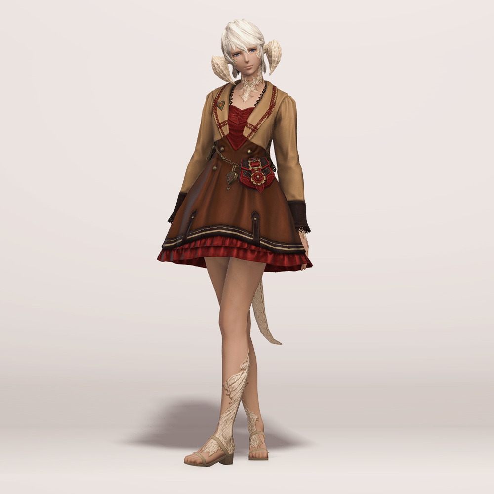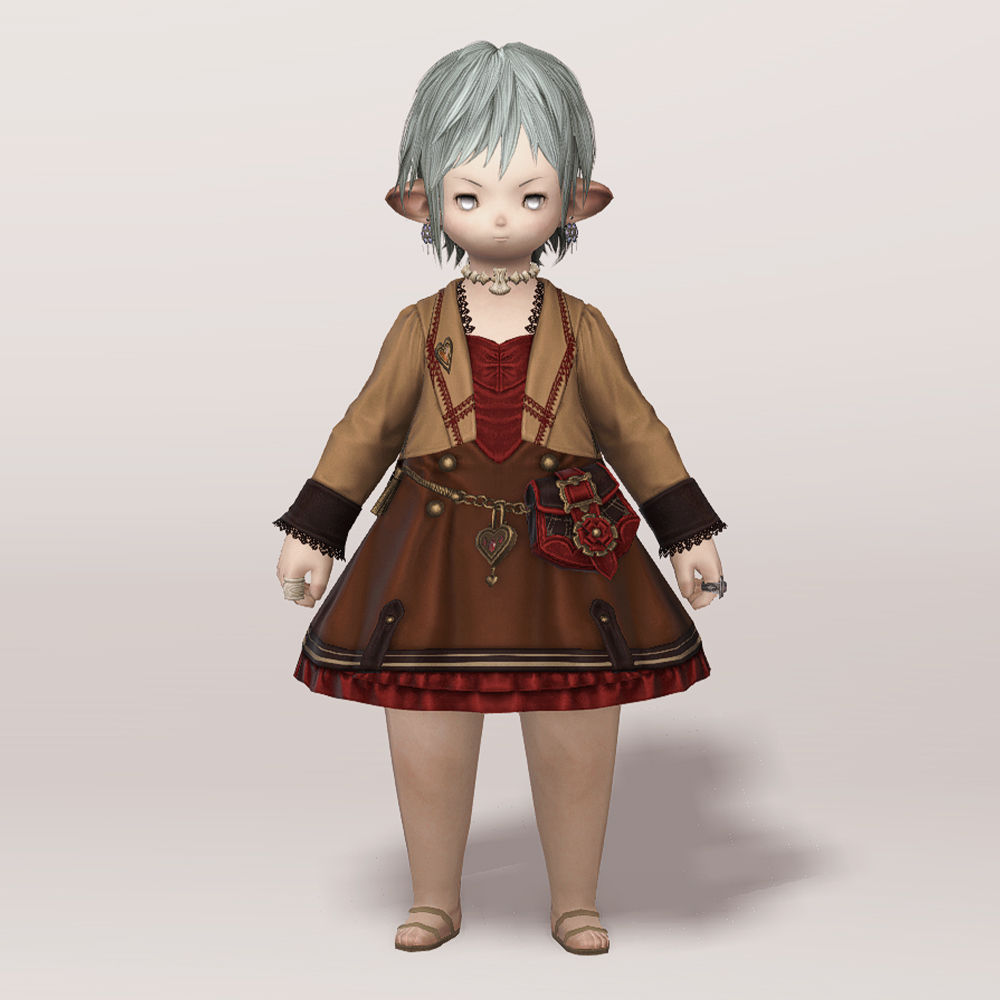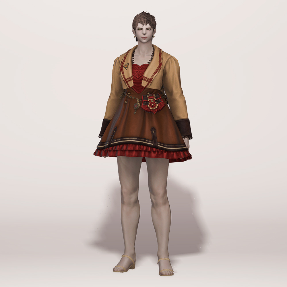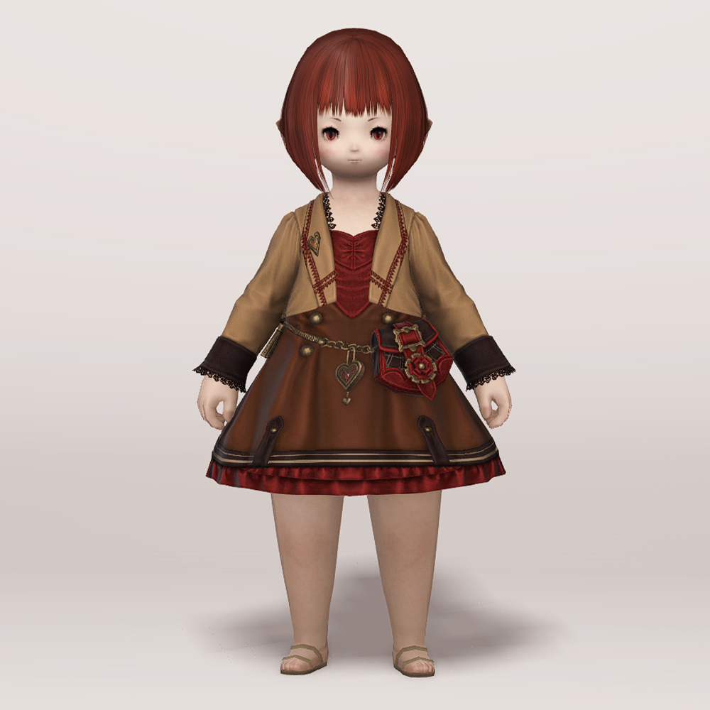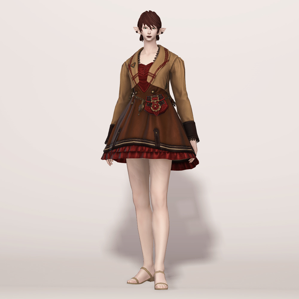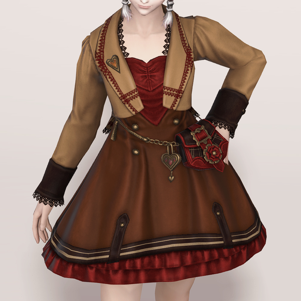 투피스 같기도 한 원피스입니다. 미니드레스에 짧은 재킷을 입은 듯한 디자인으로, 체인으로 연결된 가죽 가방이 귀엽고 발랄한 느낌을 더해줍니다. 군데군데 과하지 않게 빨강 포인트가 있어 분홍이나 빨강 계열의 염색이 잘 어울리며, 다른 계열의 염료도 대체로 자연스러워서 다양한 색상을 염색하여 새 옷처럼 기분전환하기에도 좋습니다. 세트인 모자와 하의, 신발을 함께 입어도 예쁘고 짧은 속바지나 스타킹(ex. 고상한 하의, 신부 들러리 타이츠, 요르하 하의 등). 깔끔한 신발(ex. 명가의 반장화, 퀘인트렐 구두 등) 아이템을 매치해도 좋을 듯합니다.