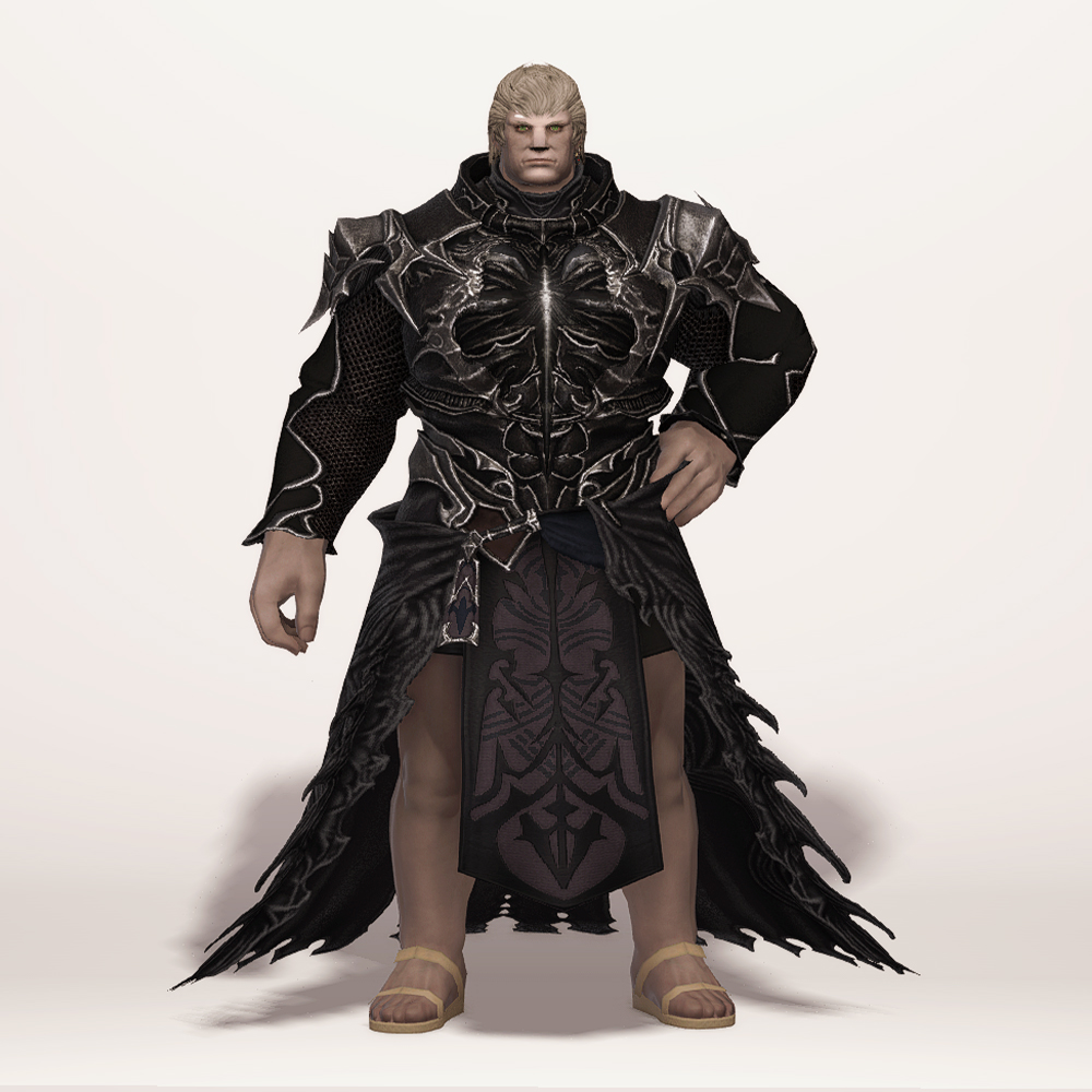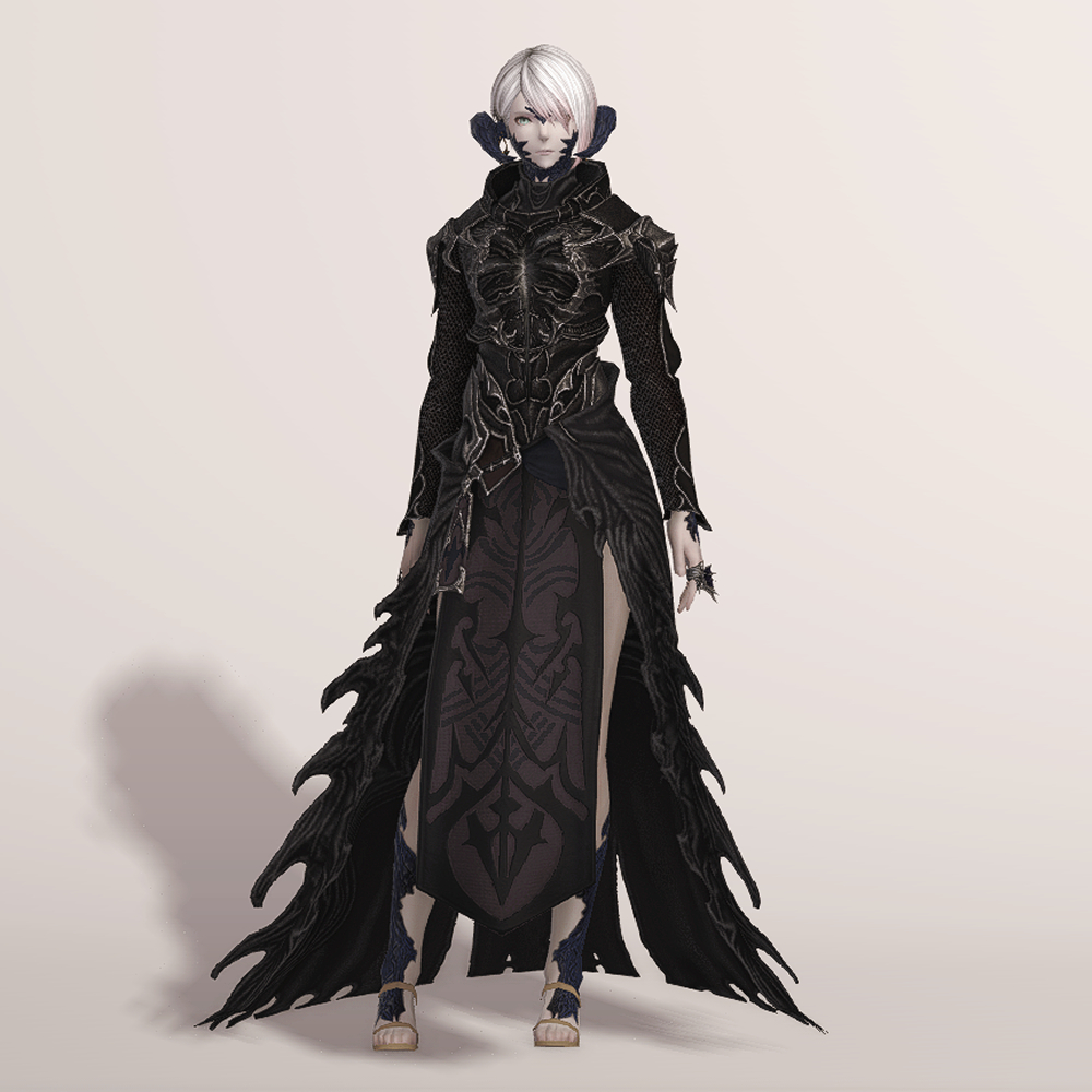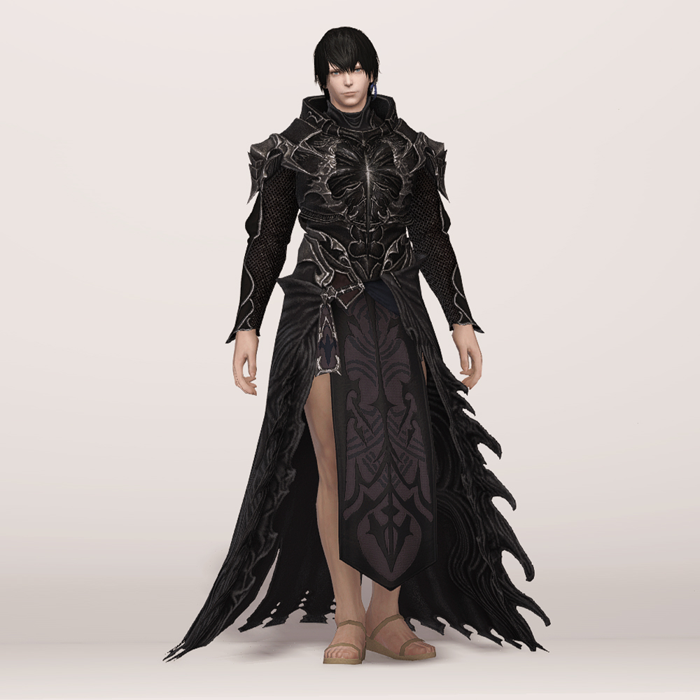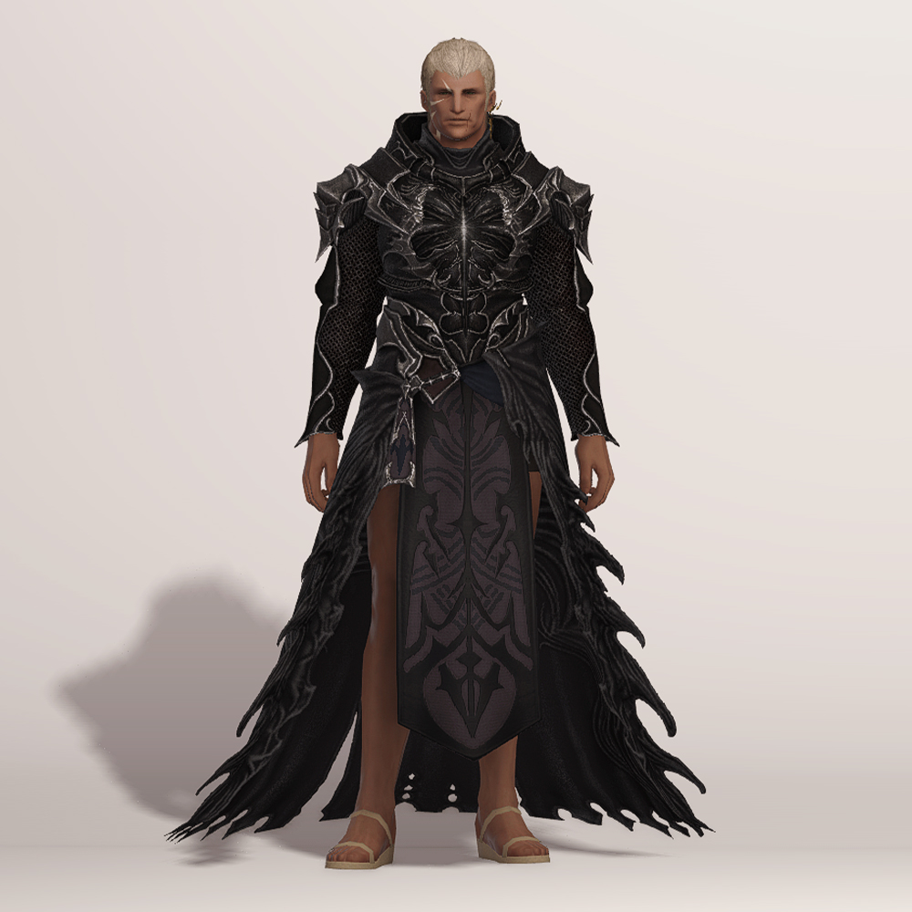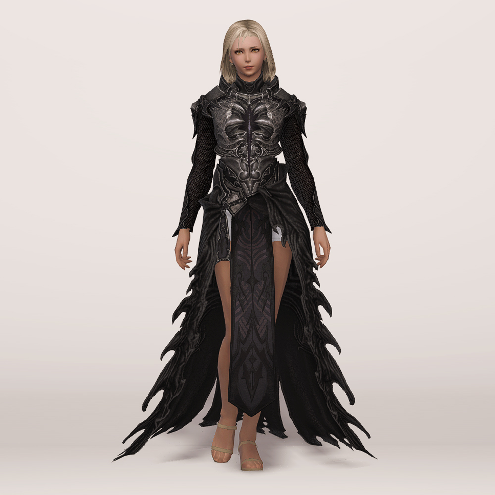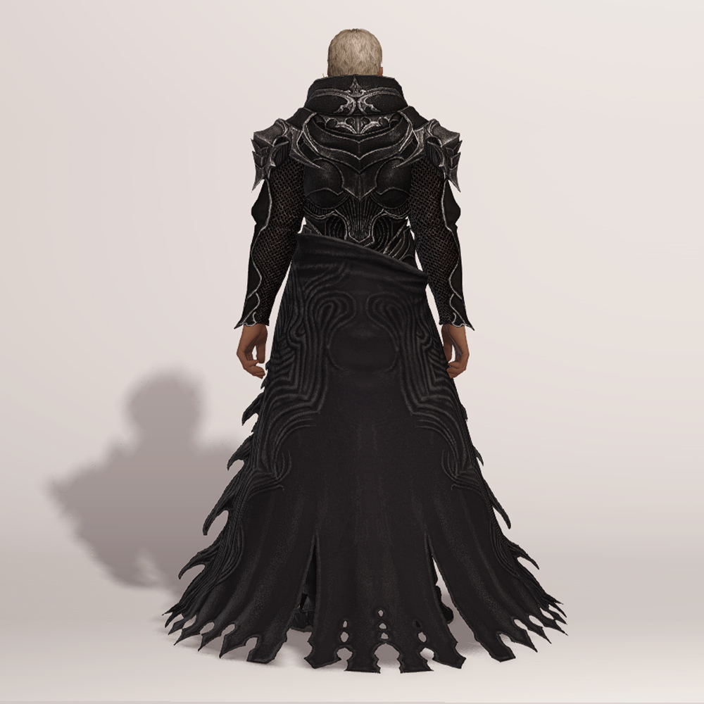 다채로운 무늬가 들어간 경갑옷입니다. 상의 갑옷 무늬는 마치 인간의 근육과 갈비뼈처럼 보인다는 느낌이 들 정도로 정교하게 제작되었으며, 팔 안쪽은 사슬 갑옷으로 이루어져 있어 판금 갑옷보다 움직임이 편합니다. 허리춤에 매달아 바닥까지 길게 늘어뜨린 천은 앞이 짧고 뒤가 길어 하이로우 스커트처럼 보이기도 합니다. 조물원 수호자 외투와 동일한 디자인이지만 앞에 달려 있는 천의 크기가 미묘하게 차이가 납니다. 지하매복자 학살자 투구와 매치하면 꽤 잘 어울려 추천드립니다.