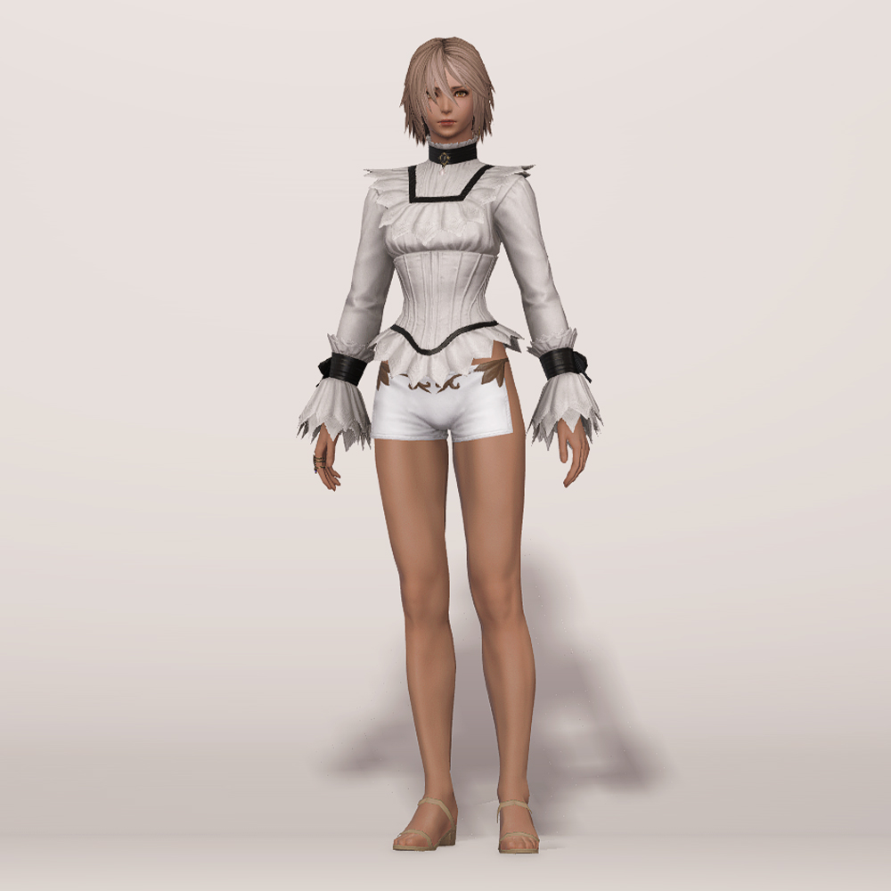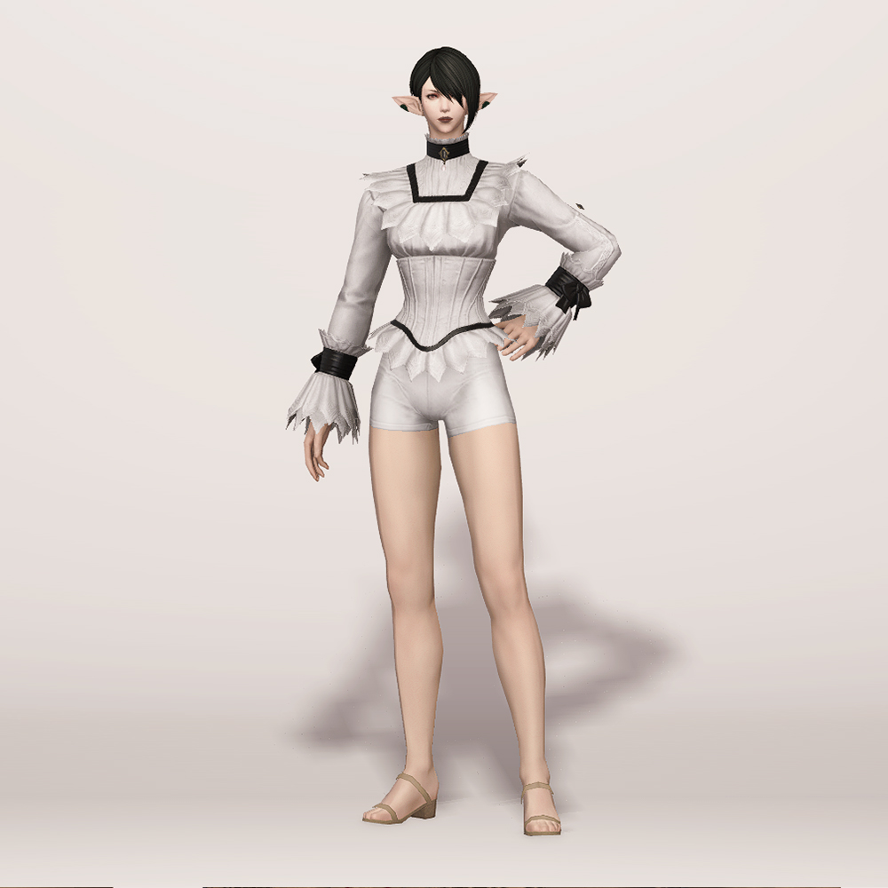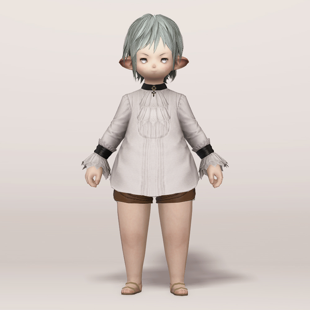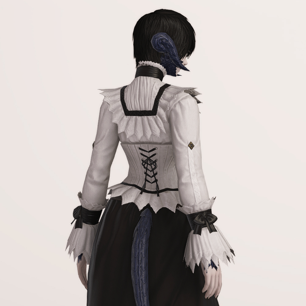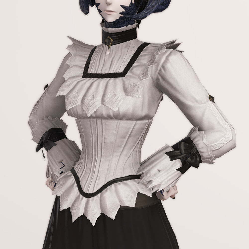 곳곳에 자수 프릴 장식으로 고급스러움을 더한 겨울용 모직 셔츠입니다. 목 부분의 검은색 장식 덕분에 초커를 착용한 듯한 인상을 줍니다. 목을 완전히 감싸는 디자인으로 고전적이고 우아한 느낌이 강하며, 귀족적인 분위기를 연출하기 좋습니다. 여성의 경우 롱스커트(ex. 긴치마, 봄처녀 치마, 산악 소녀 긴치마)와 함께 적절히 염색해 매치하면 한 벌의 드레스처럼 보이기도 합니다.