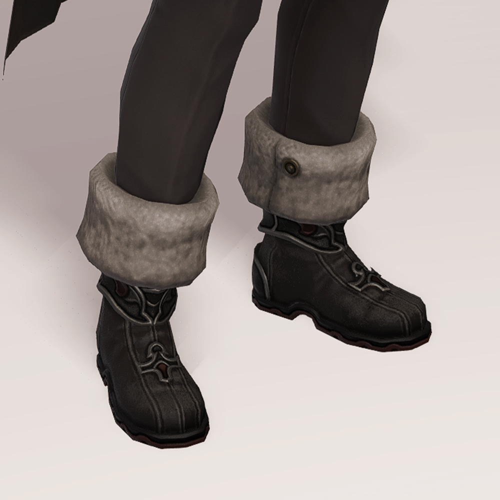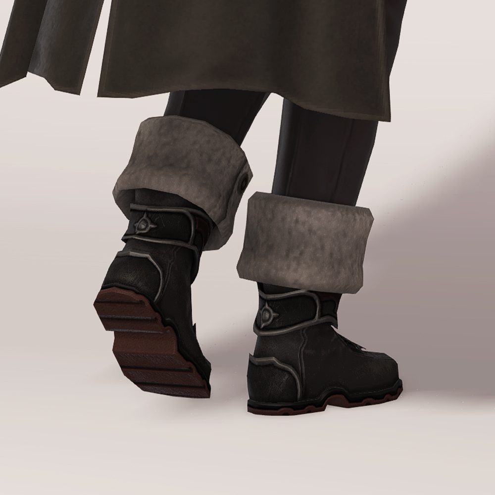 도톰한 털장식이 달려 있으면서도 어그부츠에 비해 깔끔하고 절도 있는 디자인이 특징인 가죽 앵클부츠입니다. 체온을 빼앗기기 쉬운 발목에 퍼를 둘러 방한 효과를 높인 점은 역시 추운 갈레말 제국의 군화답습니다. 발목 안쪽에 장식된 금속 단추 디테일이 부츠의 단정함과 맵시를 살려주며, 앞코에서부터 이어지는 세로선 또한 부츠를 한결 슬림해 보이게 만들어줍니다. 톤다운된 퍼와 장식 컬러에 맞추어 차분한 겨울 룩으로 코디하기 좋습니다.