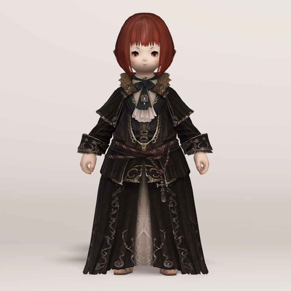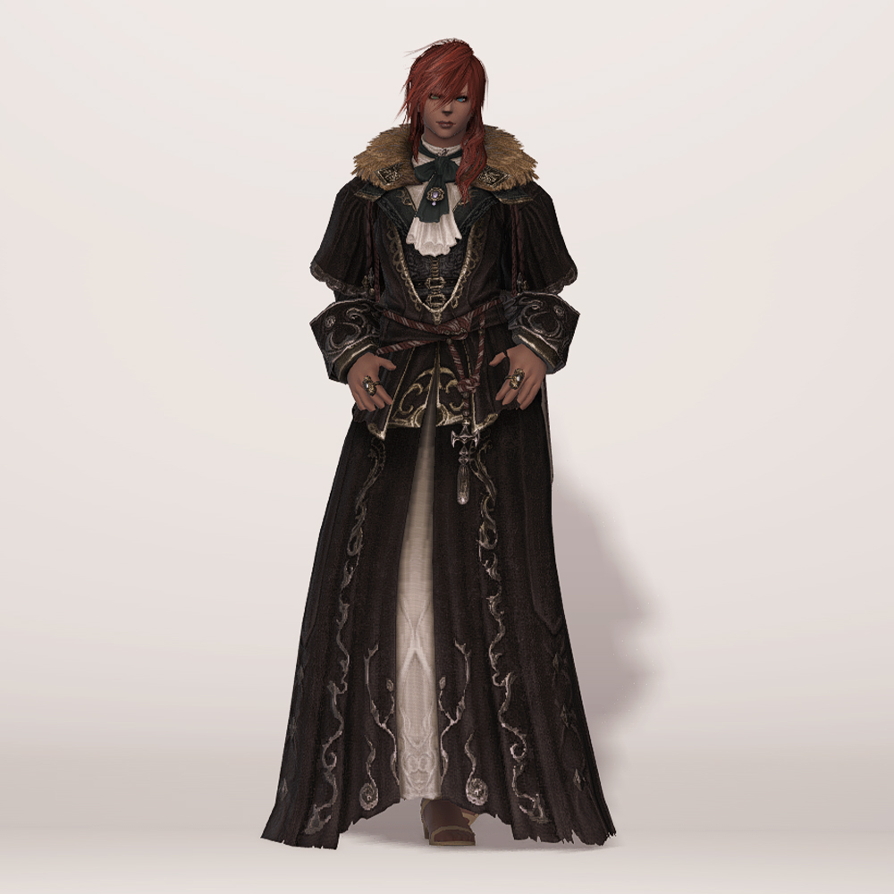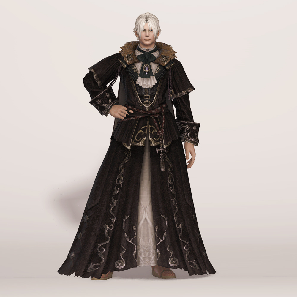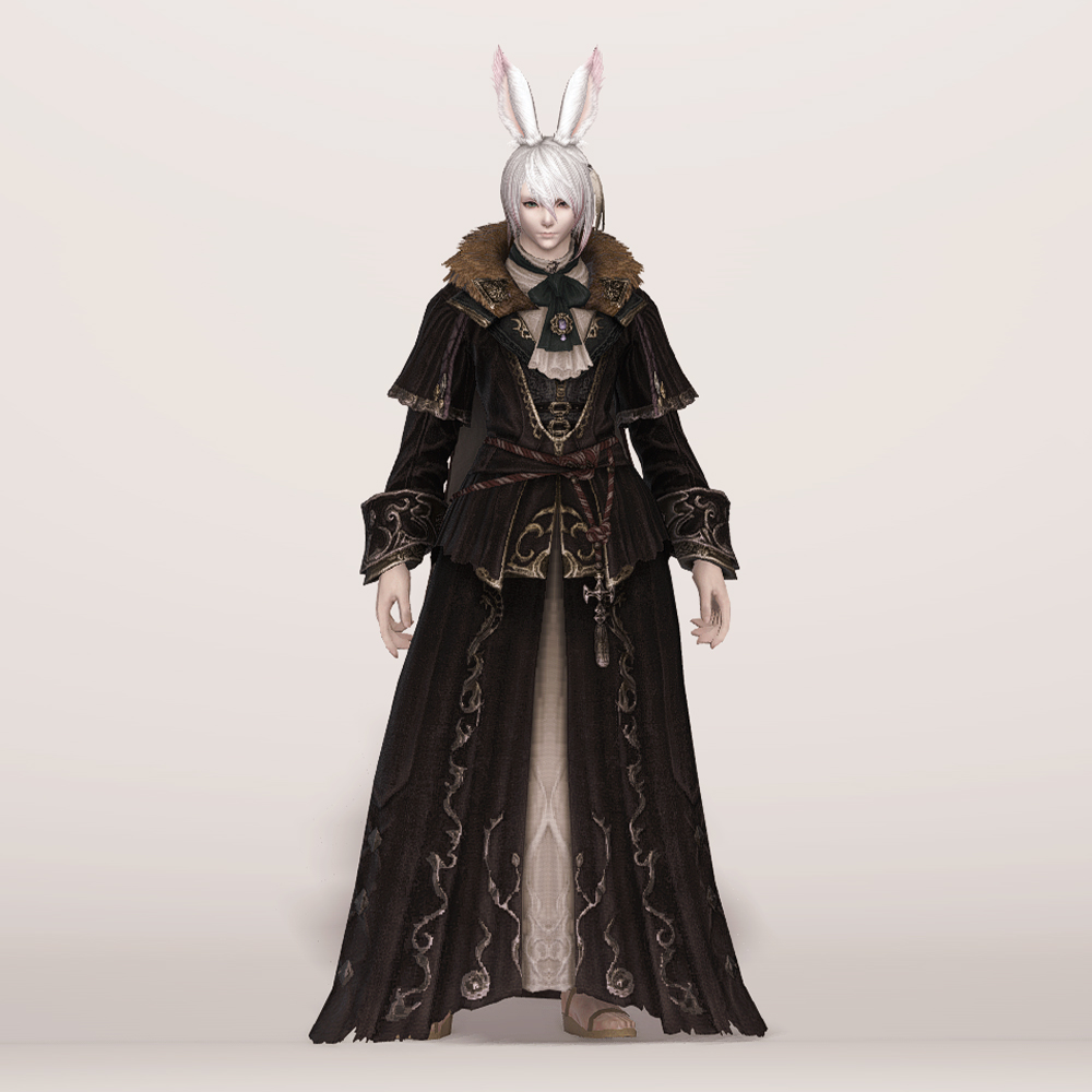 실크 리본 타이와 크라바트로 클래식한 멋을 살린 벨벳 재질의 로브입니다. 컬러와 소재, 옷깃의 거친 퍼 장식 등이 화려하면서도 묵직한 느낌을 주며, 전체적인 무게감이나 분위기는 이슈가르드 귀족 의상과 비슷한 인상을 남기기도 합니다. 짙은 색상 염색이 잘 어울리는 편이며 함께 매치하는 아이템이 무엇이냐에 따라 상반된 이미지를 연출할 수 있습니다. 리본 타이와 셔츠에 주목한다면 화려한 실크햇을, 녹슨 듯 어둑한 톤과 거칠게 마감된 로브 자락에 주목한다면 지하매복자 두건류의 아이템을 매치해도 자연스럽습니다.