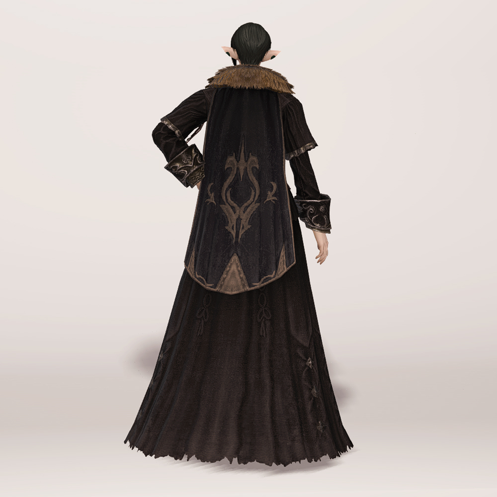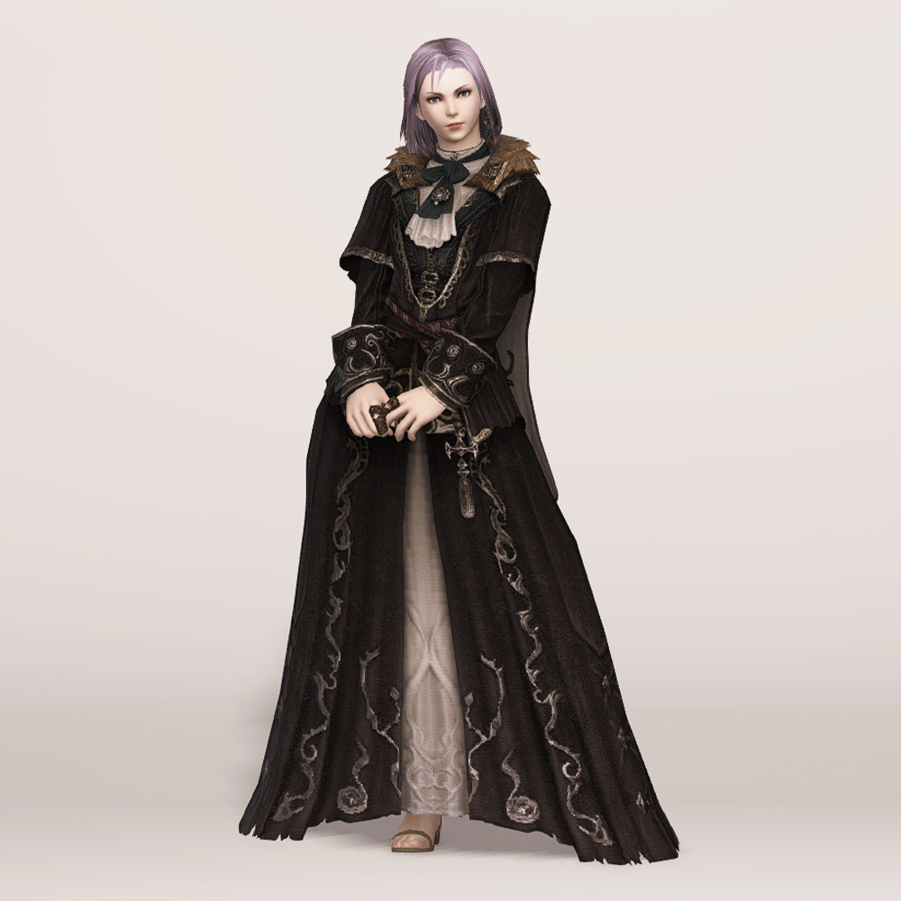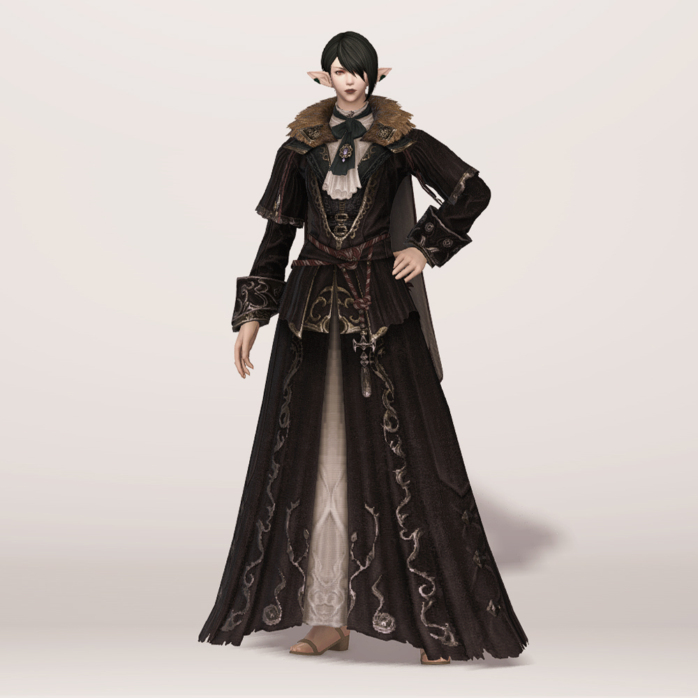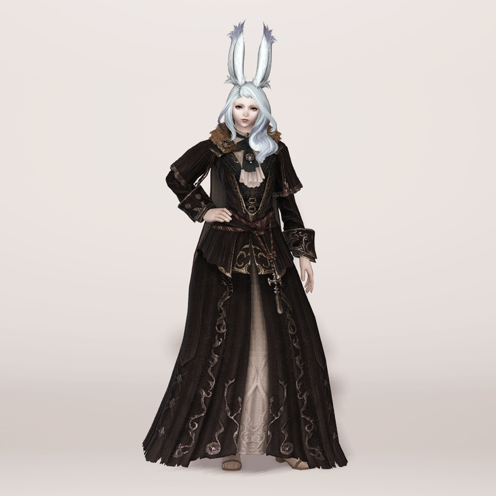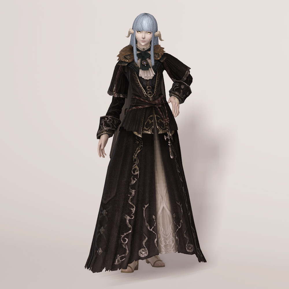 실크 리본 타이와 크라바트로 클래식한 멋을 살린 벨벳 재질의 로브입니다. 컬러와 소재, 옷깃의 거친 퍼 장식 등이 화려하면서도 묵직한 느낌을 주며, 전체적인 무게감이나 분위기는 이슈가르드 귀족 의상과 비슷한 인상을 남기기도 합니다. 짙은 색상 염색이 잘 어울리는 편이며 함께 매치하는 아이템이 무엇이냐에 따라 상반된 이미지를 연출할 수 있습니다. 리본 타이와 셔츠에 주목한다면 화려한 실크햇을, 녹슨 듯 어둑한 톤과 거칠게 마감된 로브 자락에 주목한다면 지하매복자 두건류의 아이템을 매치해도 자연스럽습니다.