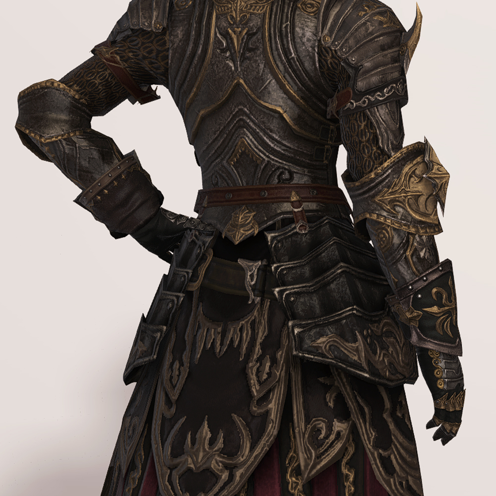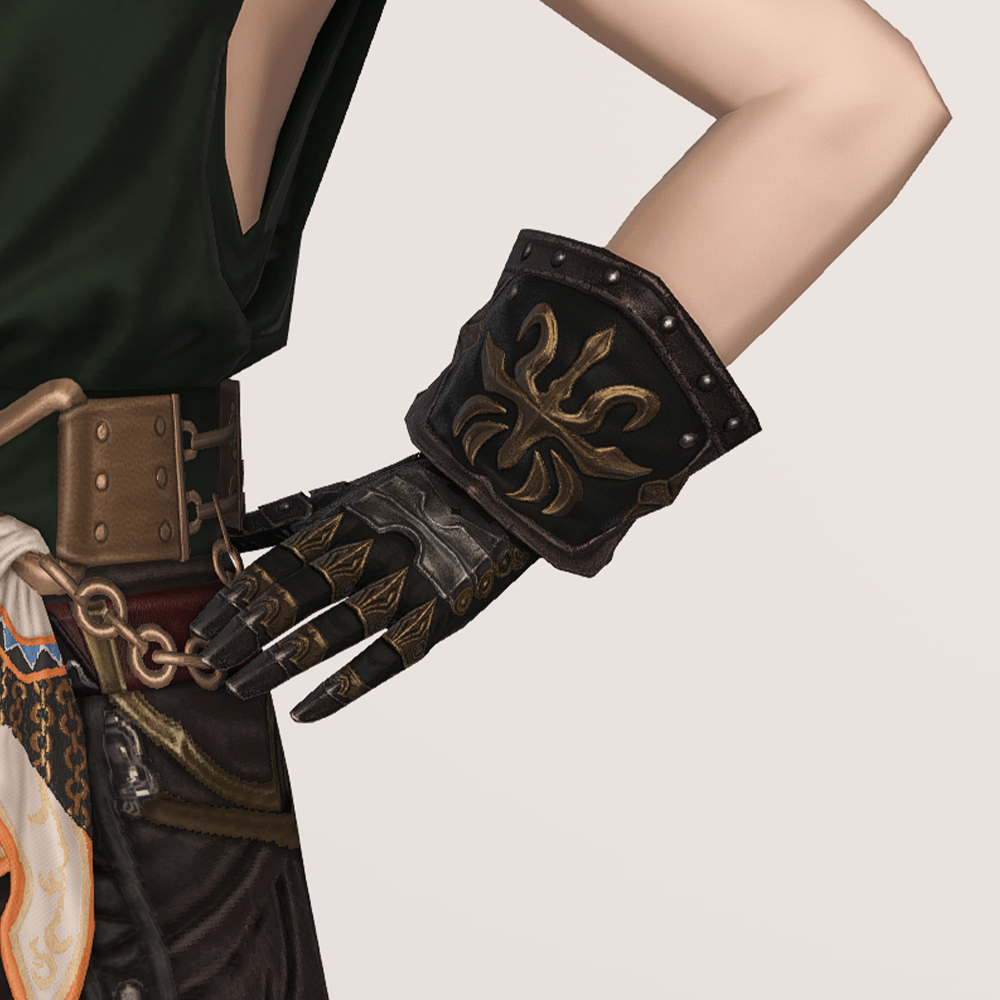 가죽 건틀릿 위에 뱀브레이스를 짧게 덧대어 손목과 손등, 손가락을 모두 보호할 수 있도록 제작된 장갑입니다. 움직임이 편하도록 관절 부위가 모두 끊어져 있으며, 손목 바깥쪽에 새겨진 금속 문양 덕분에 투박하다, 밋밋하다는 느낌보다는 고급스럽다는 느낌이 좀 더 강합니다. 달사절단 수호자 재킷, 연옥 수호자 전투흉갑 등과 매치하면 꽤나 잘 어울립니다.